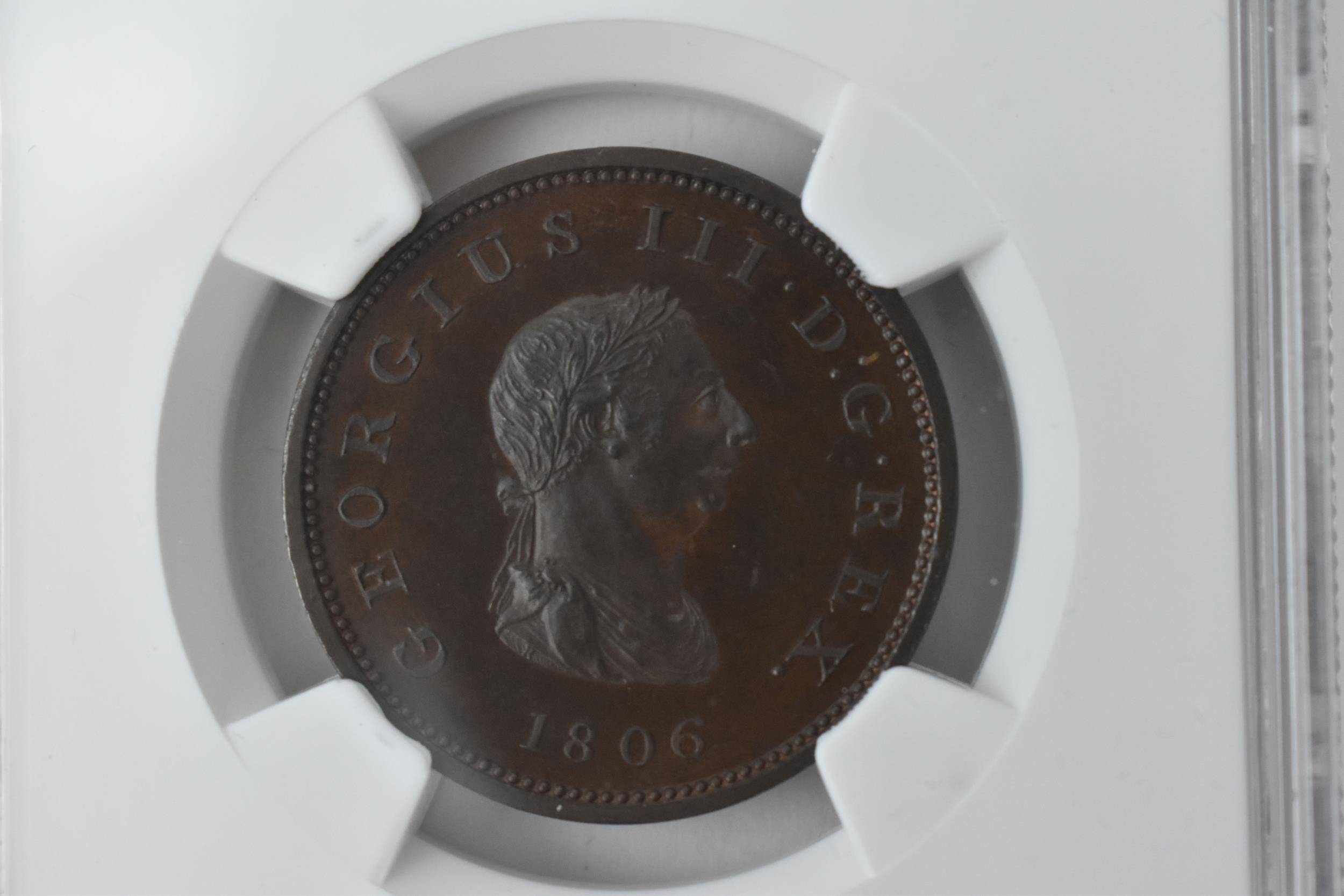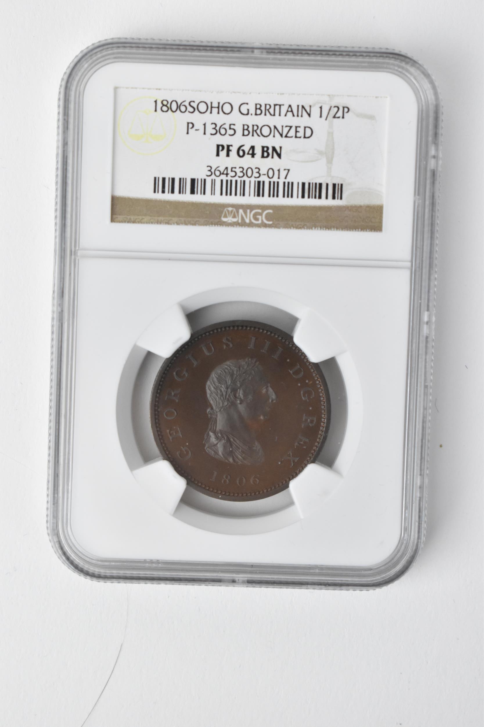 United Kingdom - George III (1760-1820) Half Penny, 4th issue, dated 1806 (SOHO), short hair, laureate and draped bust, King George III, right, GEORGIUS.III.D:G.REX./. seated Britannia, left, BRITANNIA SOHO, in secure plastic holder, graded NGC PF64 BN, certification number 3645303-017