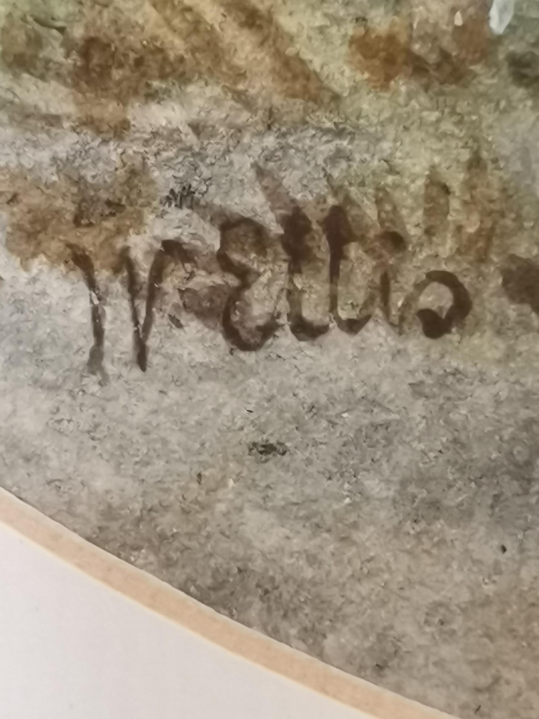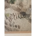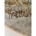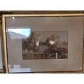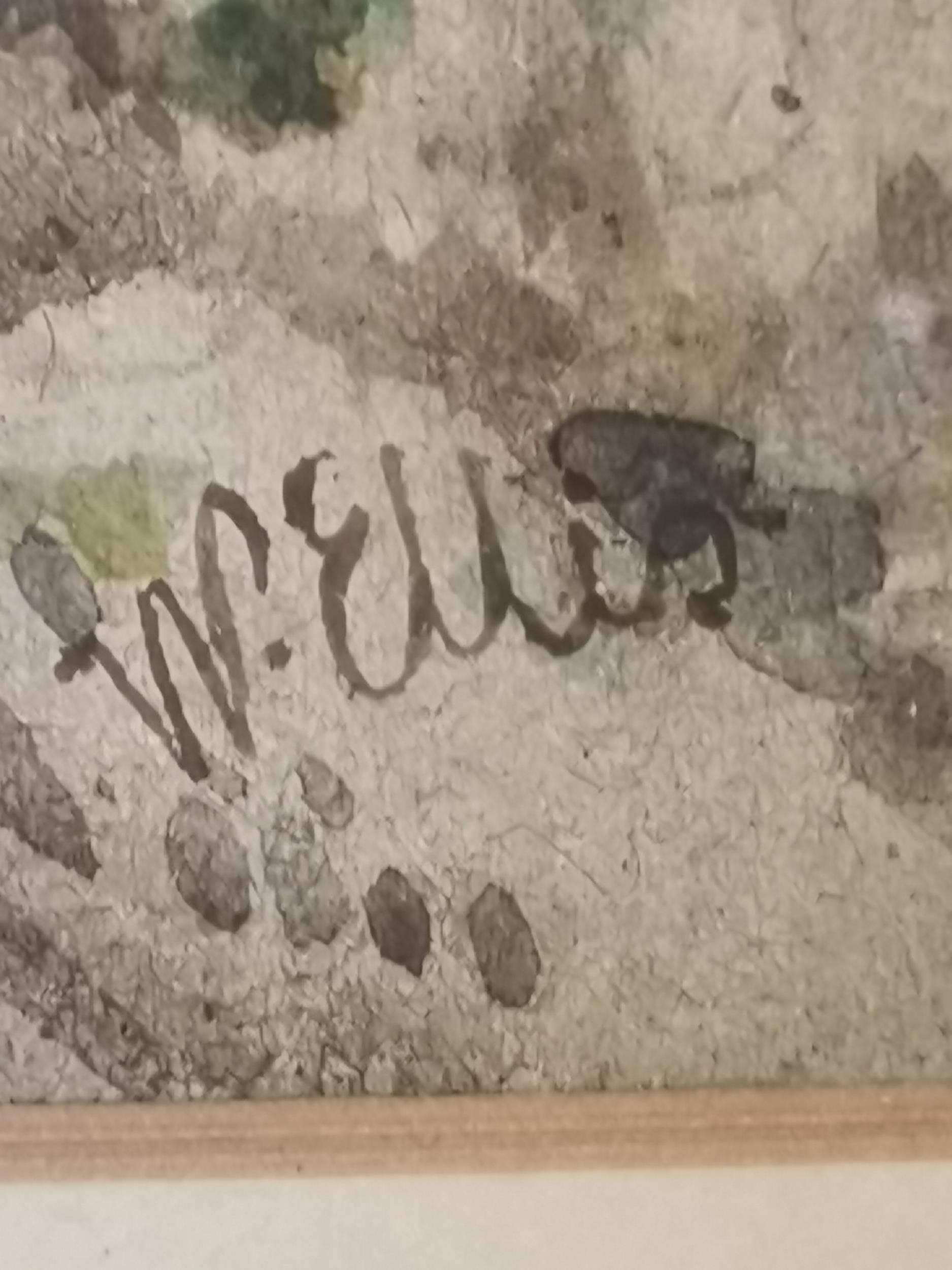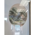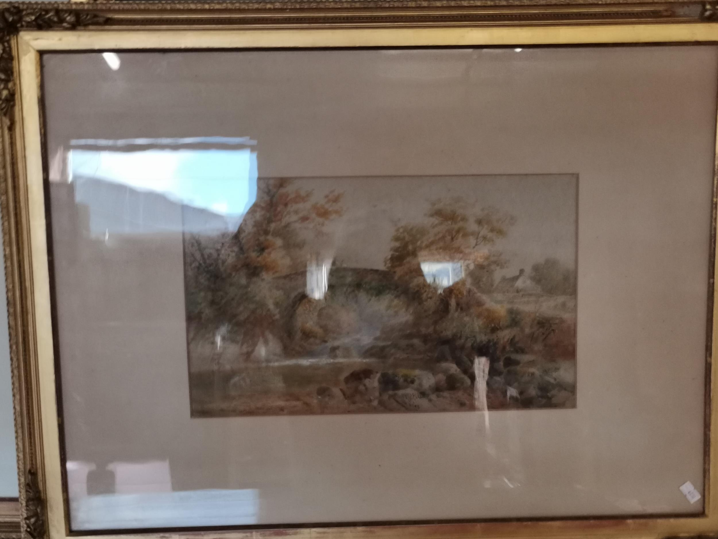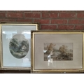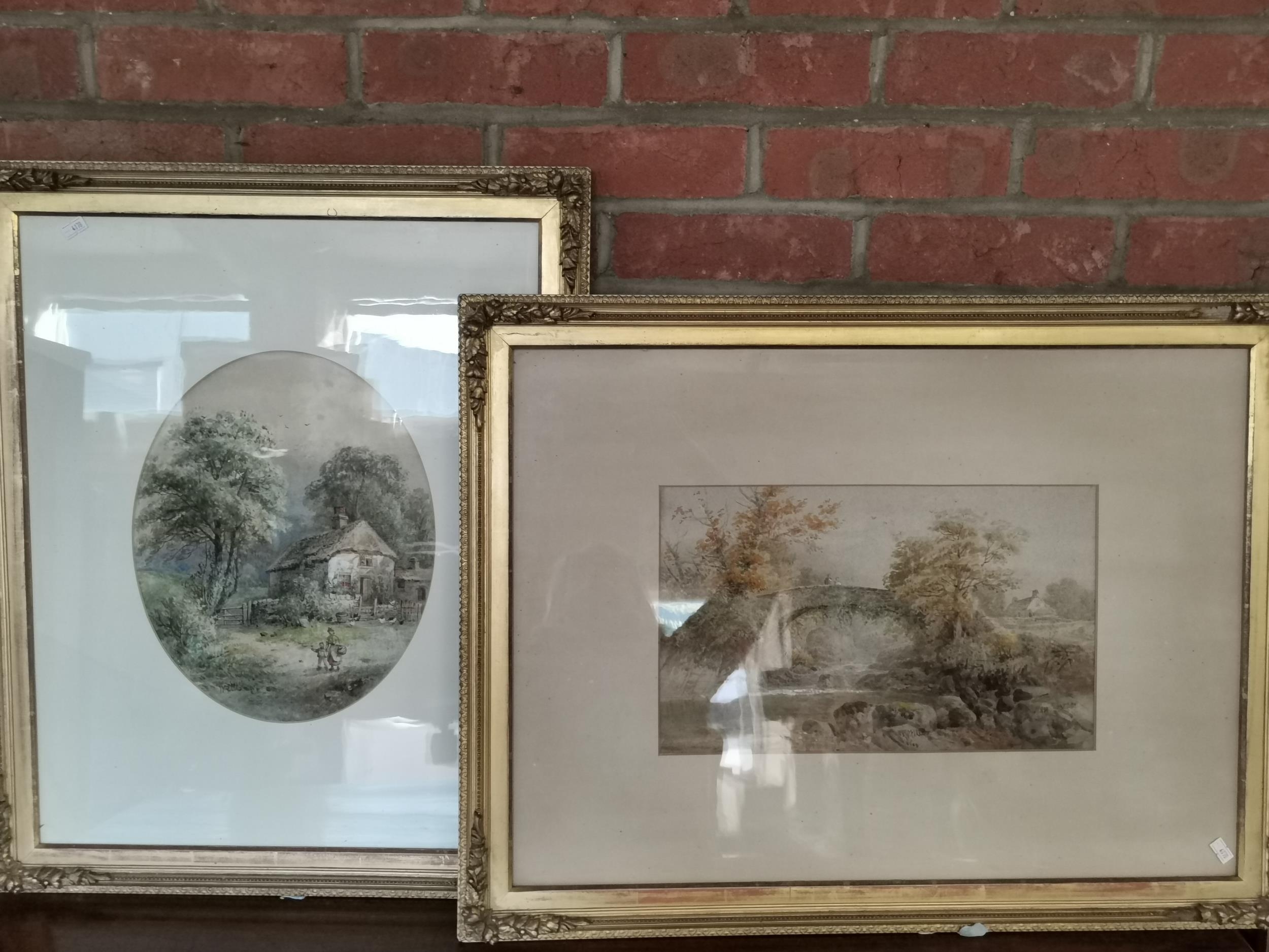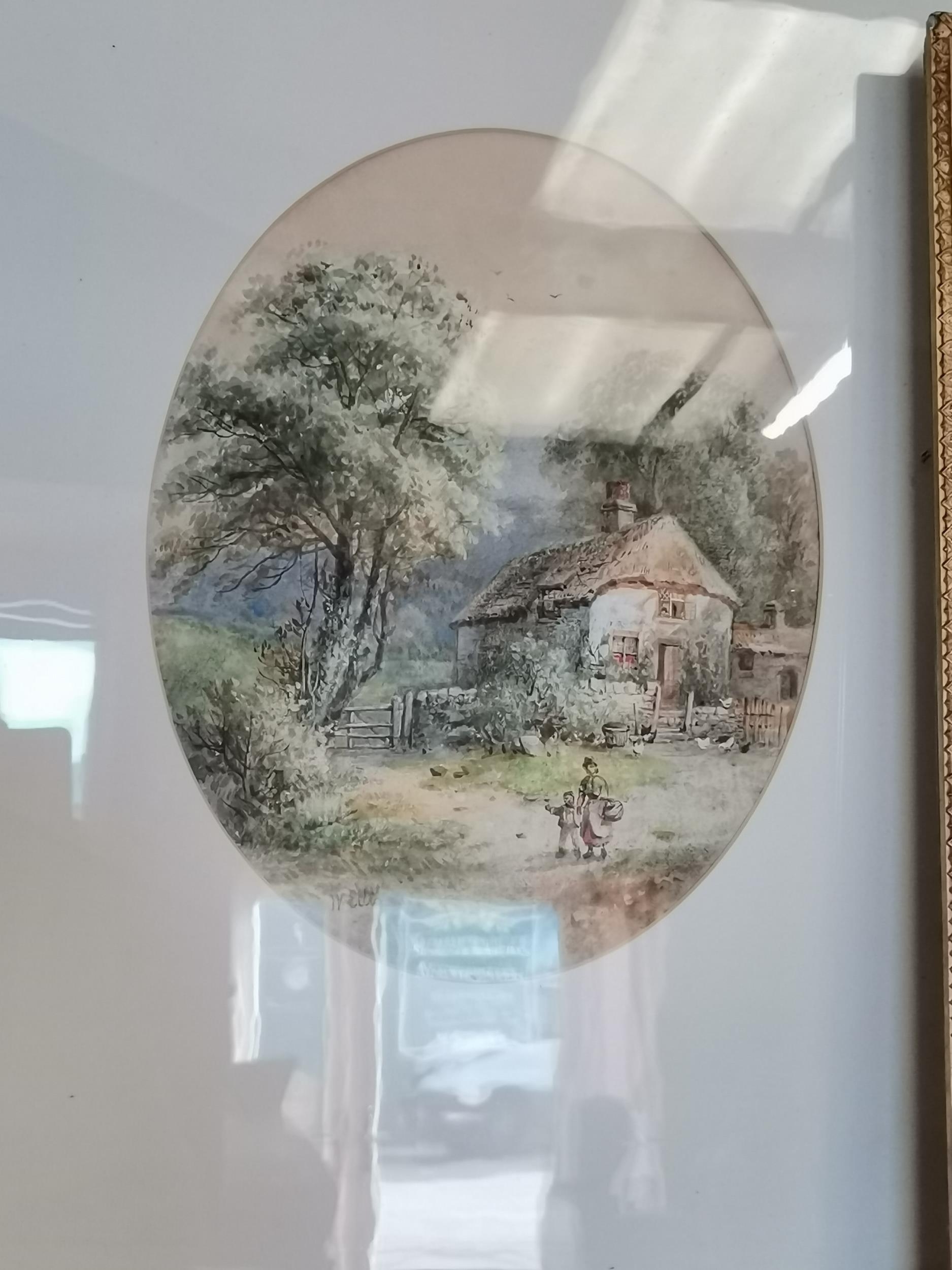 Two 19th Century landscapes, Figures before a thatched cottage, and Figures on a stone bridge, watercolours, both signed W. Ellis, the first with oval mount, framed. (2) First 34cm by 27cm, second 23cm by 38.5cm plus a Victorian floral cross pastel