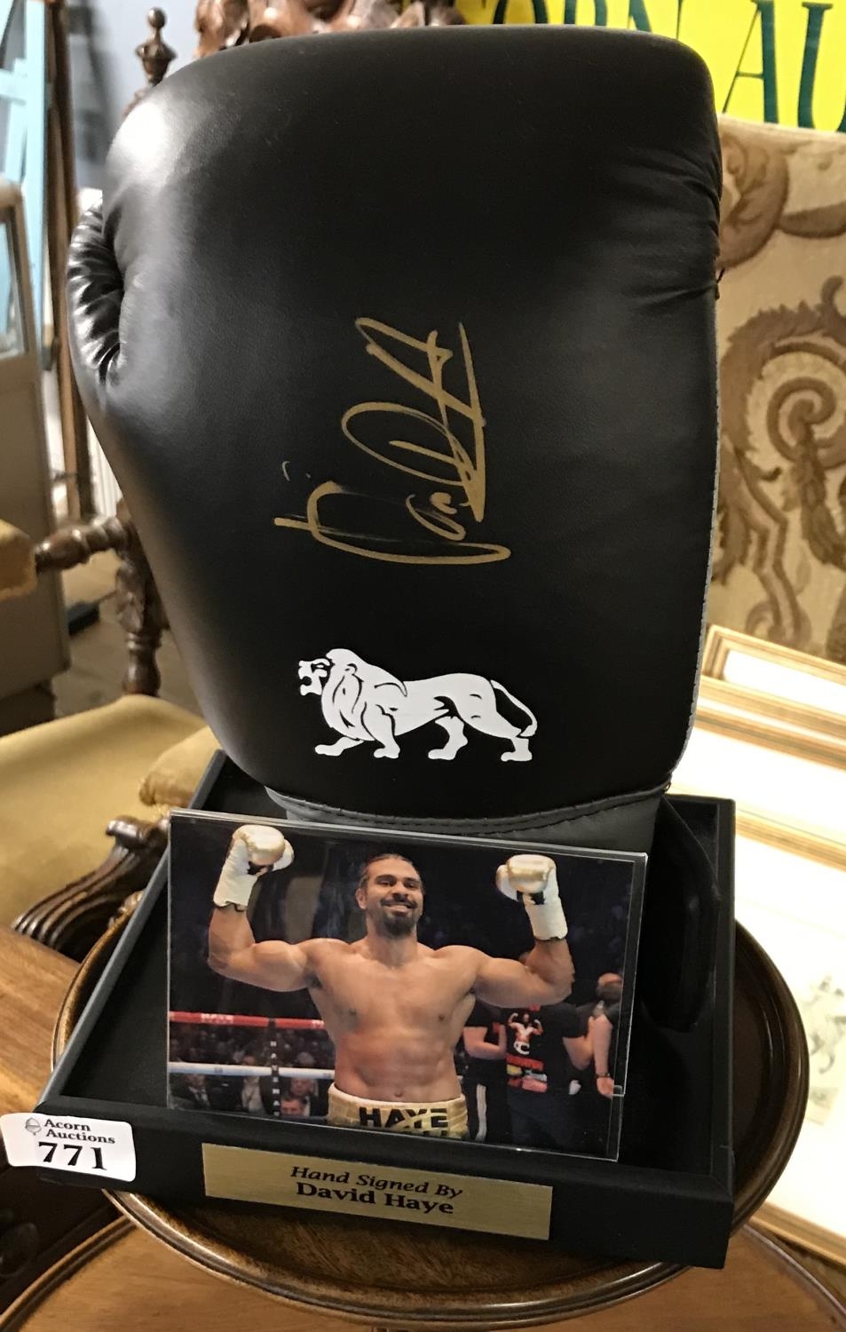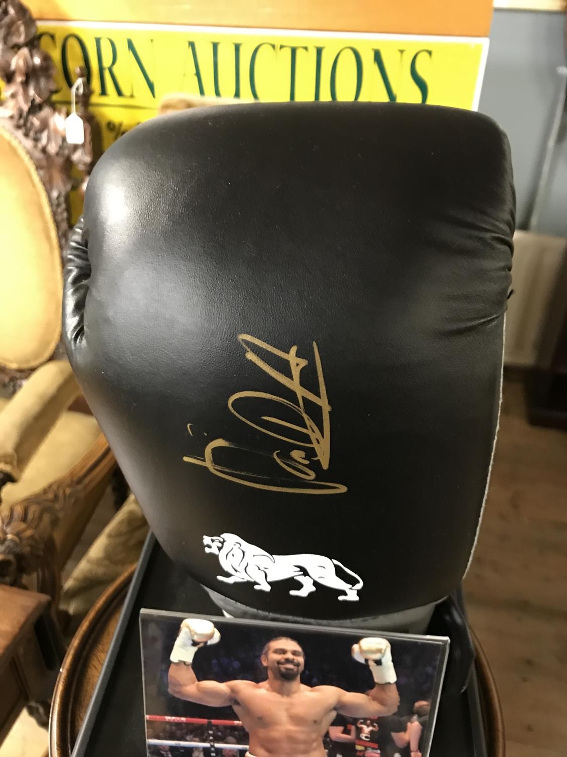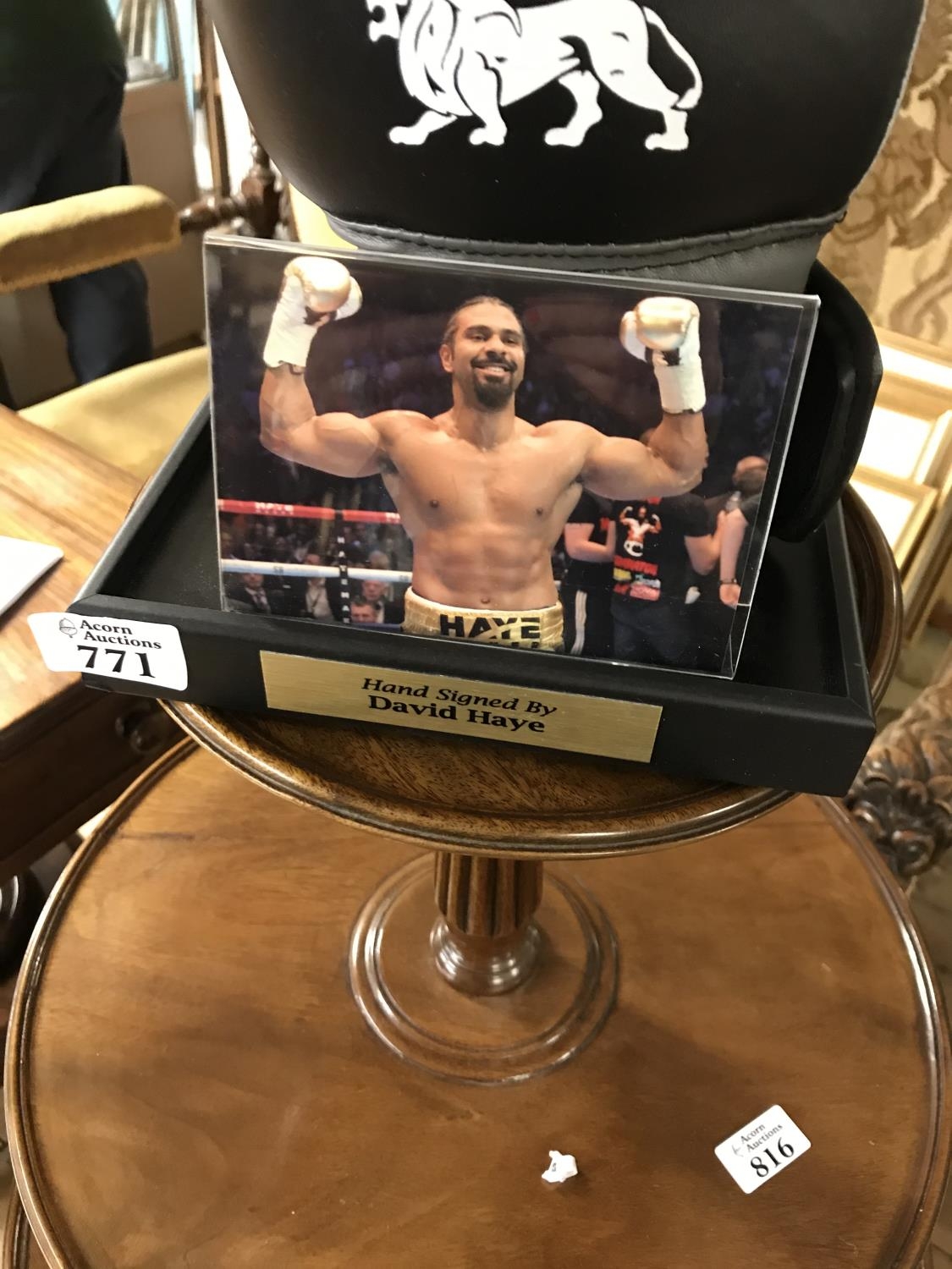 Autographed David Haye Lonsdale boxing glove on display with cert