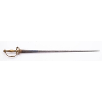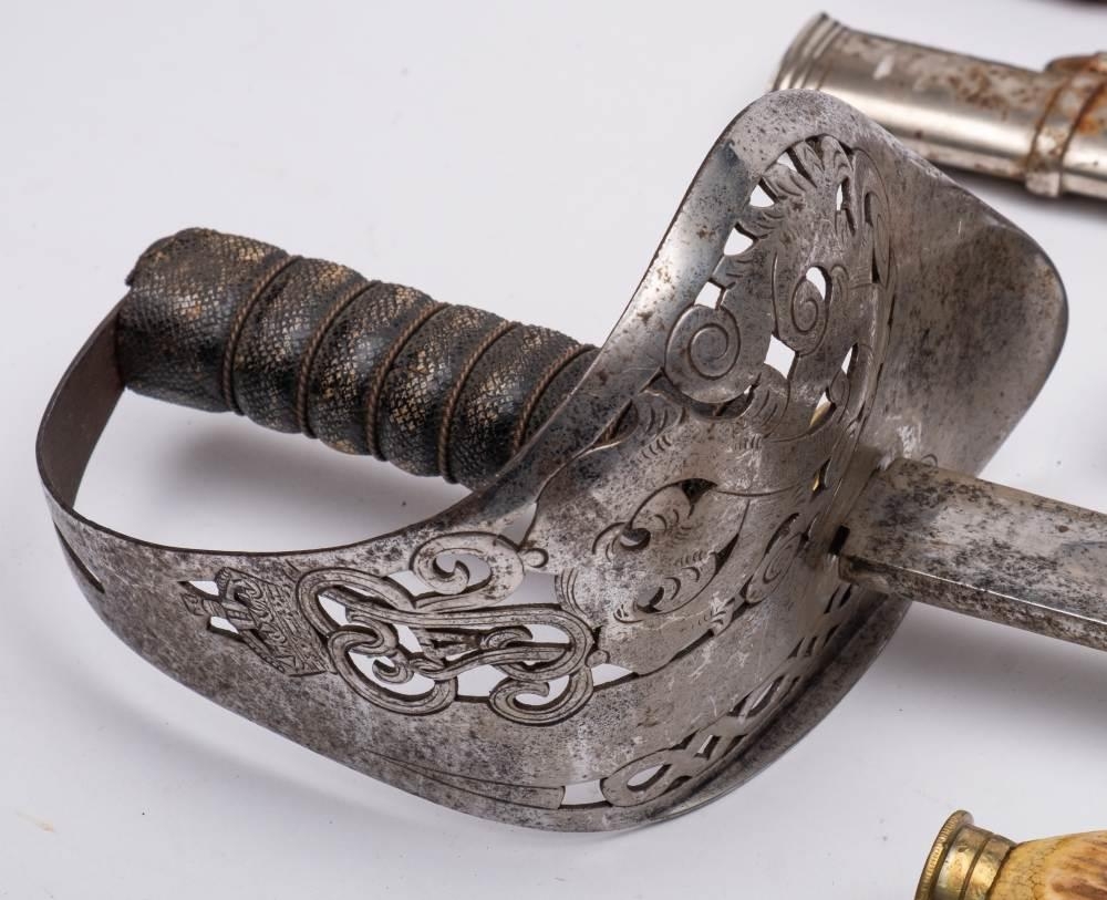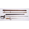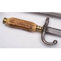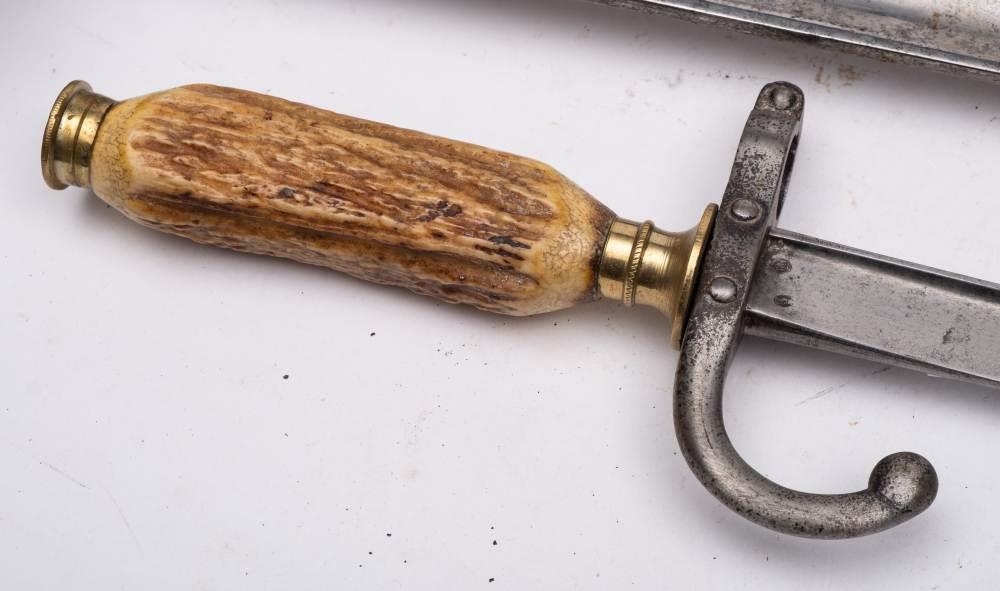 A French chassepot bayonet blade: fitted with an incorrect antler handle, a damaged British infantry officers sword and two scabbards.