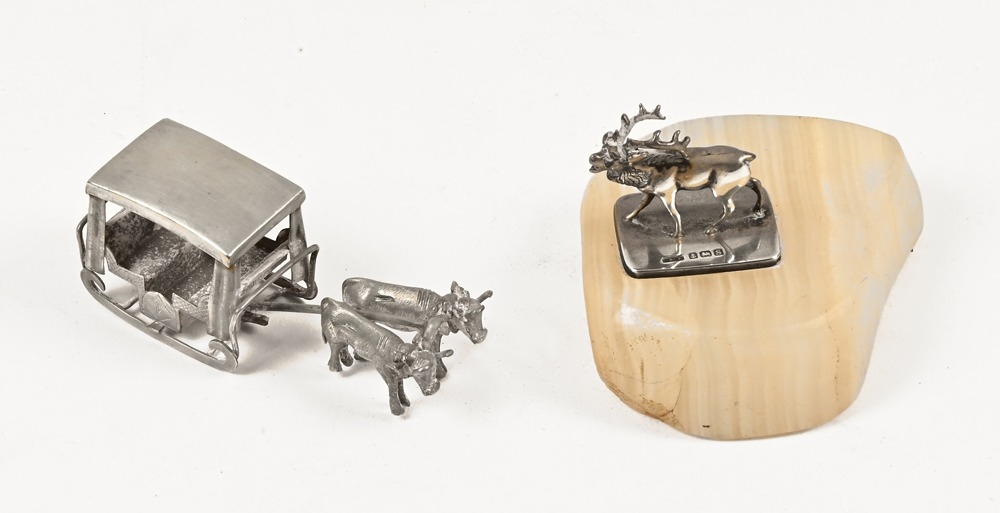 A miniature hallmarked silver stag, together with an Indian silver coloured Bullock cart. Cart overall length 6.5 cm.