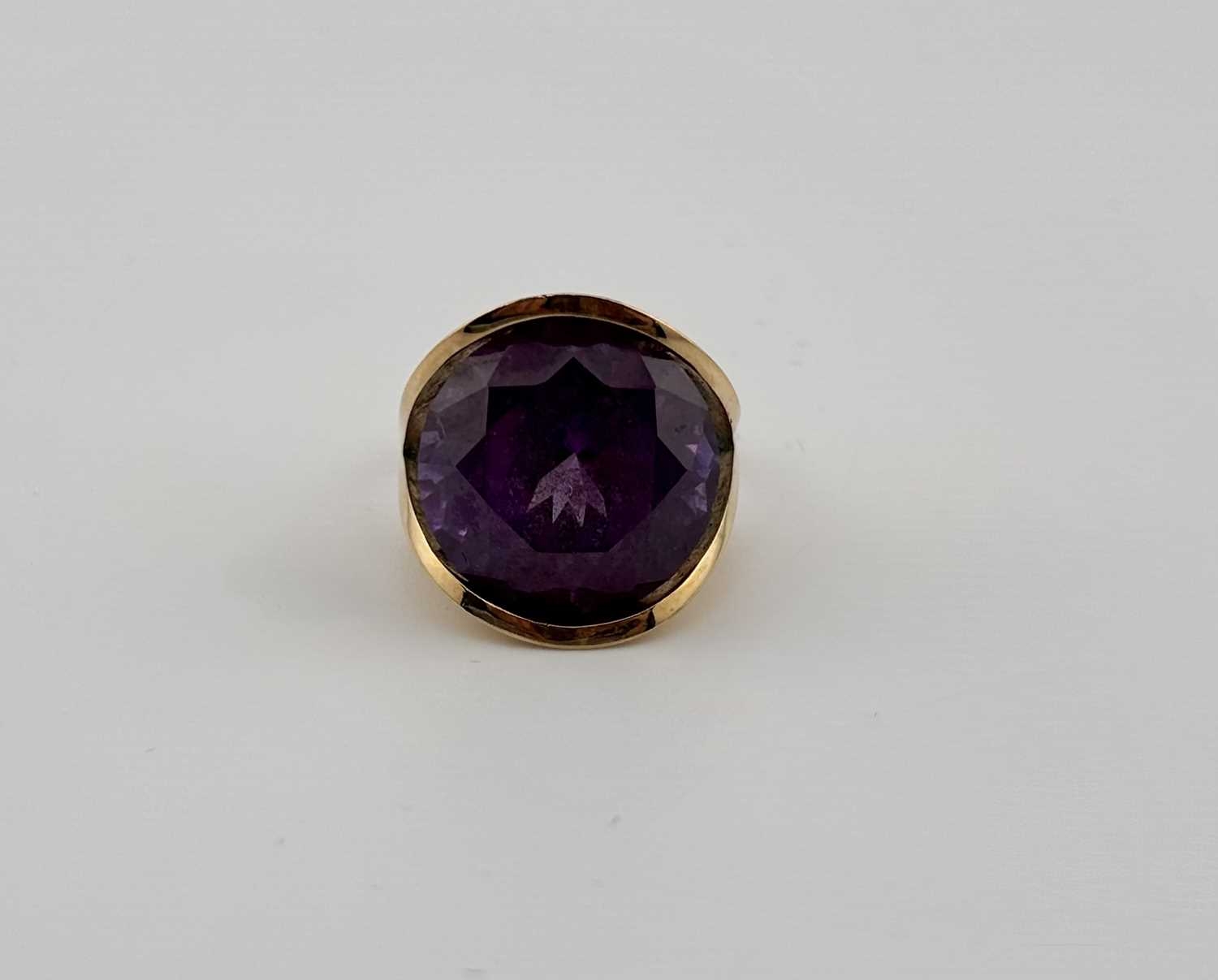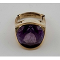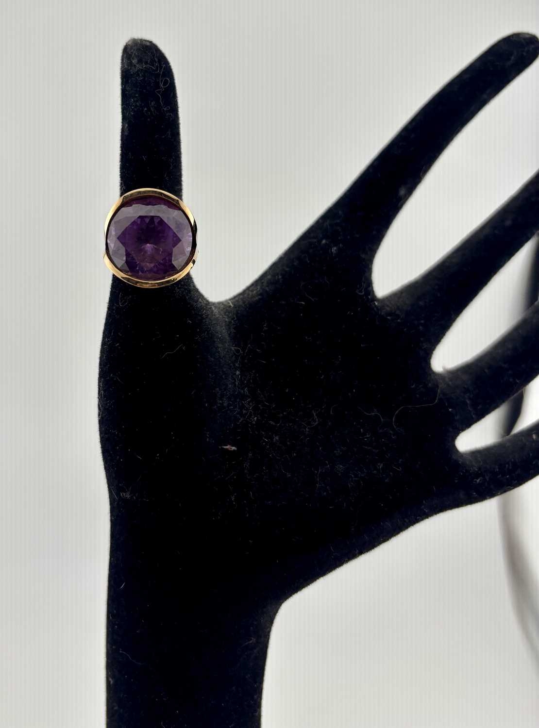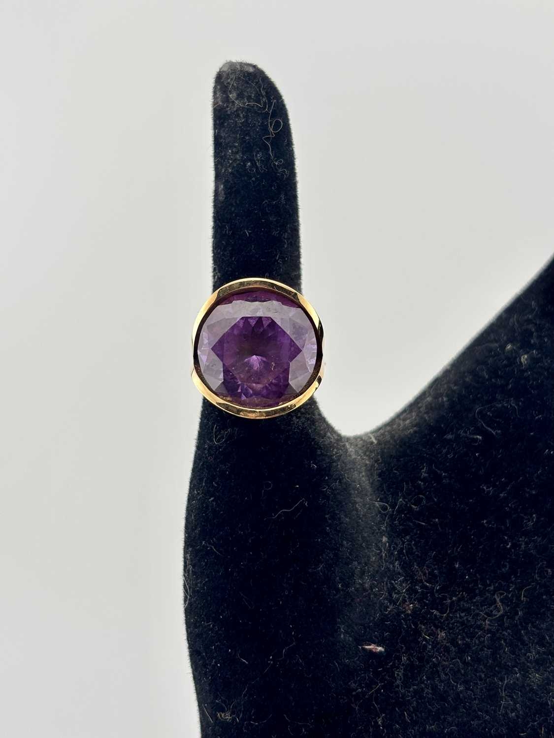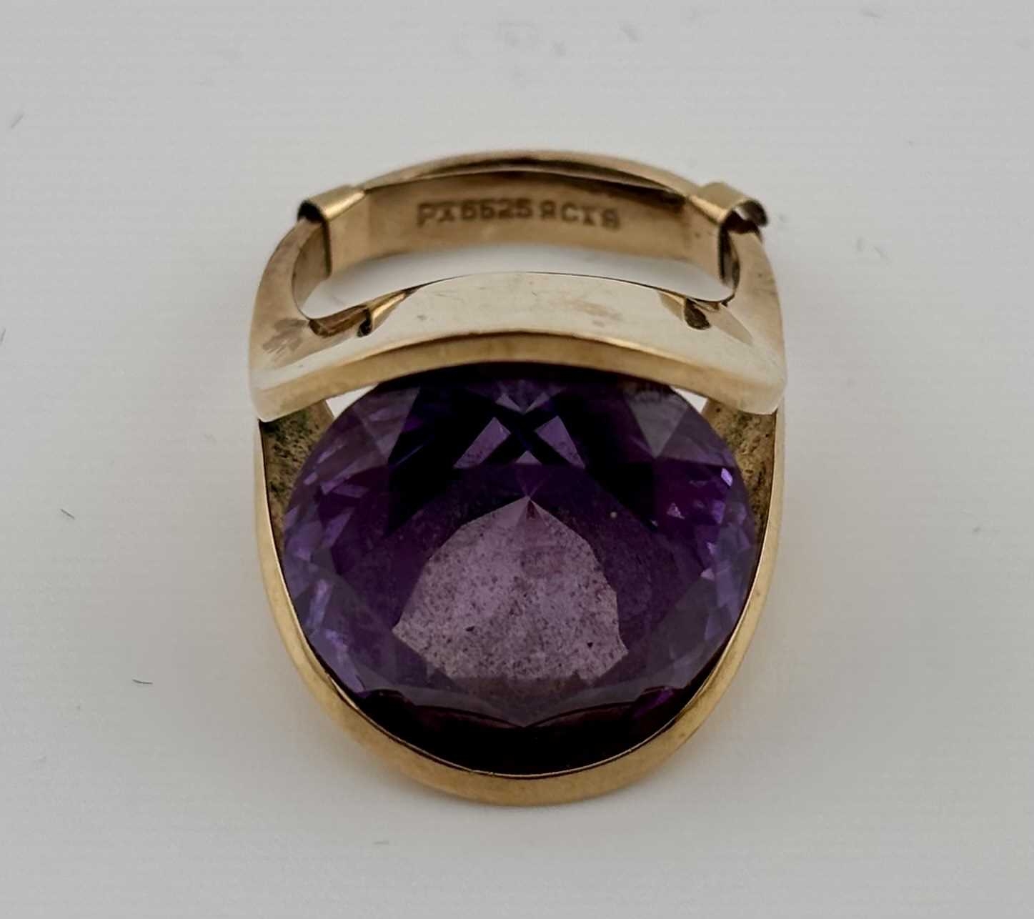 A synthetic colour-change sapphire single-stone ring, with removable inner sizing band, stamped MEXICO, stamped 14K, removable band stamped 9ct, ring size L1/2, gross weight 12.5grams (1)