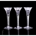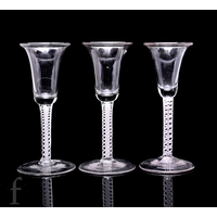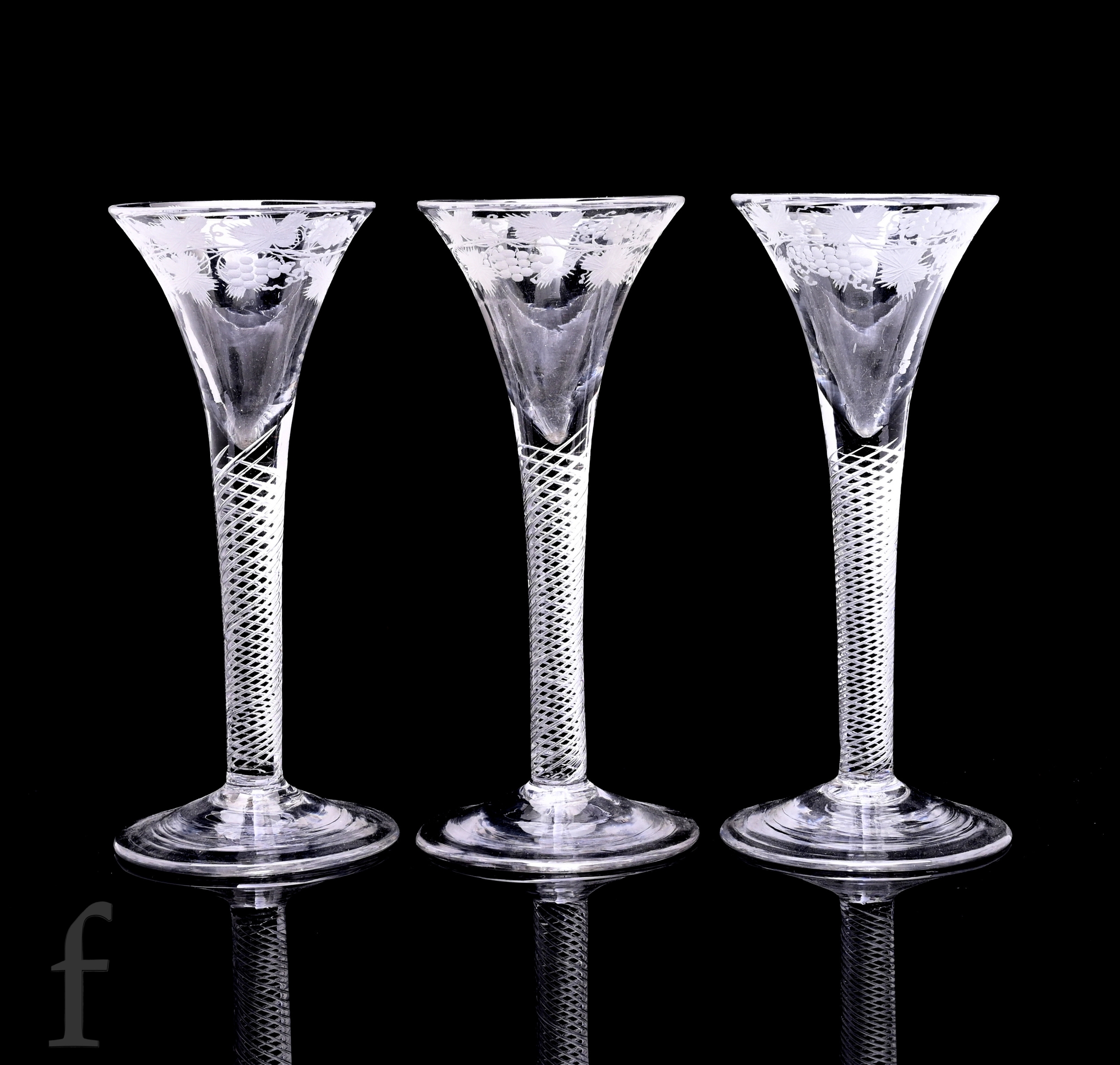 An 18th Century drinking glass circa 1750, the flared trumpet bowl engraved with a fruiting vine border above an air twist stem, raised to a conical foot, height 17cm, together with two matched examples, one chipped to the foot. (3)