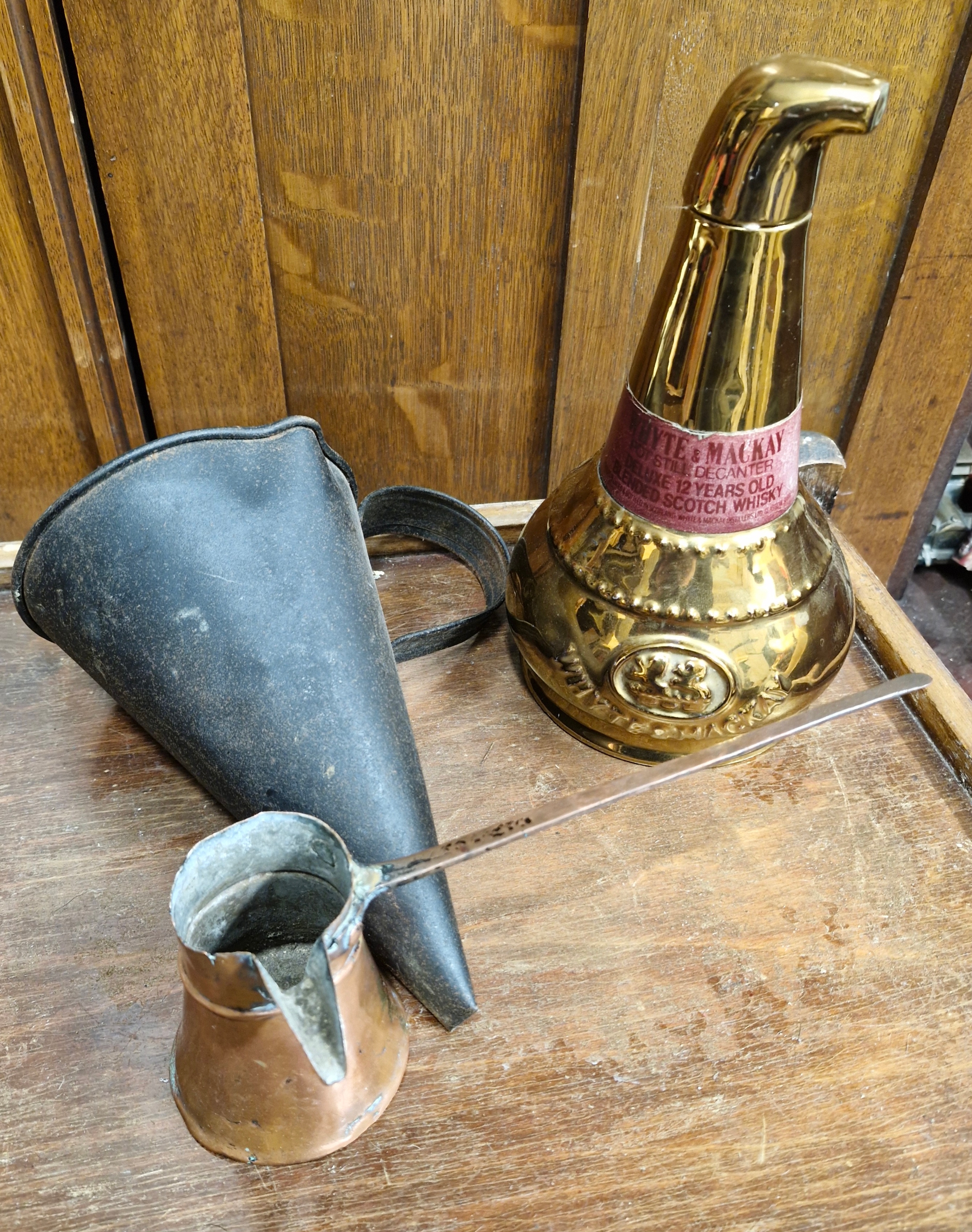 Whyte and Mackay decanter, a beer mull and a copper toddy measure.