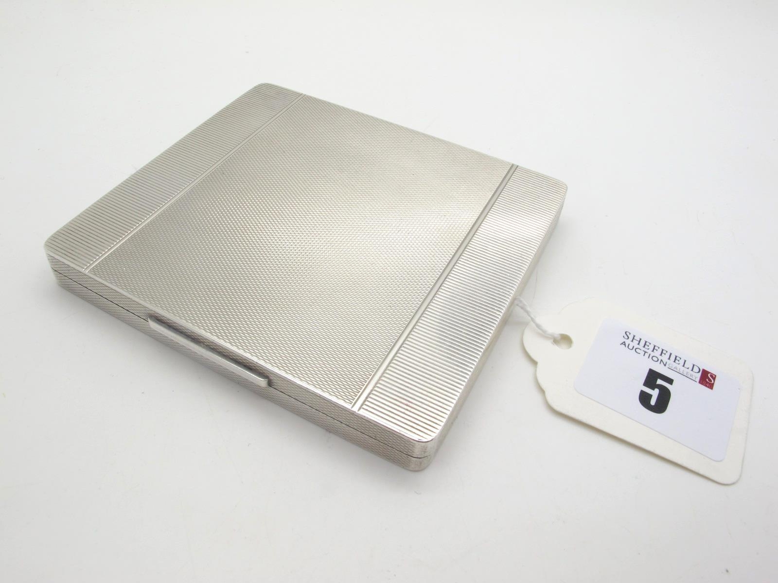 A Rectangular Cigarette Case, allover engine turned decoration, gilt lined and engraved inside "To Audrey From Norman with Love" "Audrey Flint, 40, South Park Rd Gatley", stamped "Silver".