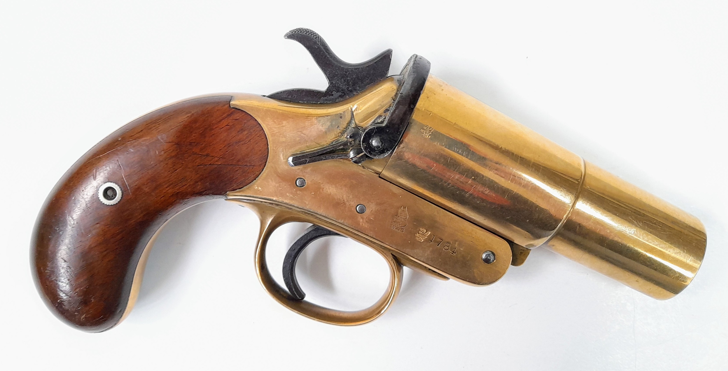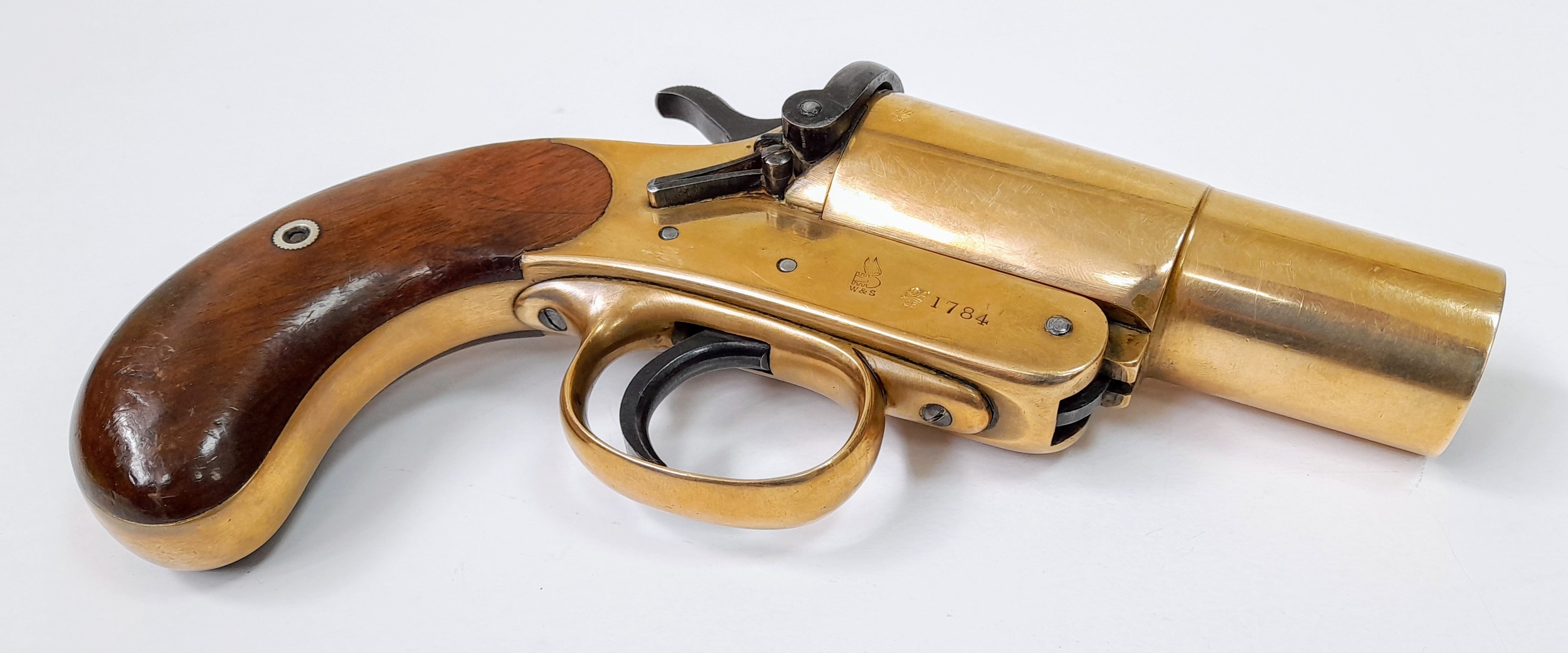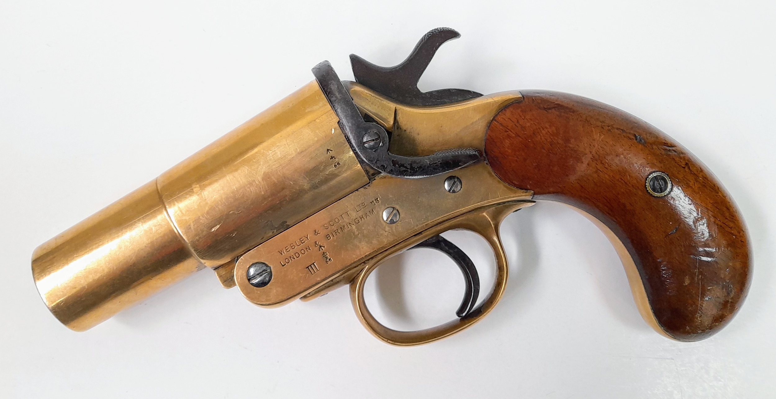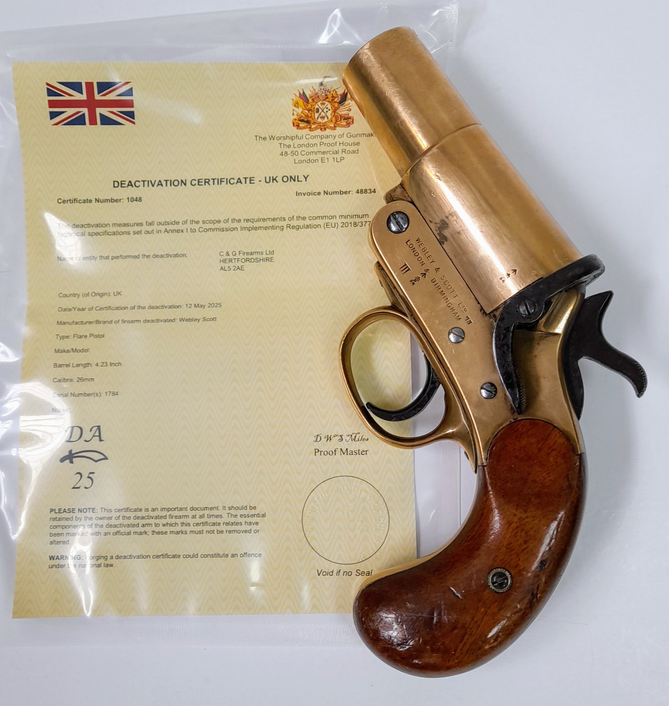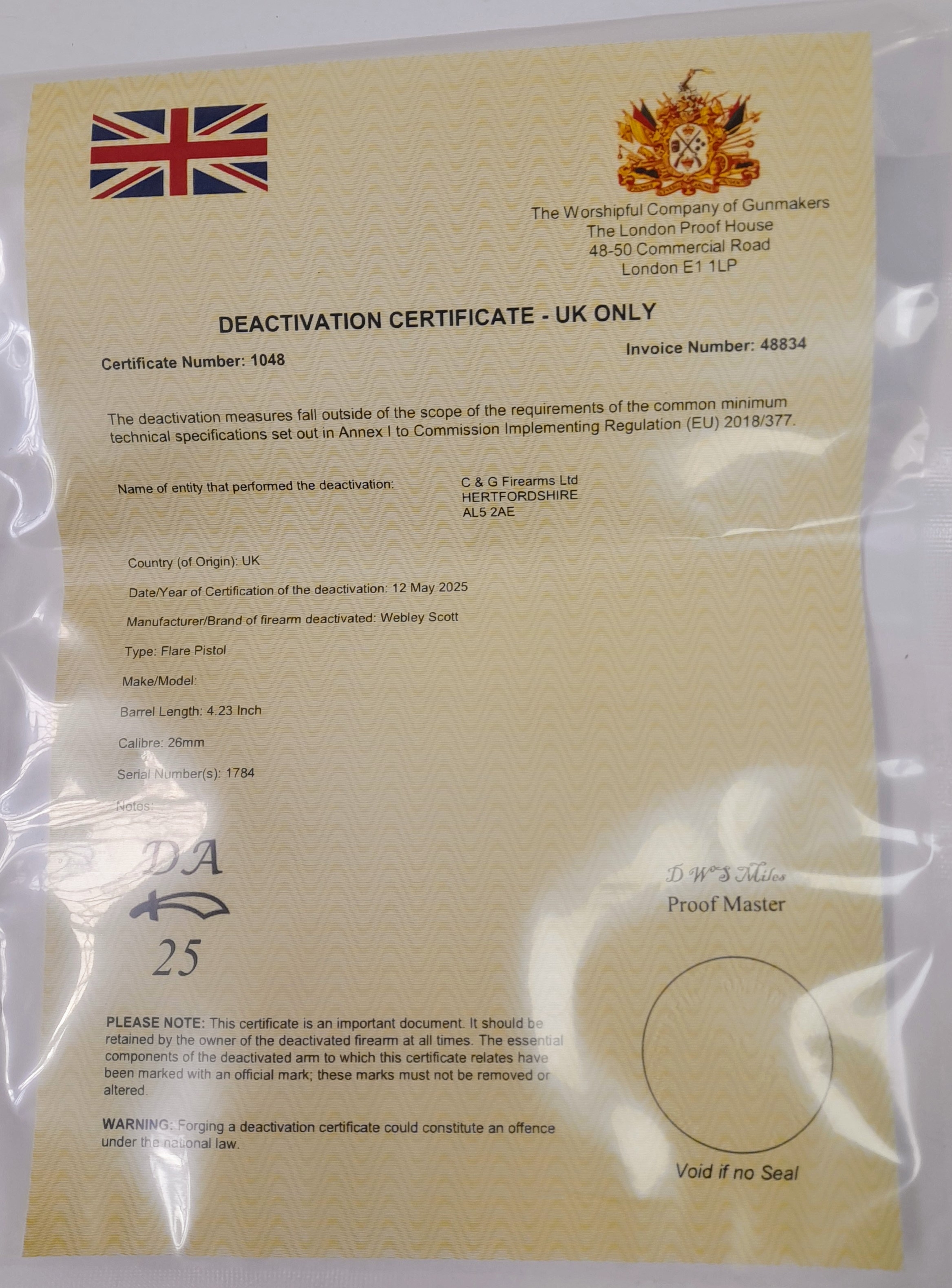 A deactivated Webley Scott single shot flare pistol, barrel length 4.23 inch, 26mm calibre, UK/EU sales only - Not Holland. Comes with an EU deactivation certificate.