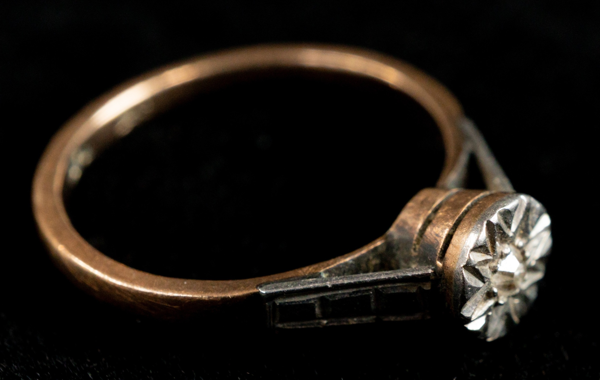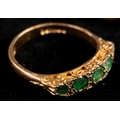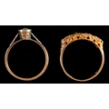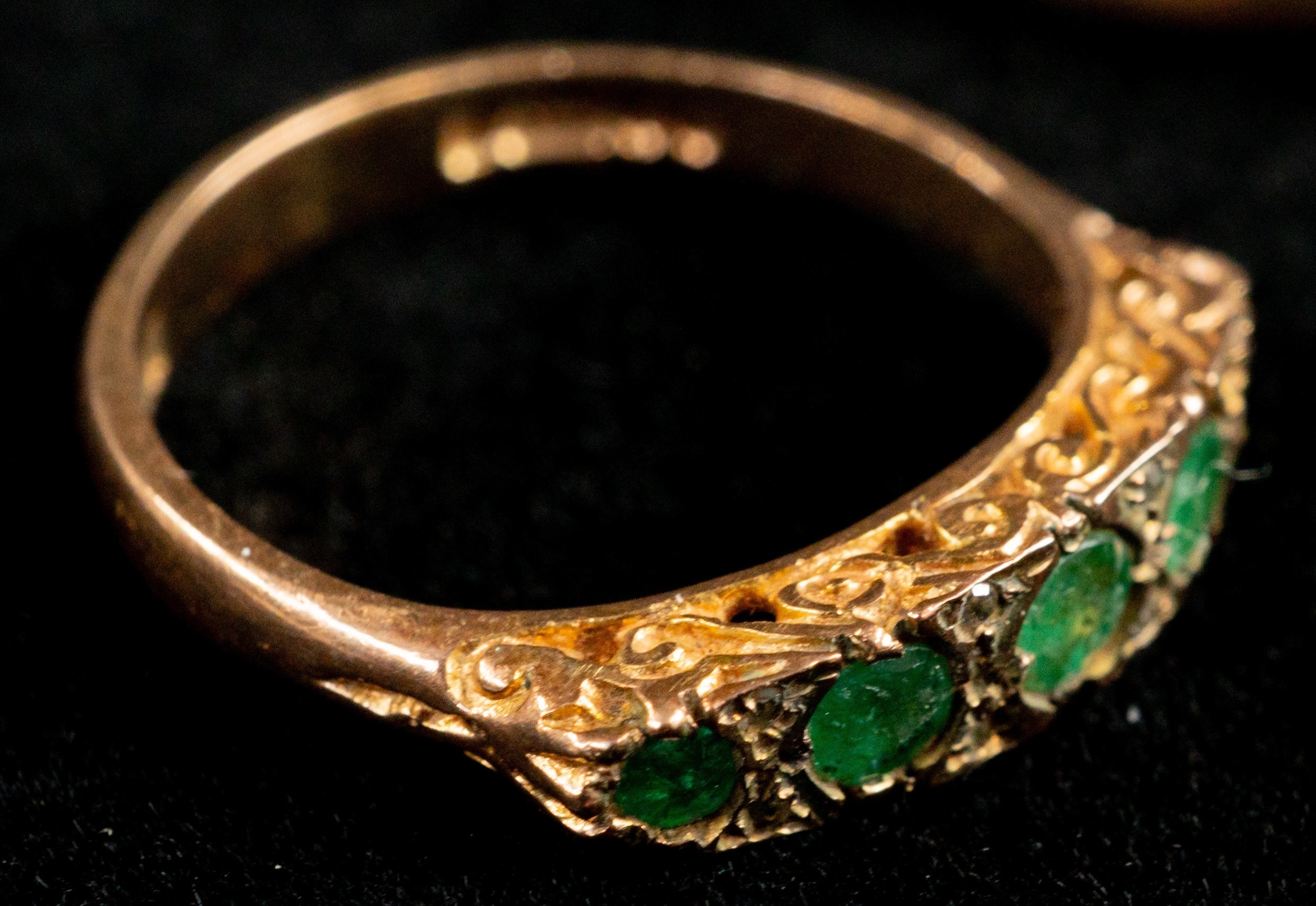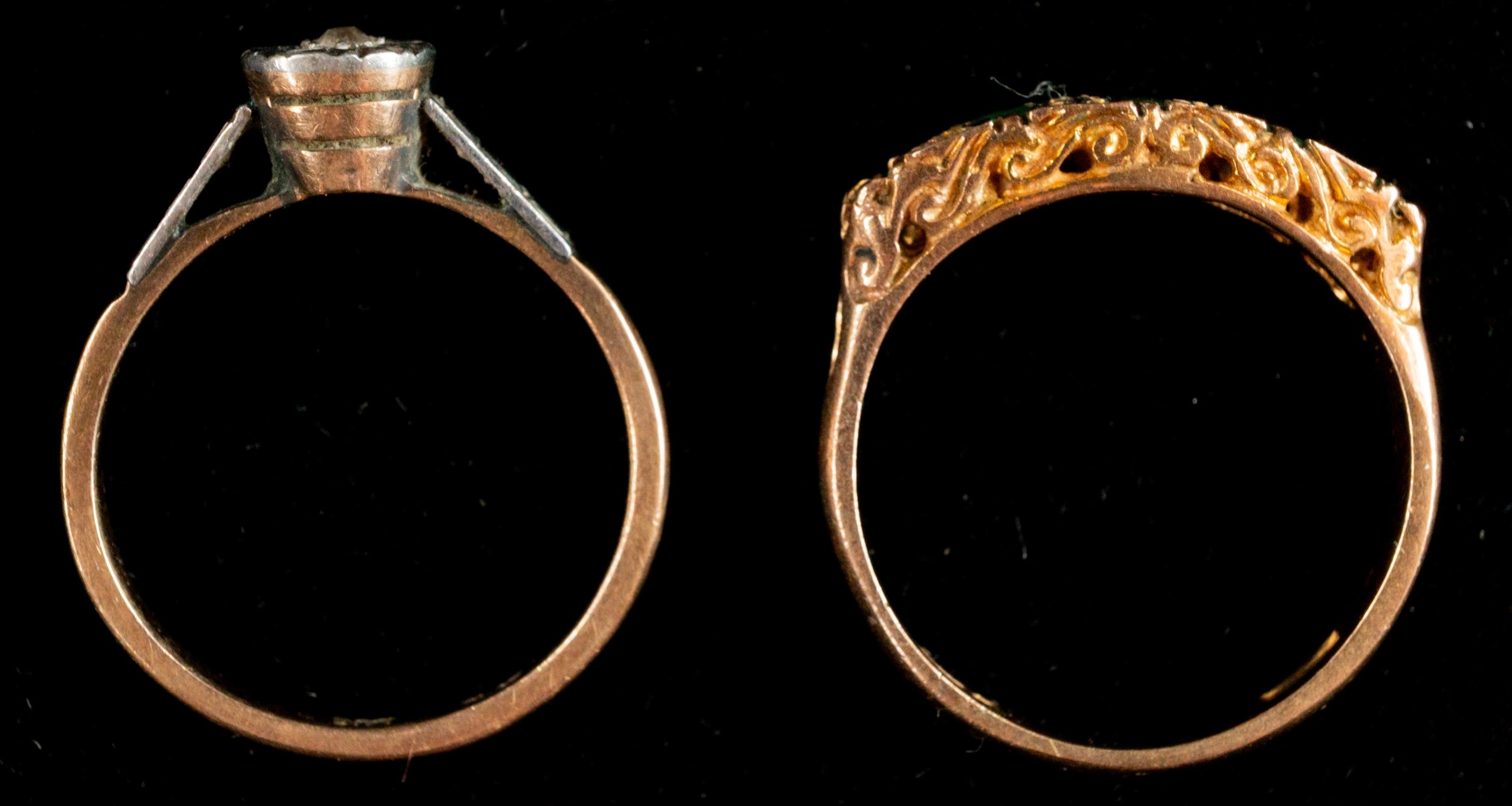 Jewellery: Two 9ct gold rings, one set with an old-cut diamond, ring size K½, the other a half hoop set with five graduated emeralds, ring size M, combined weight 4.2g.