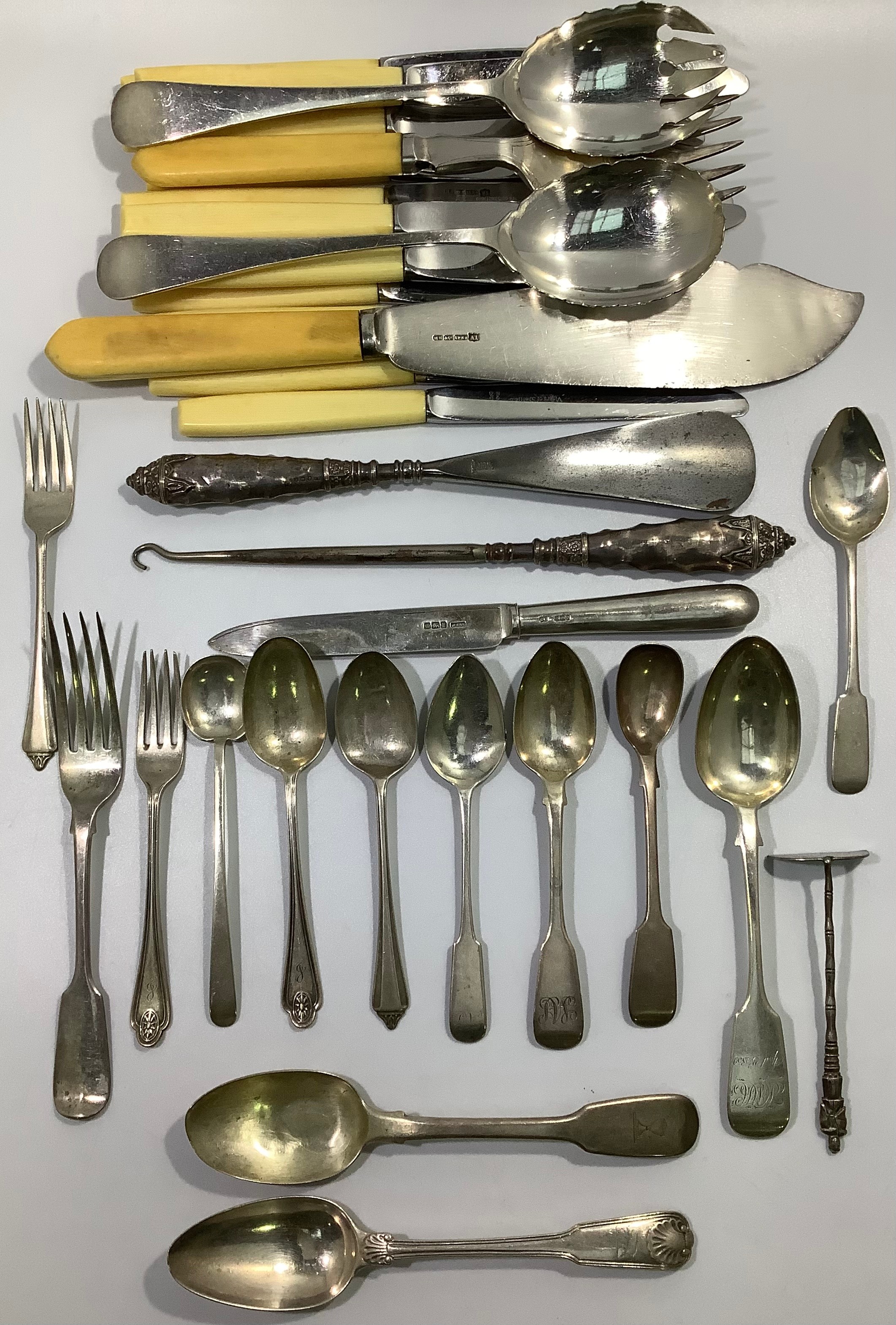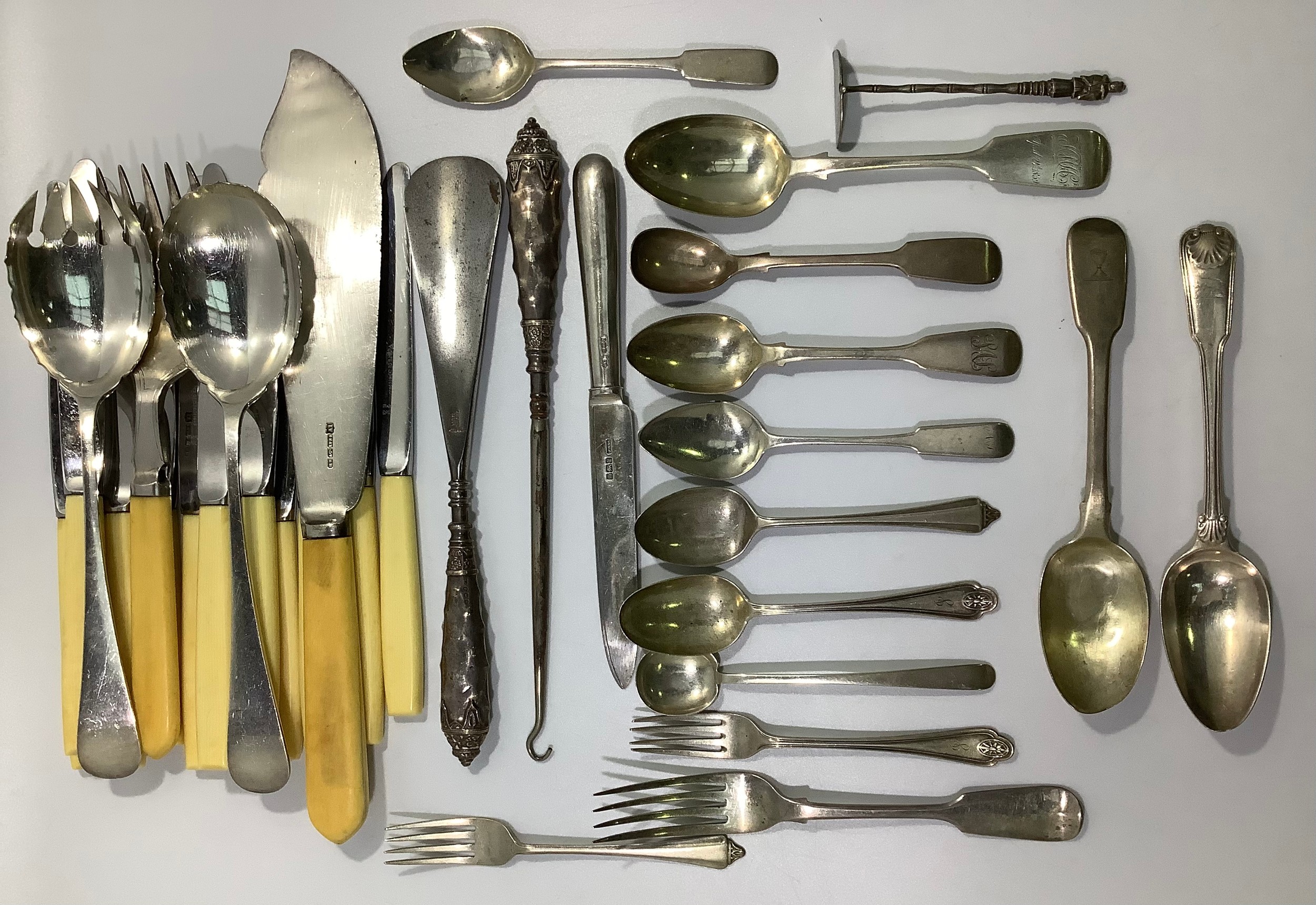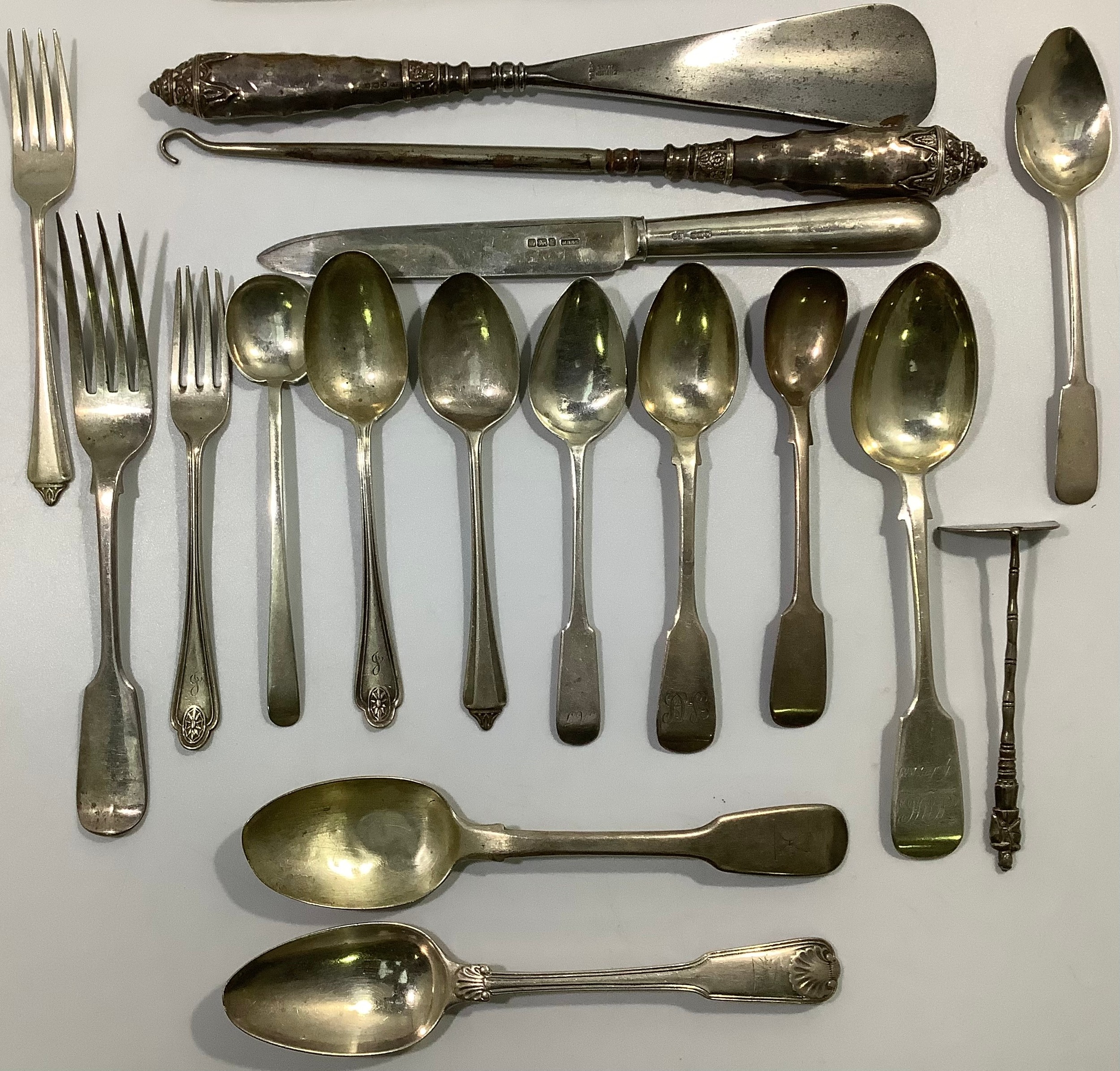 A mixed collection of assorted Georgian, Victorian and later silver flatware including spoons and forks etc. one spoon by George Nangle, hallmarked London, 1821 and another by Josiah Williams & Co. Hallmarked Exeter, 1858, together with a matched pair of silver-handled button-hook and shoe-horn and a small quantity of assorted silver-plate and stainless steel flatware etc. gross weight of silver items approximately 10.31ozt