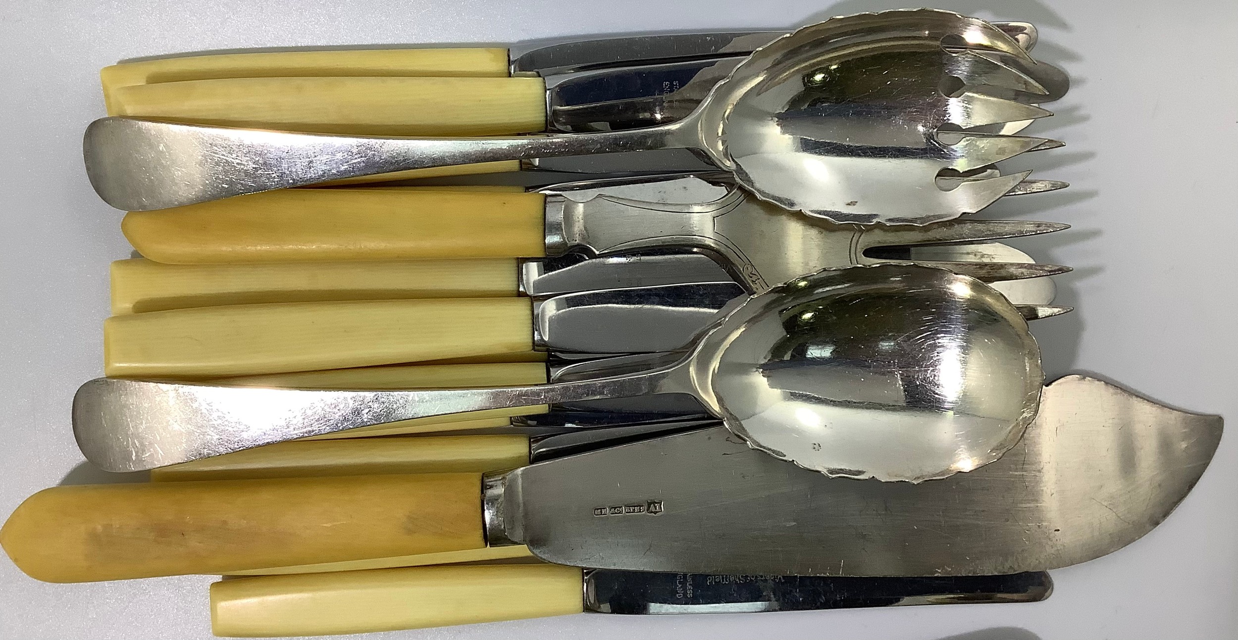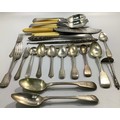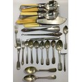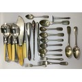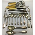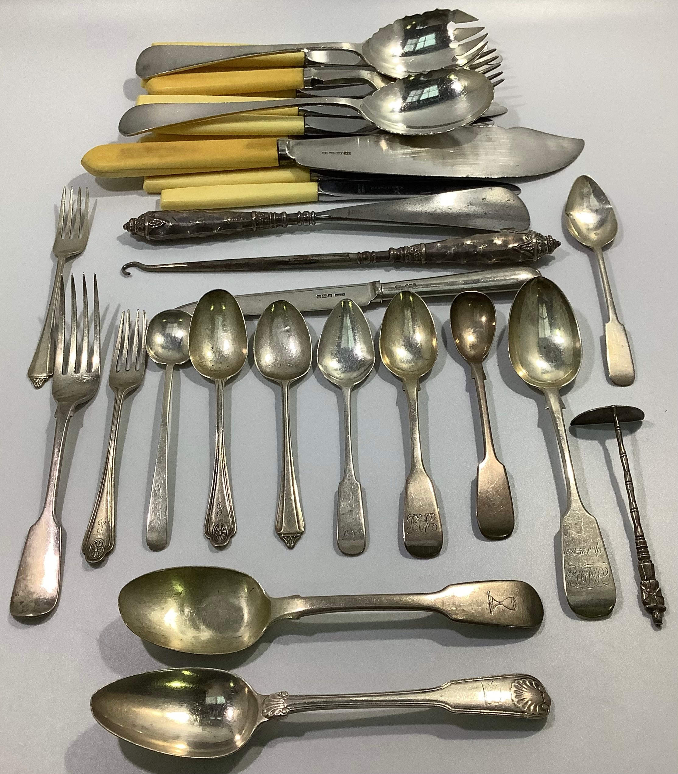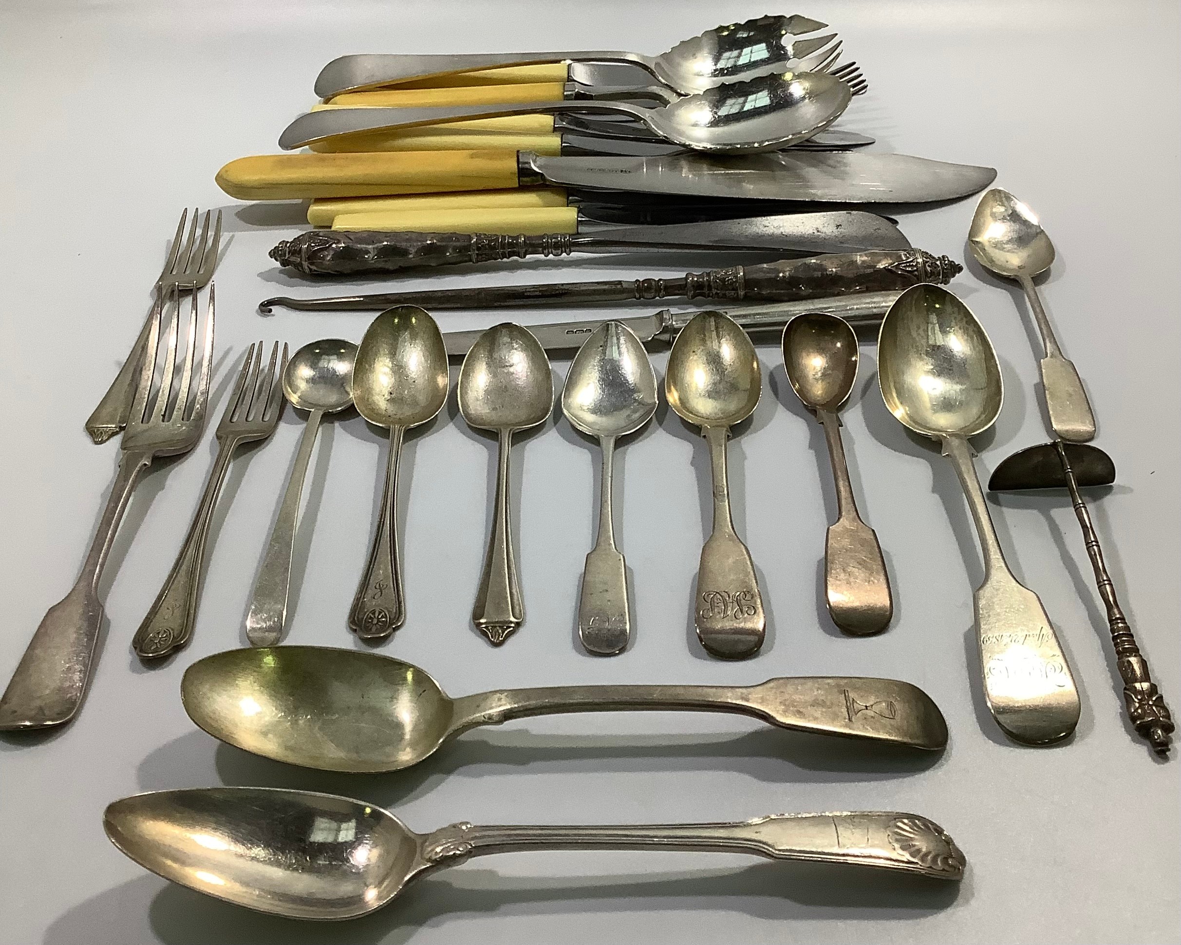 A mixed collection of assorted Georgian, Victorian and later silver flatware including spoons and forks etc. one spoon by George Nangle, hallmarked London, 1821 and another by Josiah Williams & Co. Hallmarked Exeter, 1858, together with a matched pair of silver-handled button-hook and shoe-horn and a small quantity of assorted silver-plate and stainless steel flatware etc. gross weight of silver items approximately 10.31ozt