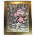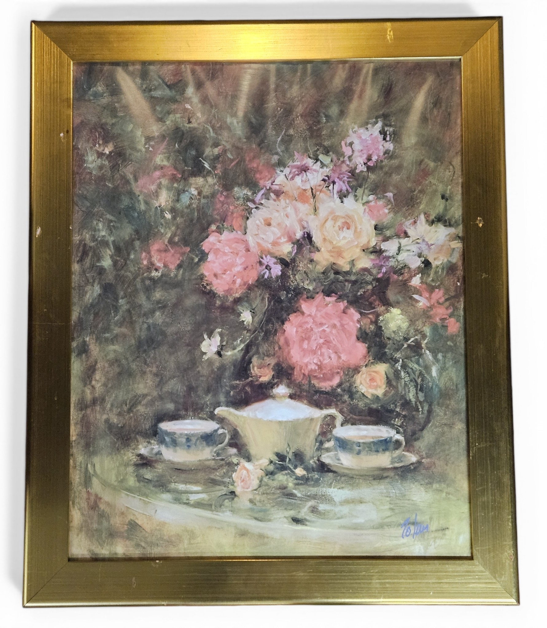 A large colour Print of roses on a table setting. 82 x 67 cm approx.