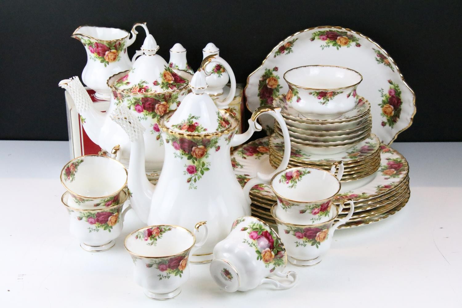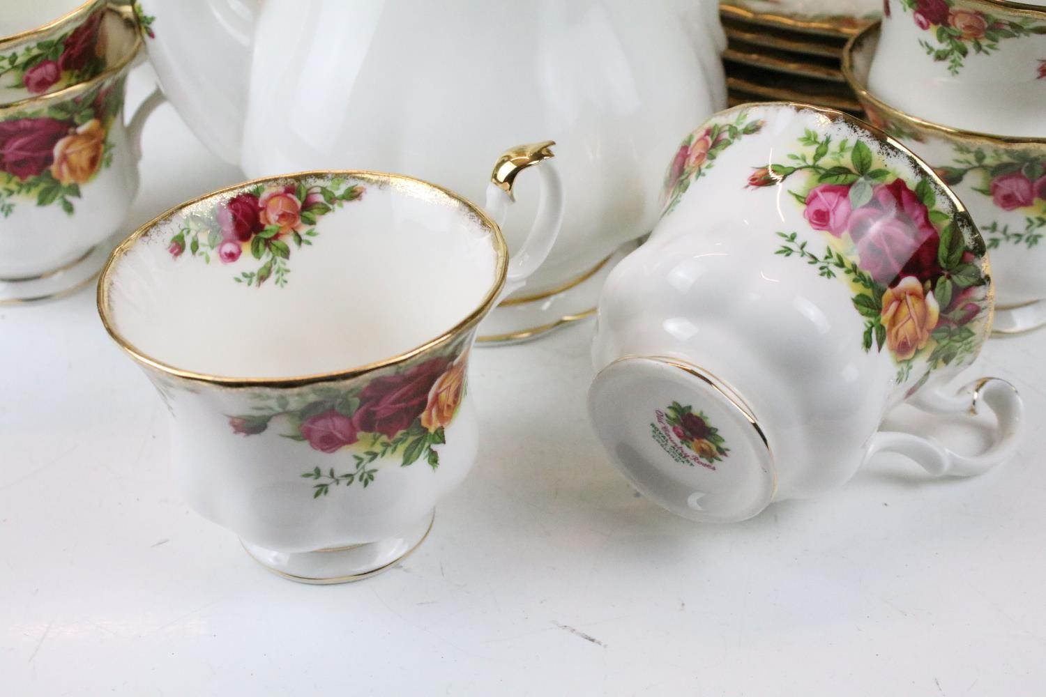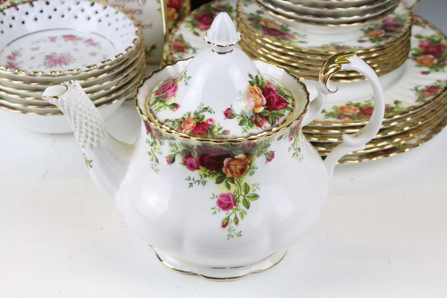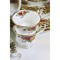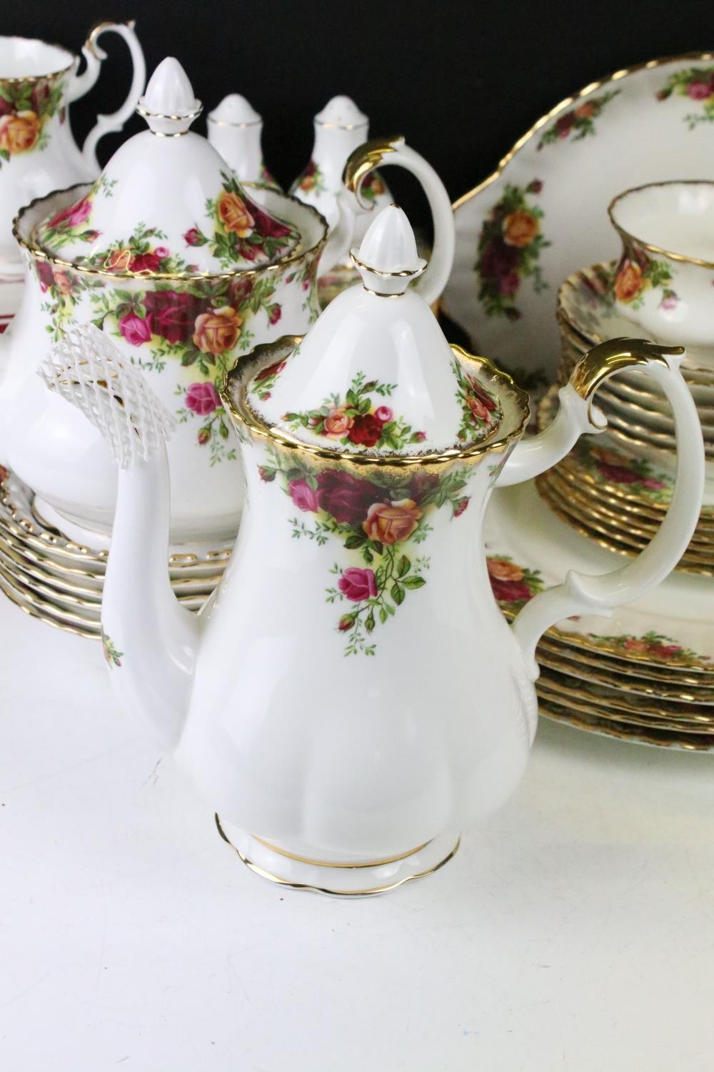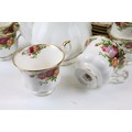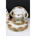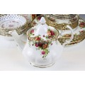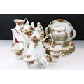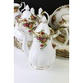 Collection of Royal Albert Old Country Roses, comprising: a coffee pot, teapot, milk jug, sugar bowl, cups, saucers, teaplates, sandwich plate and dinner plates, bowls, cruet, napkin rings and a floral decorated bowl