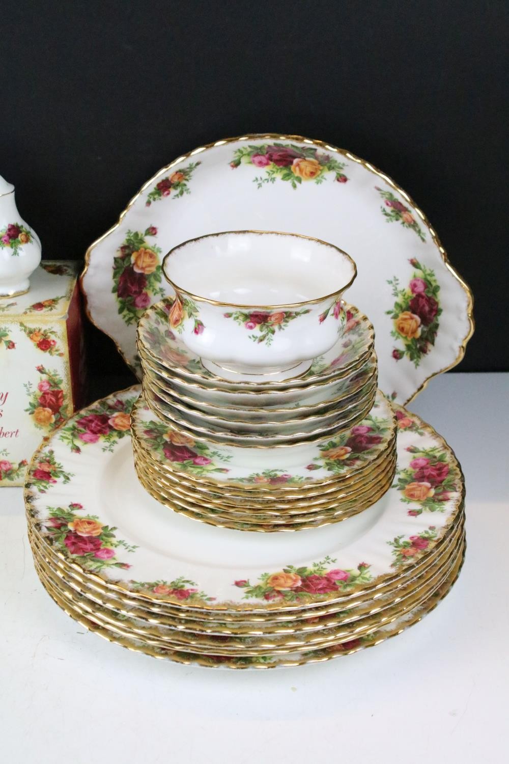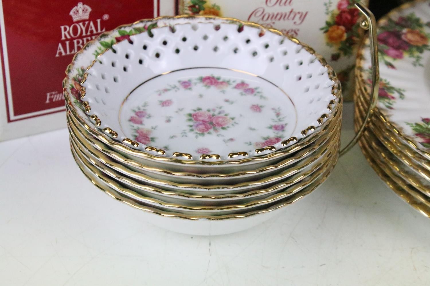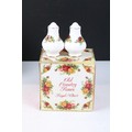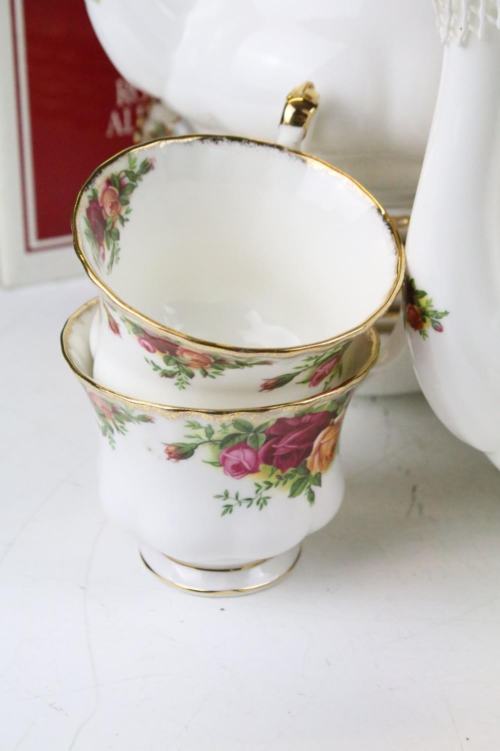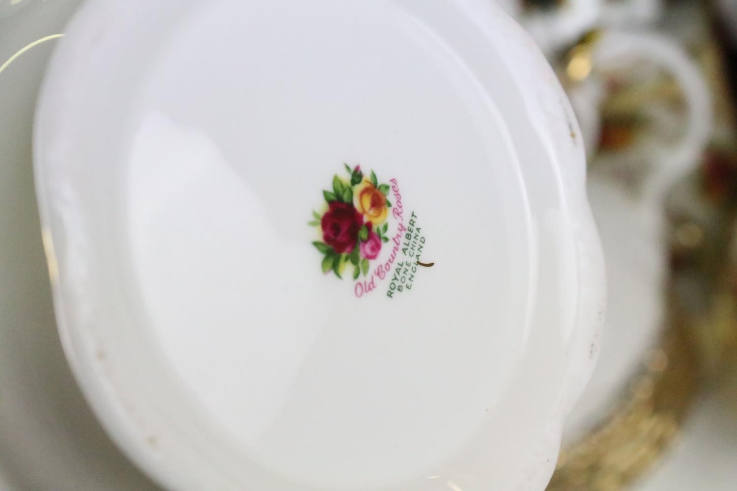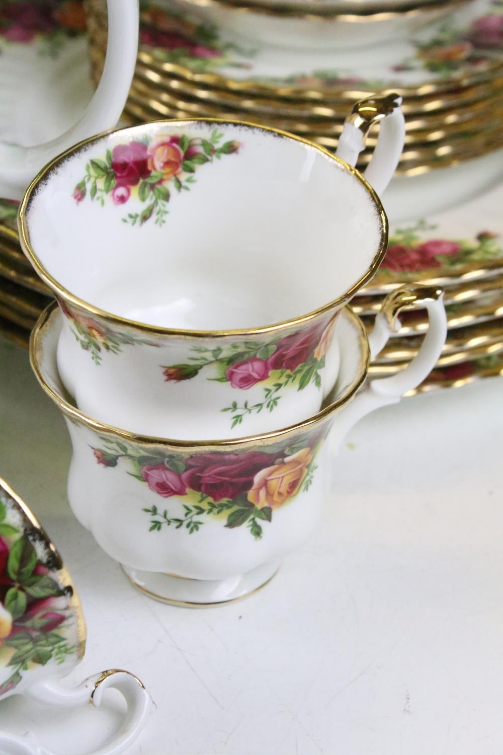 Collection of Royal Albert Old Country Roses, comprising: a coffee pot, teapot, milk jug, sugar bowl, cups, saucers, teaplates, sandwich plate and dinner plates, bowls, cruet, napkin rings and a floral decorated bowl