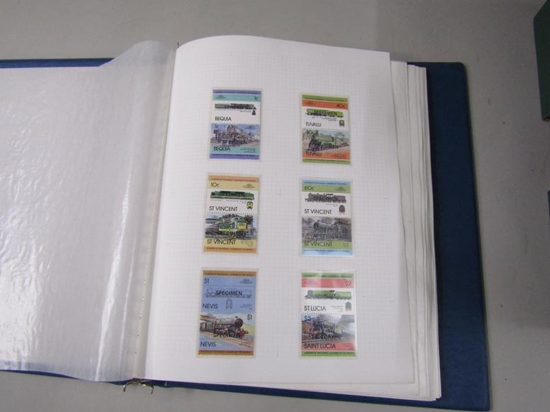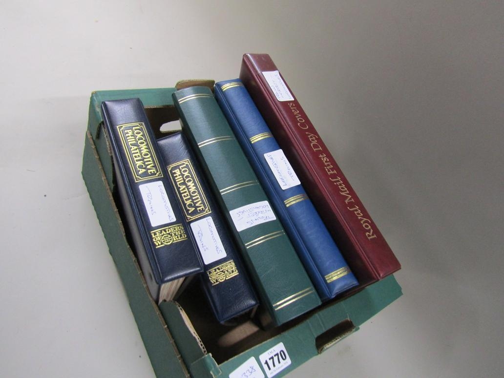 FIVE ALBUMS OF STAMPS, FIRST DAY COVERS RELATING TO TRAINS, LOCOMOTIVES ETC