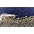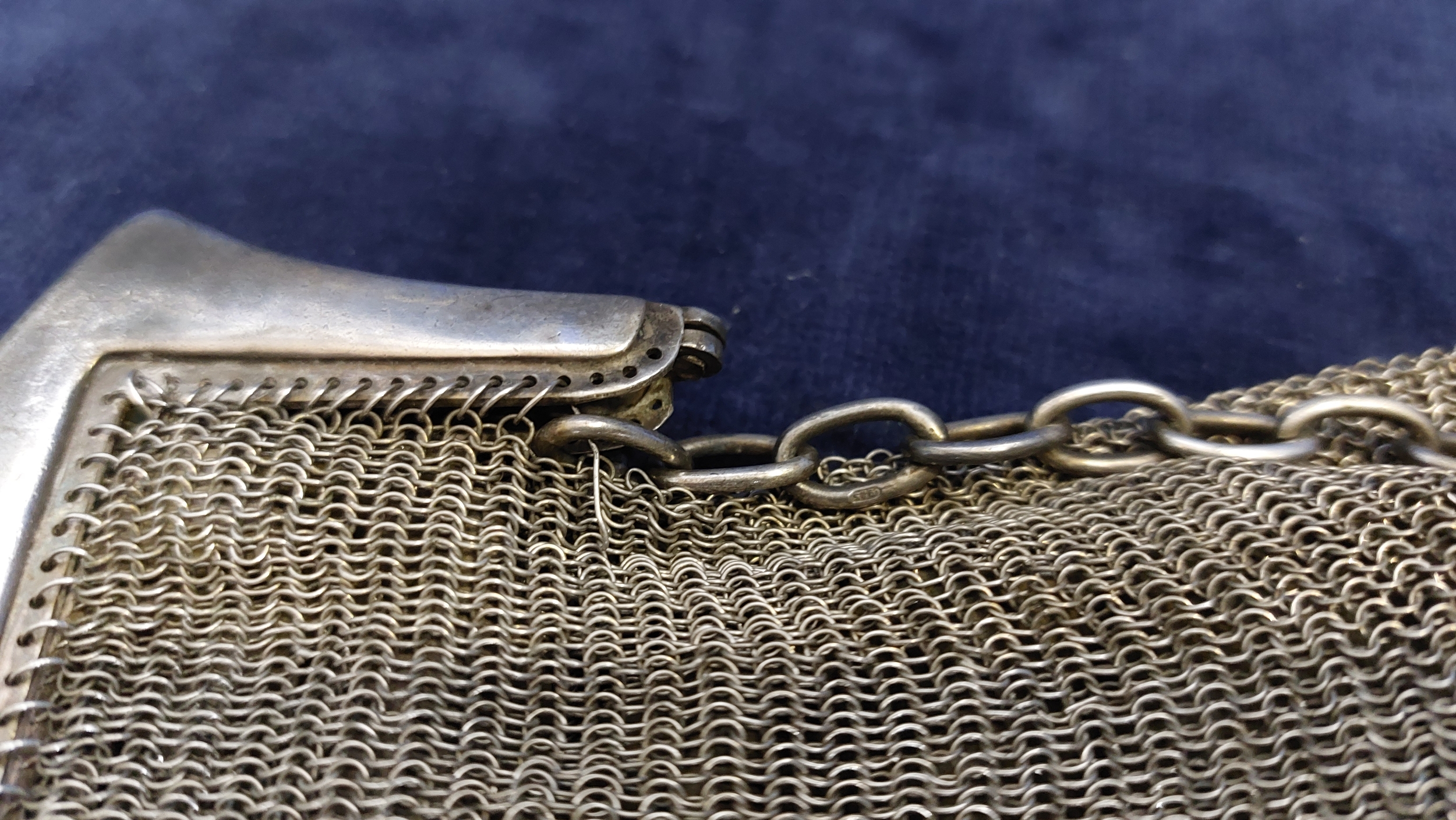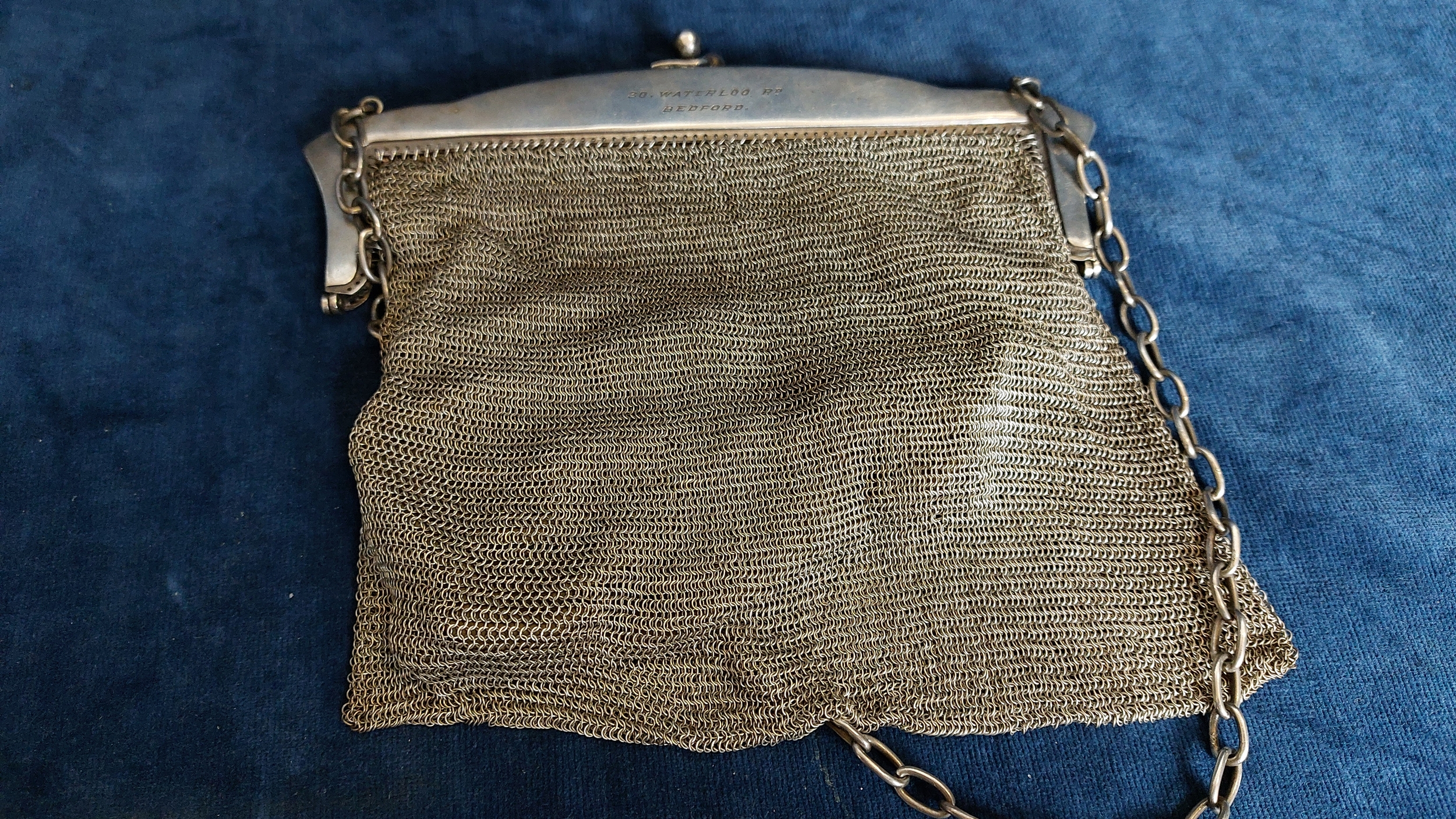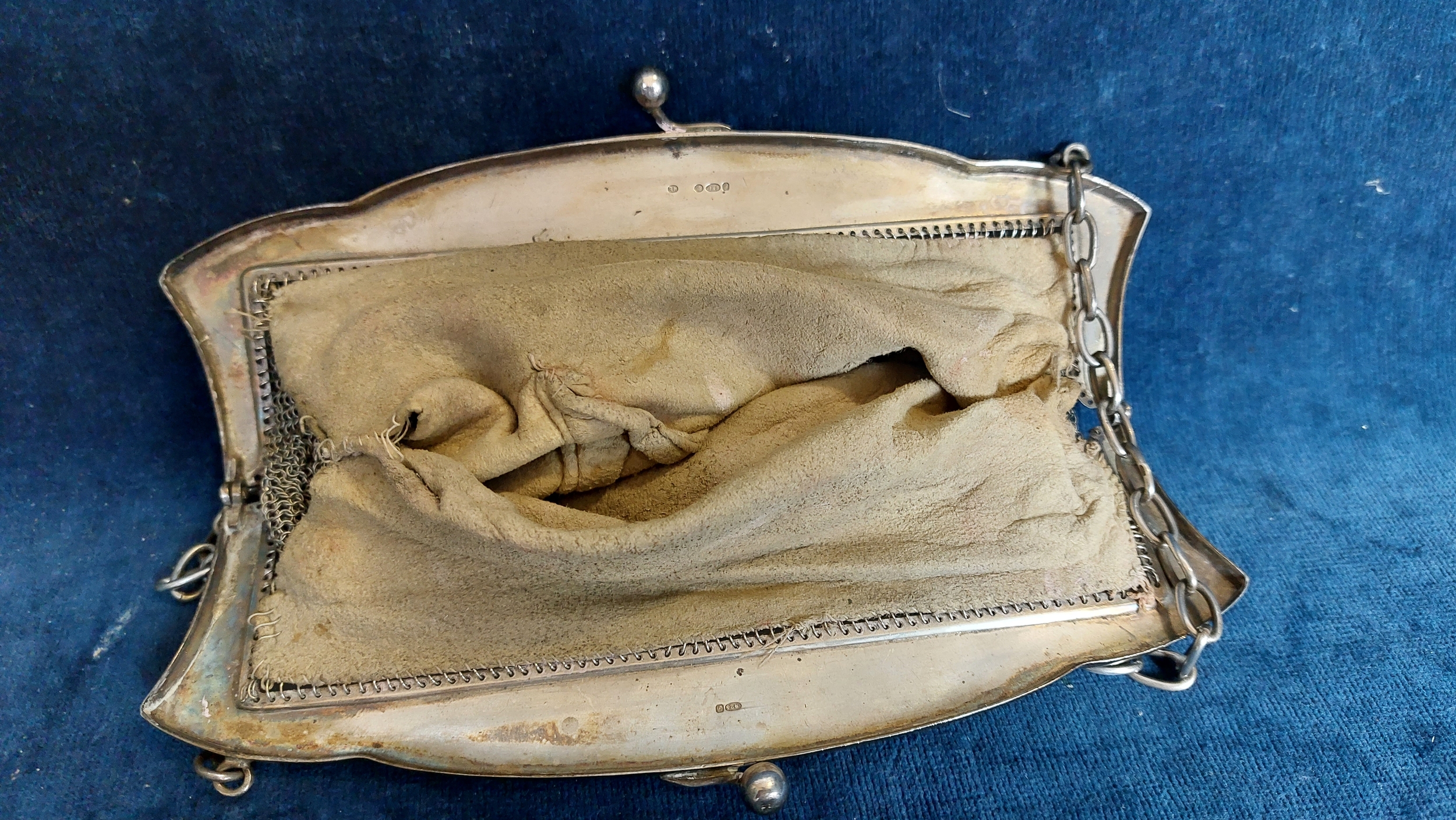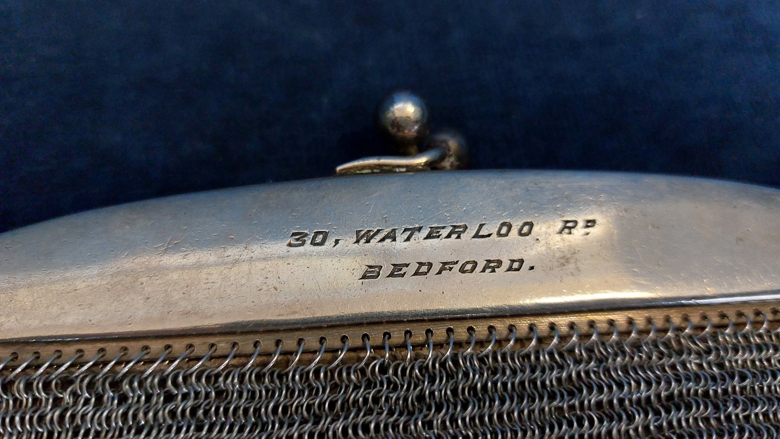 An extremely fine "925 Standard" silver ladies evening purse, lined with leather having hinged clasp, together with silver link chain inscribed "ALB", on the rear "30 Waterloo Road, Bedford".
