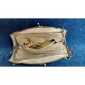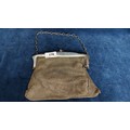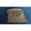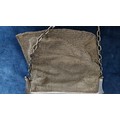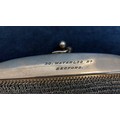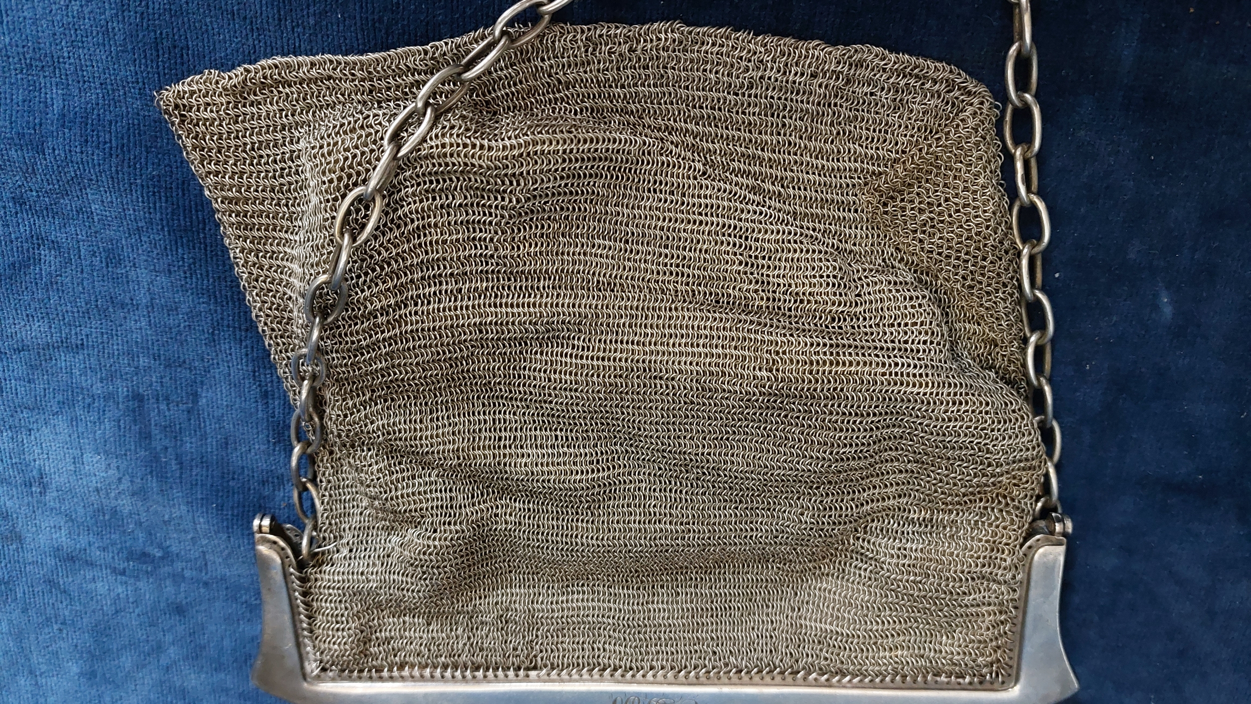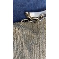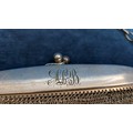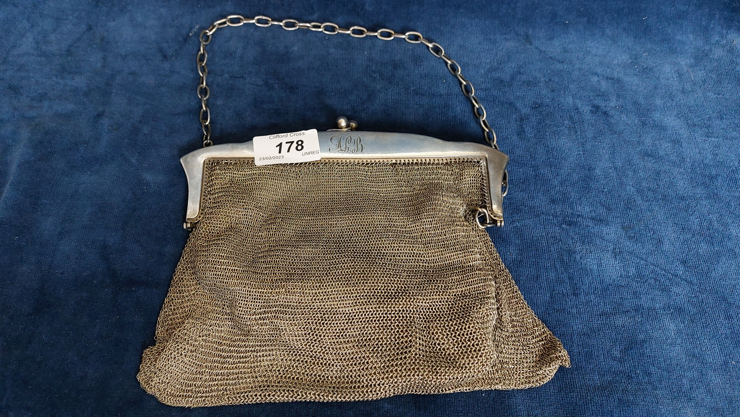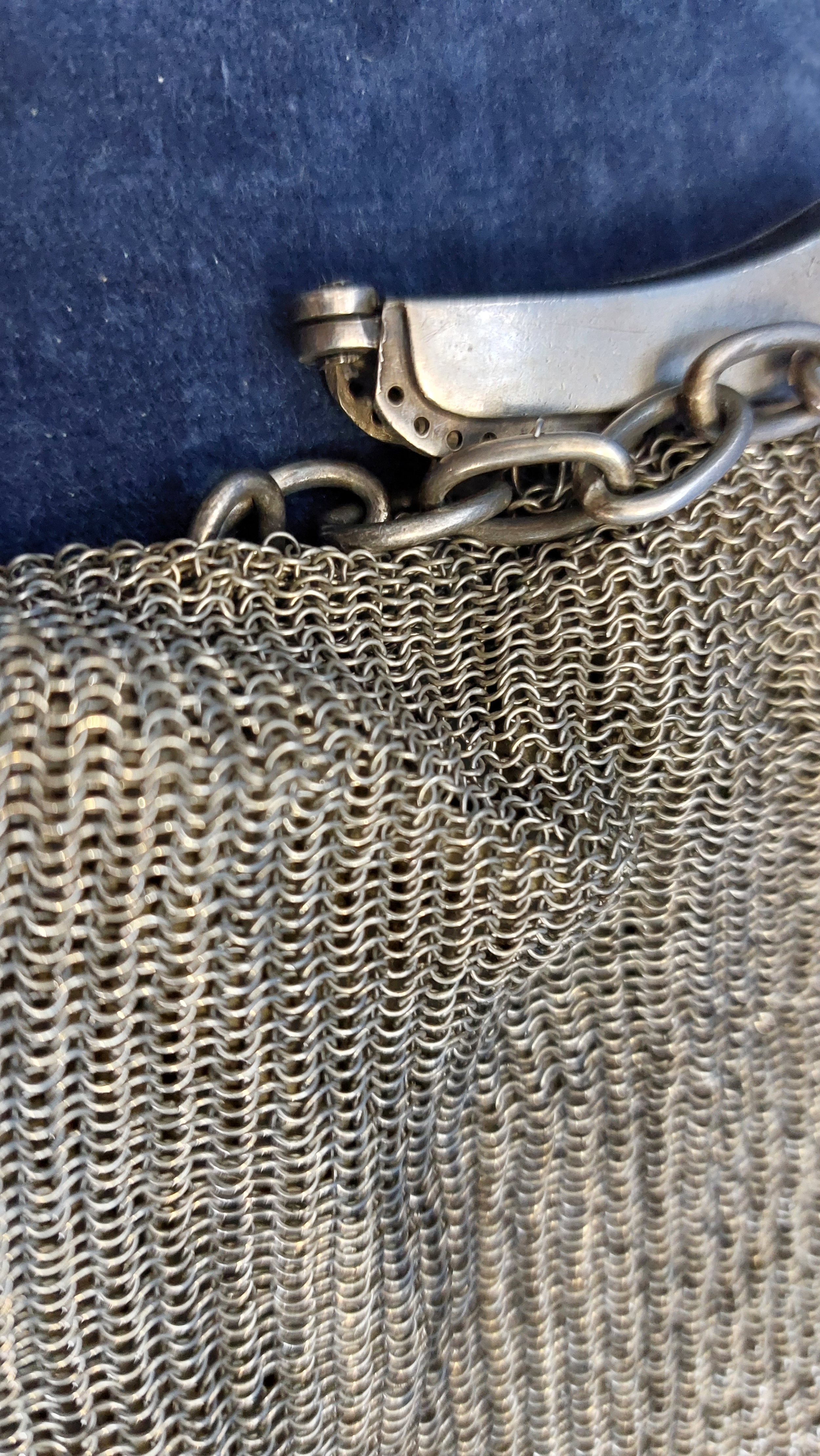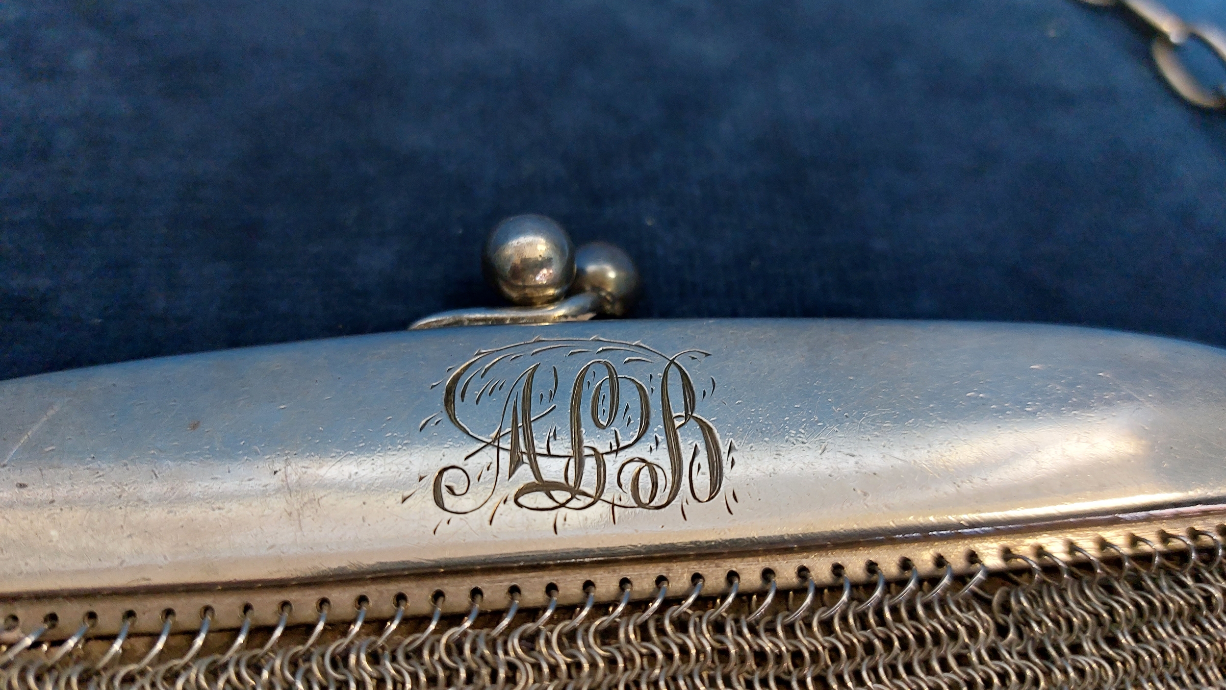 An extremely fine "925 Standard" silver ladies evening purse, lined with leather having hinged clasp, together with silver link chain inscribed "ALB", on the rear "30 Waterloo Road, Bedford".