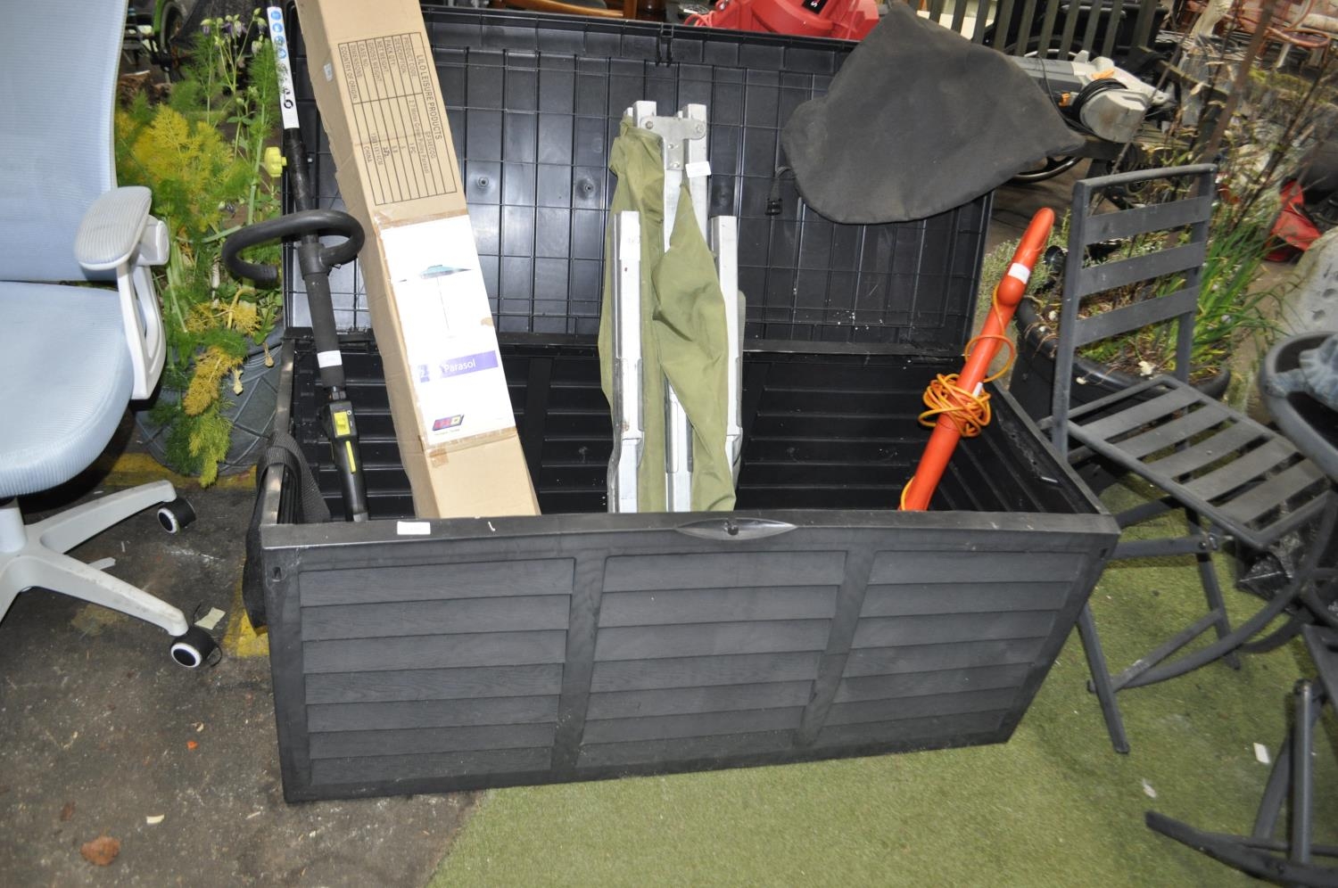 A GARDEN STORAGE BOX IN GOOD CONDITION MEASURING 52CM BY 118CM BY 55CM TALL