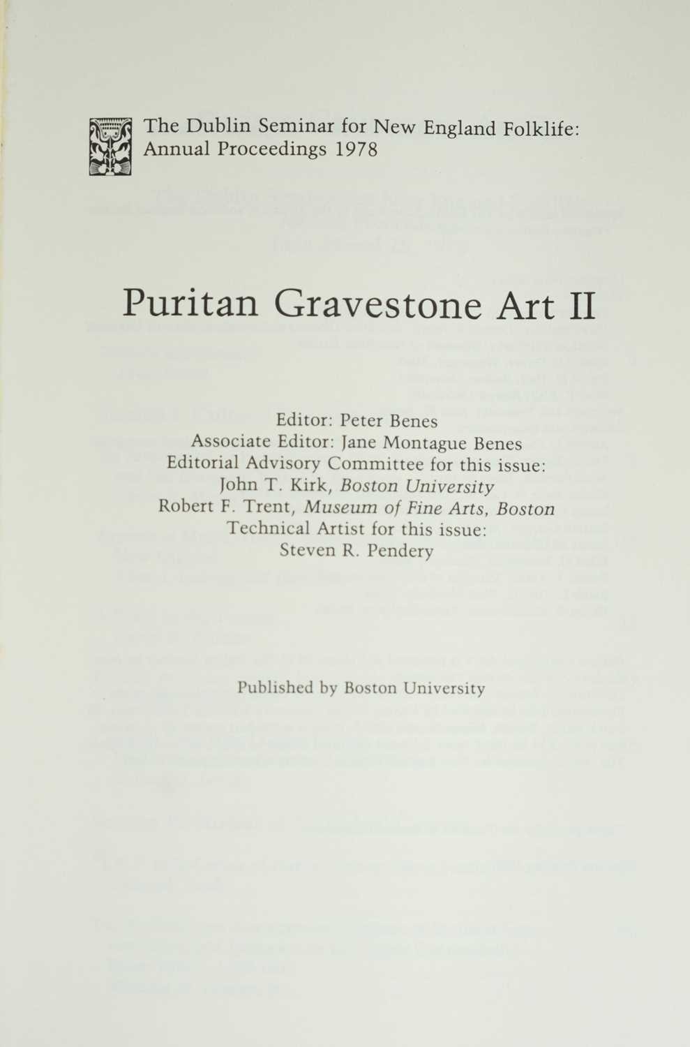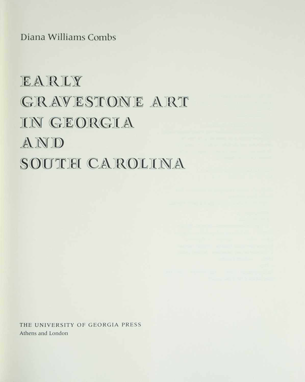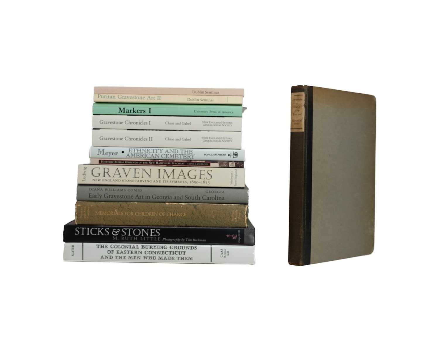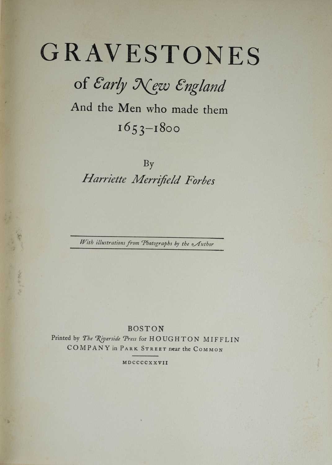 (American Graveyards and Gravestones) Thirteen works Includes publishers quarter cloth, limited edition copy of Harriette Merrifield Forbes, 'Gravestones of Early New England', No. 294/780, The Riverside Press, Cambridge Masachusetts, Nov. 1927, plates; Diana Williams Combs, 'Early Gravestone Art in Georgia and South Carolina', The University of Georgia Press, Athens Georgia 1986; together with others work on gravestones and burial grounds in Connecticut and New Hampshire, all vg. (13)