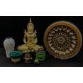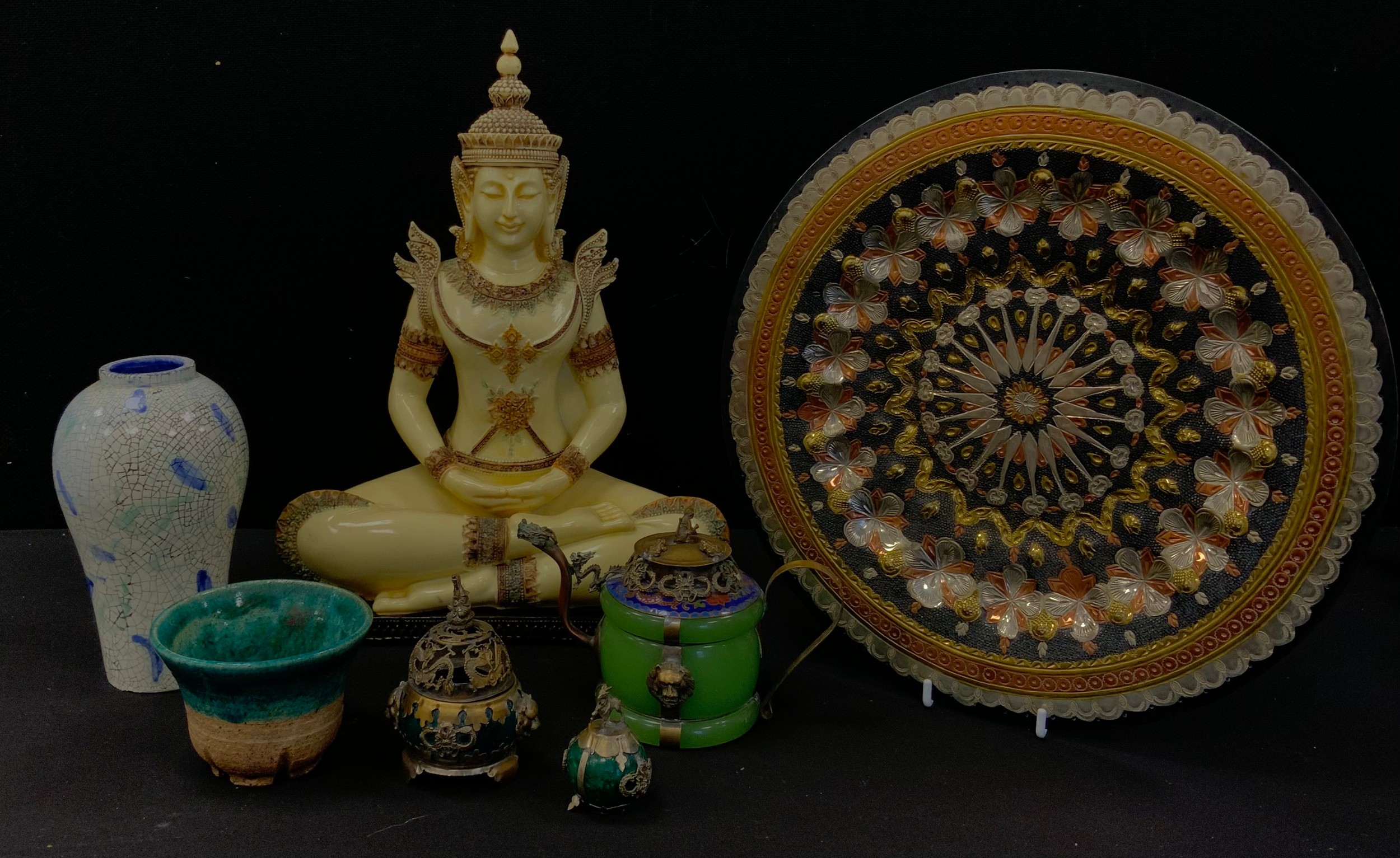 A Chinese clossoine mounted miniature jade green glass teapot, the metal mounted with Monkeys, Toads, Dragons and Lions, similar smaller incense burner; figure of Buddha etc