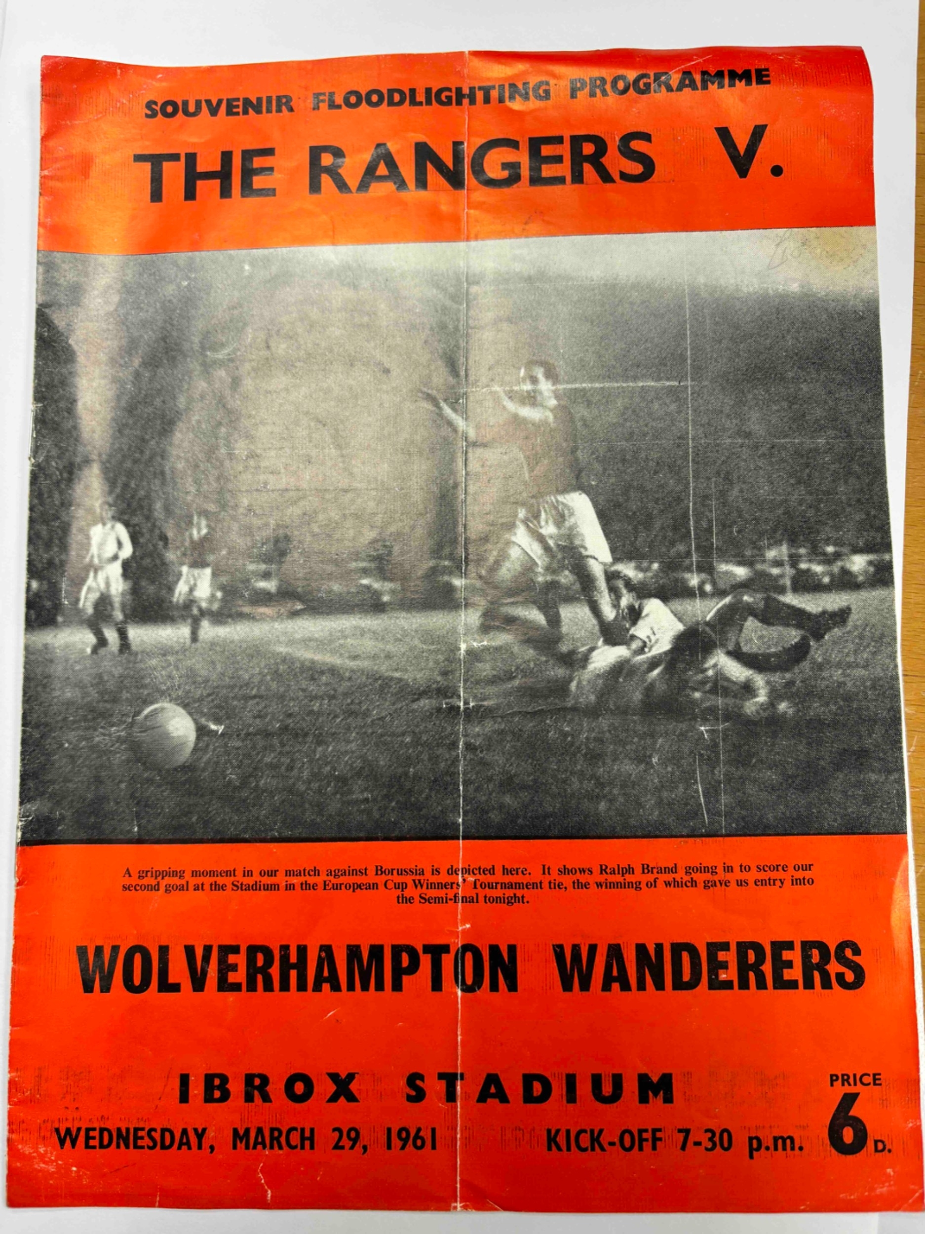 1960/61 RANGERS v WOLVES ECWC semi-final at Ibrox. Light vertical fold only. No writing.