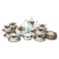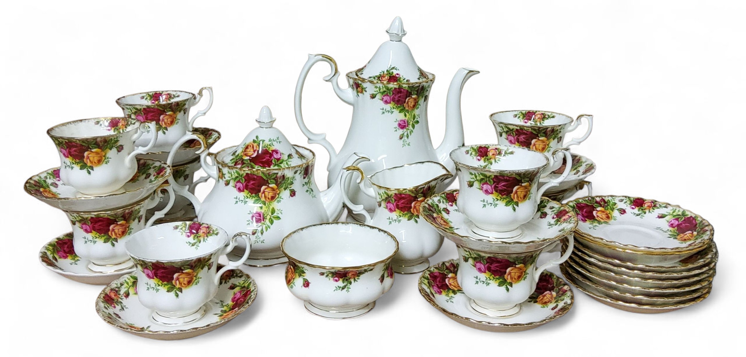 A Royal Albert Old Country Roses tea and coffee service, comprings, coffee pot, teapot, milk jug, sugar bowl, milk jug, sugar bowl, nine cups, seventeen saucers, printed marks