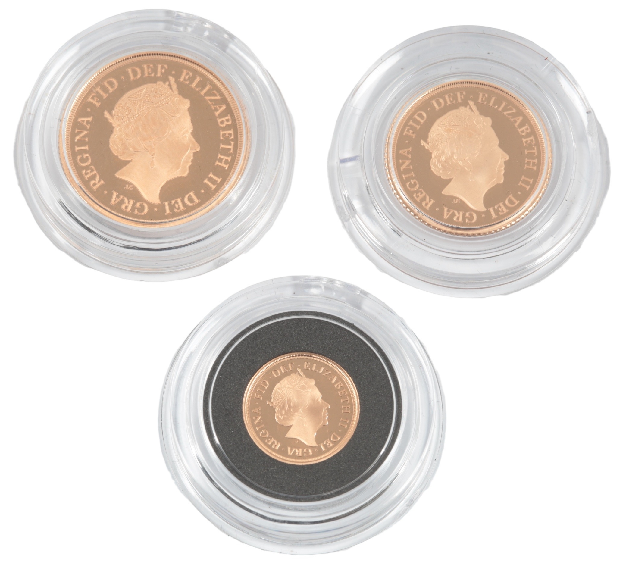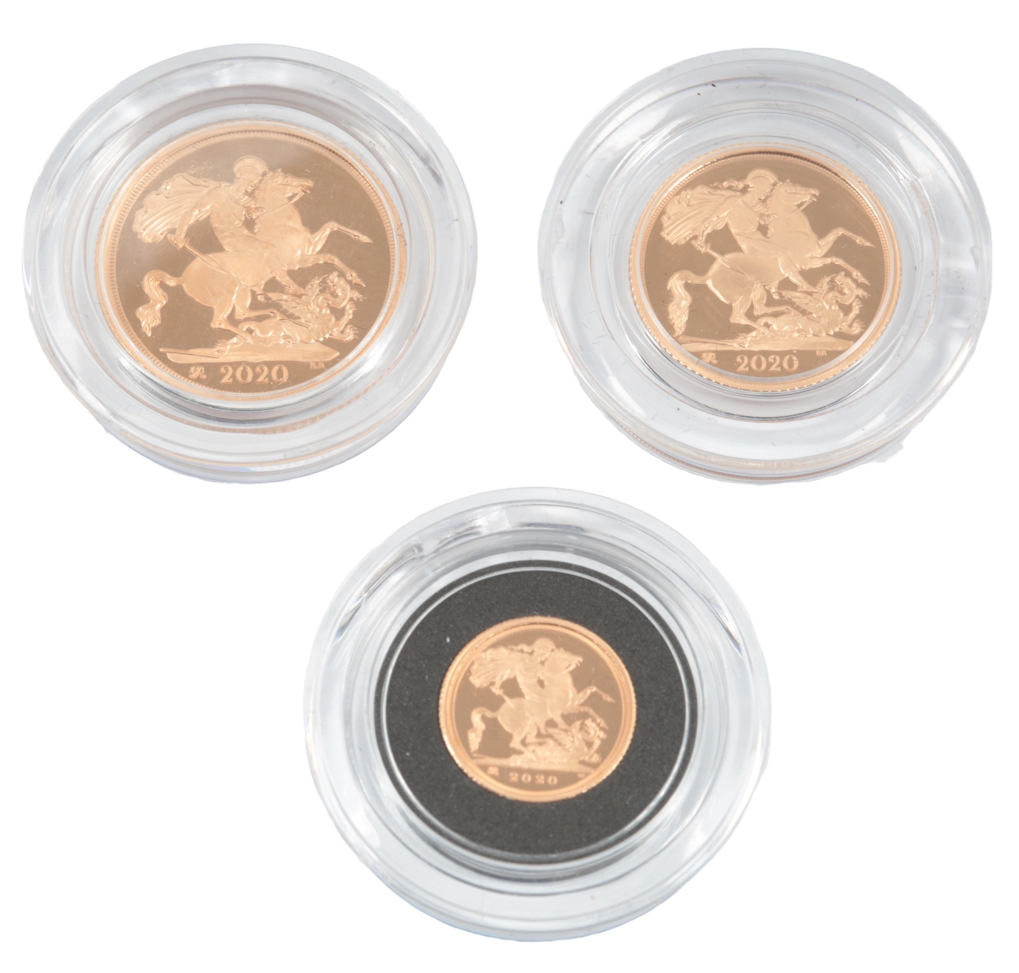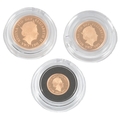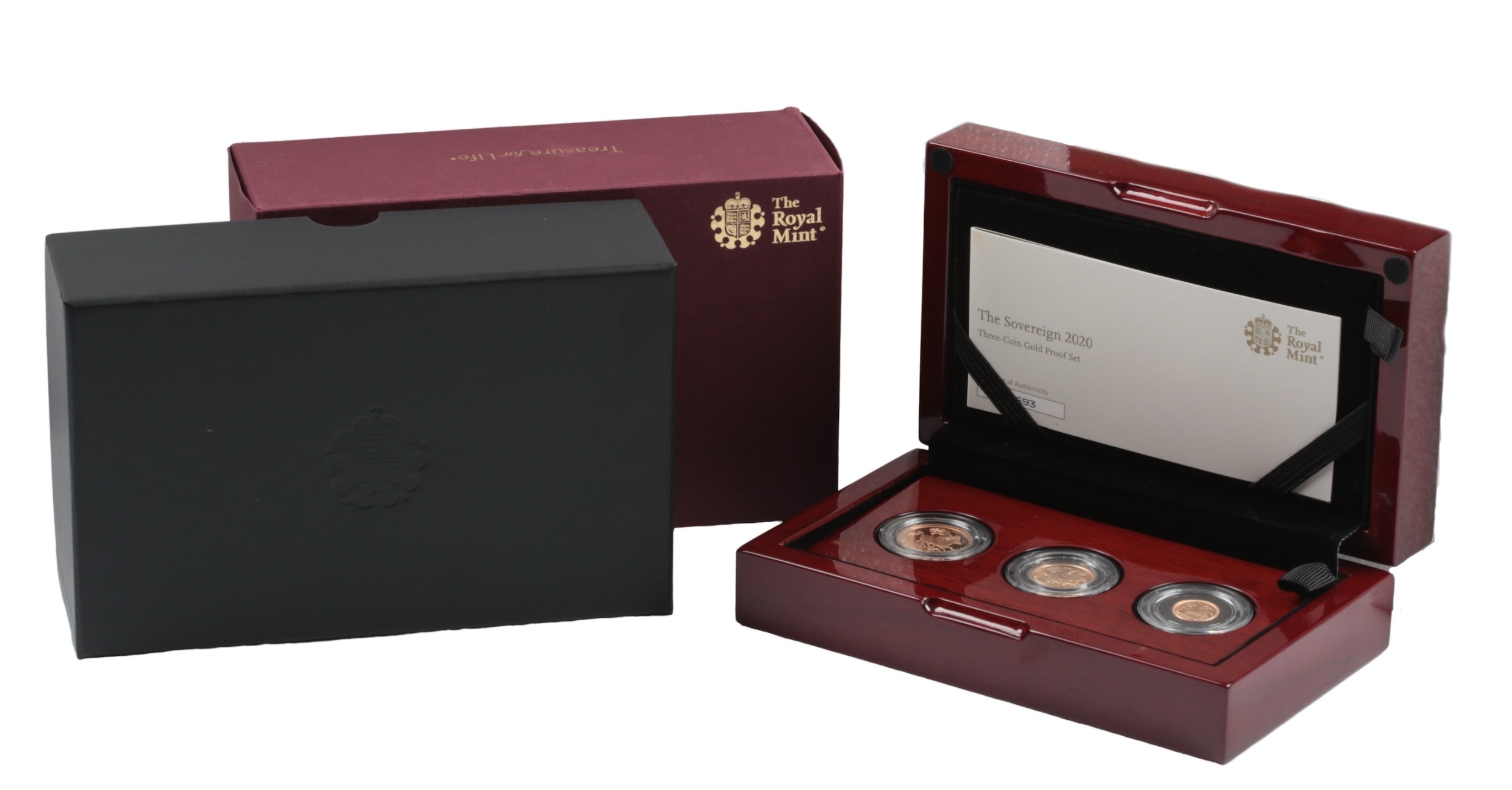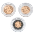 British gold coins, Elizabeth II, Royal Mint gold proof three coin set, 2020, comprising sovereign, half sovereign and quarter, in case of issue with certificate