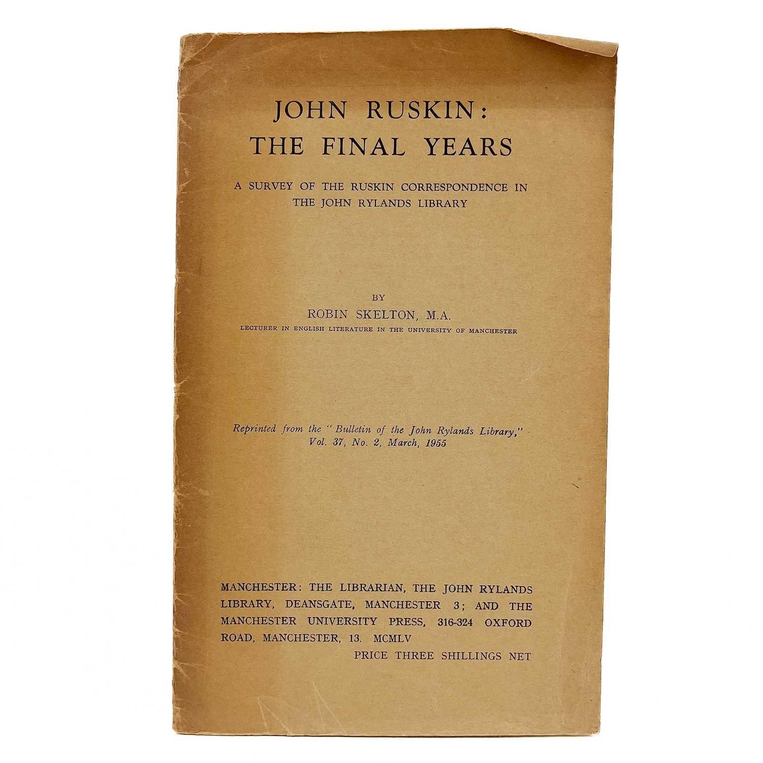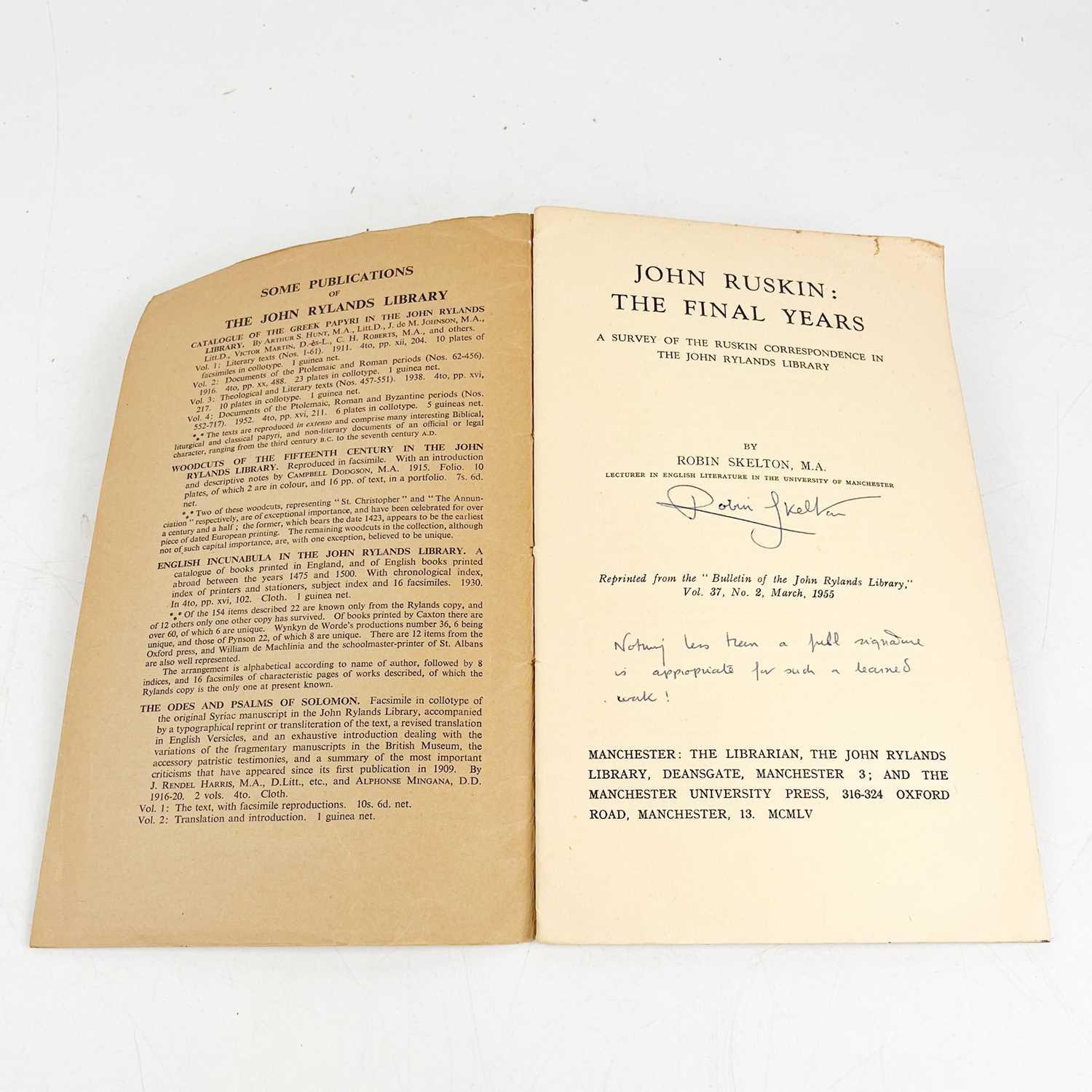 (Signed) SKELTON, Robin. John Ruskin: The final Years. A Survey of the Ruskin Correspondence in the John Rylands Library,' Flat signed and inscribed 'Nothing less than a full signature is appropriate for such a learned work!' to title page, reprinted from the Bulletin of the John Rylands Library vol.37, original printed thin card wraps, toning throughout, pp.24 numbered as 562-586, The Librarian, The John Rylands Library, Manchester University Press, 1955. Robin Skelton (1925-1997) was a renowned British-born Canadian poet, writer, and scholar known for his contributions to the fields of poetry, literary criticism, and the promotion of the arts.