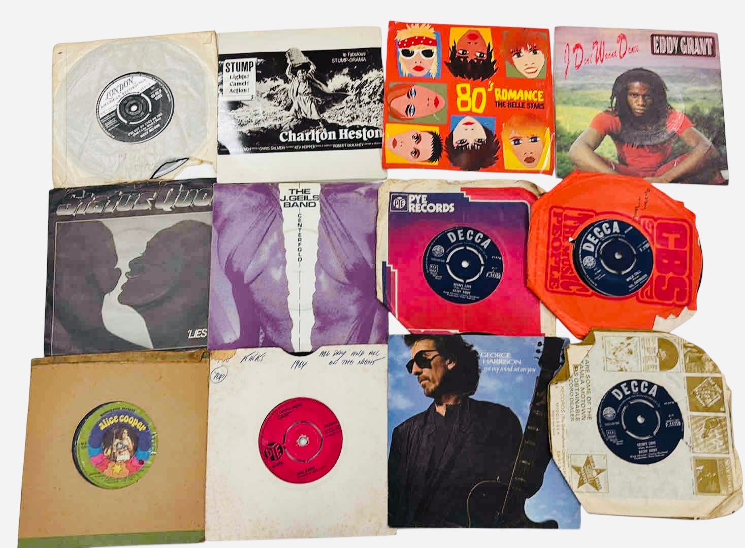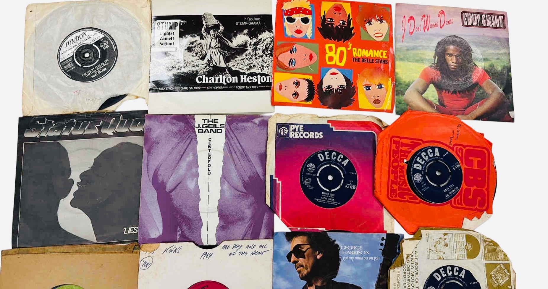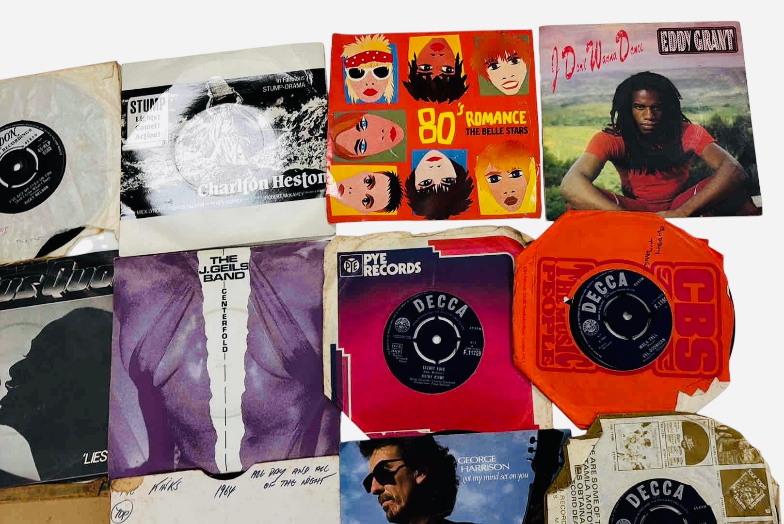 A group of 7-inch vinyl single records, various artists and labels including Decca, Pye and London, with assorted original paper sleeves including The Belle Stars “80’s Romance” and George Harrison.