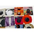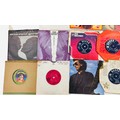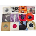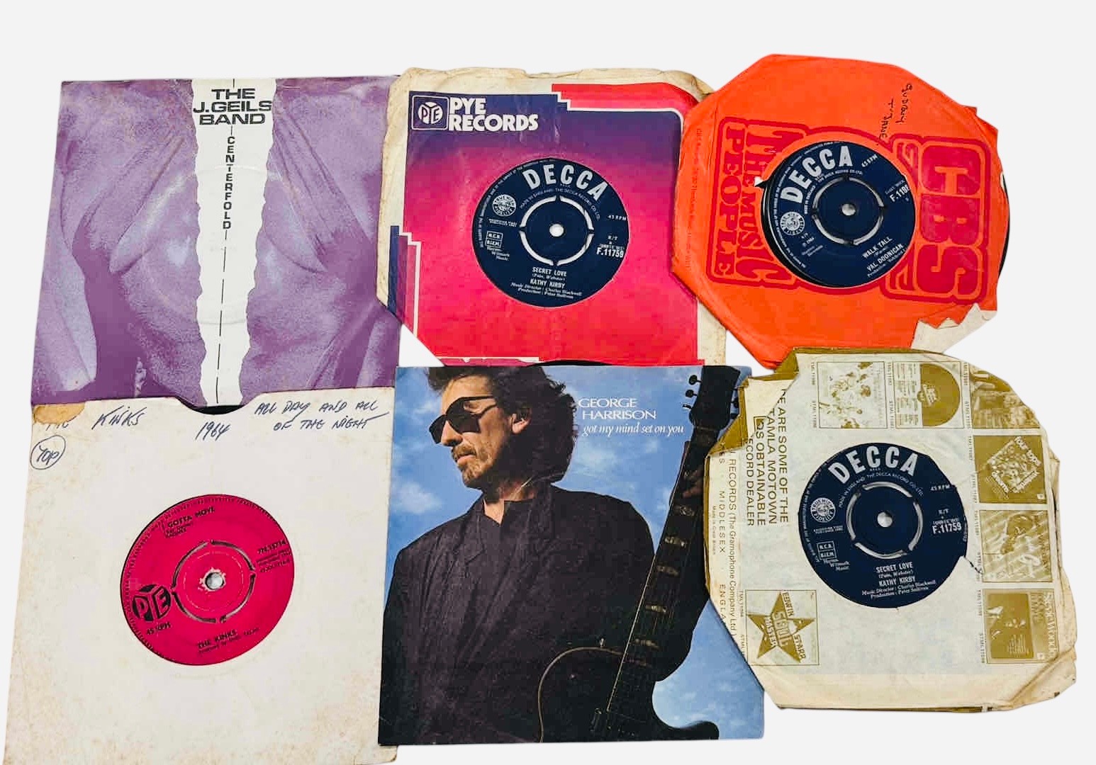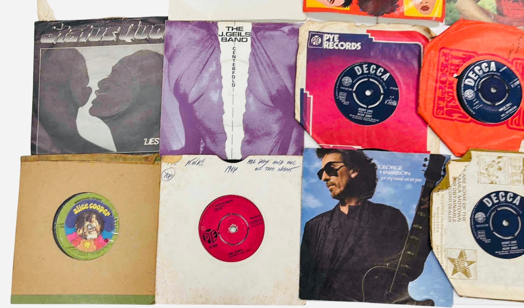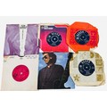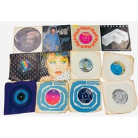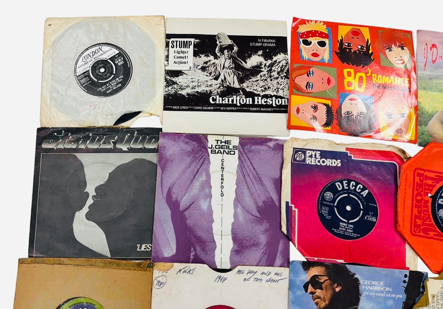 A group of 7-inch vinyl single records, various artists and labels including Decca, Pye and London, with assorted original paper sleeves including The Belle Stars “80’s Romance” and George Harrison.