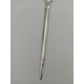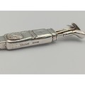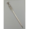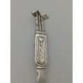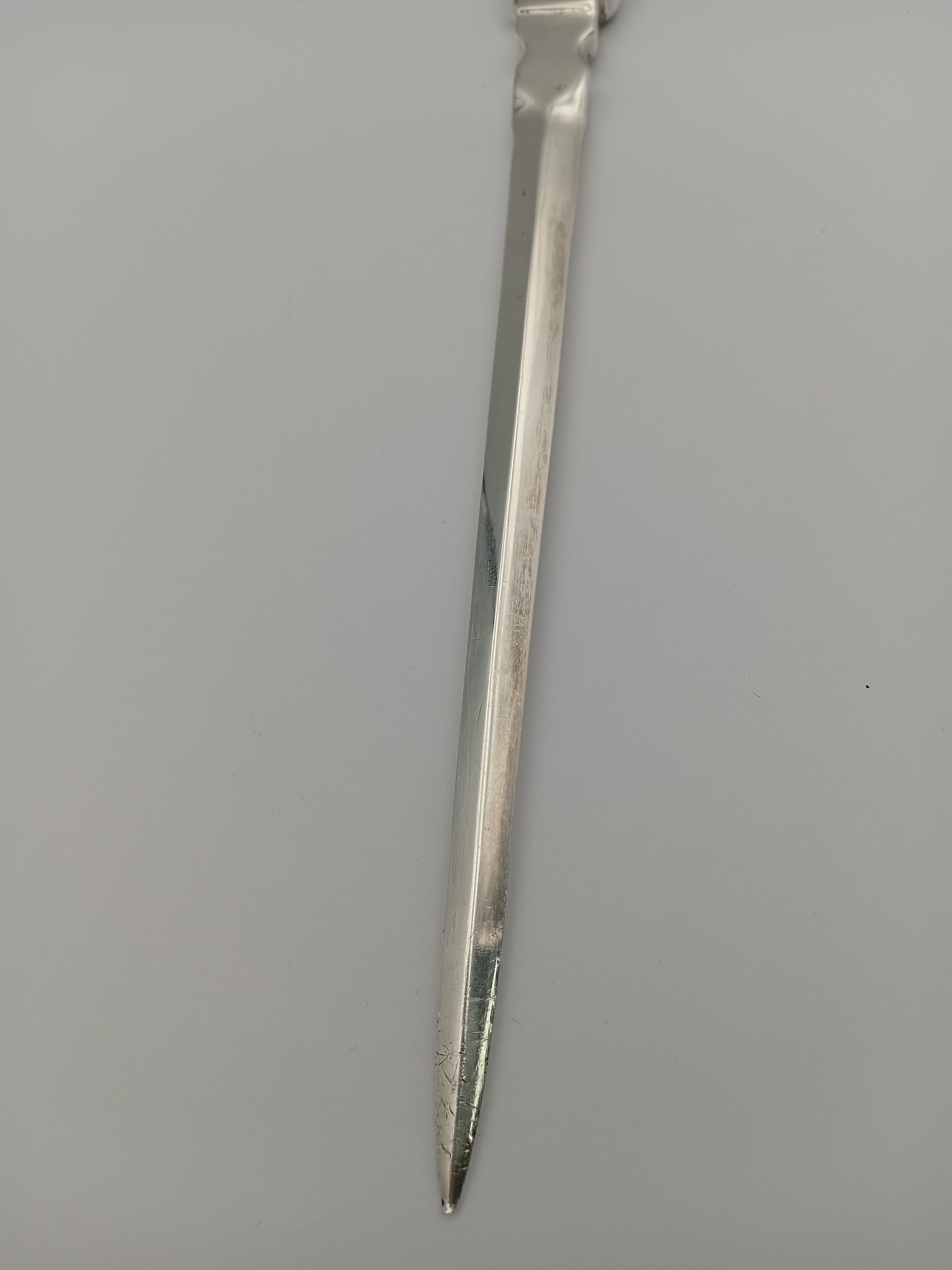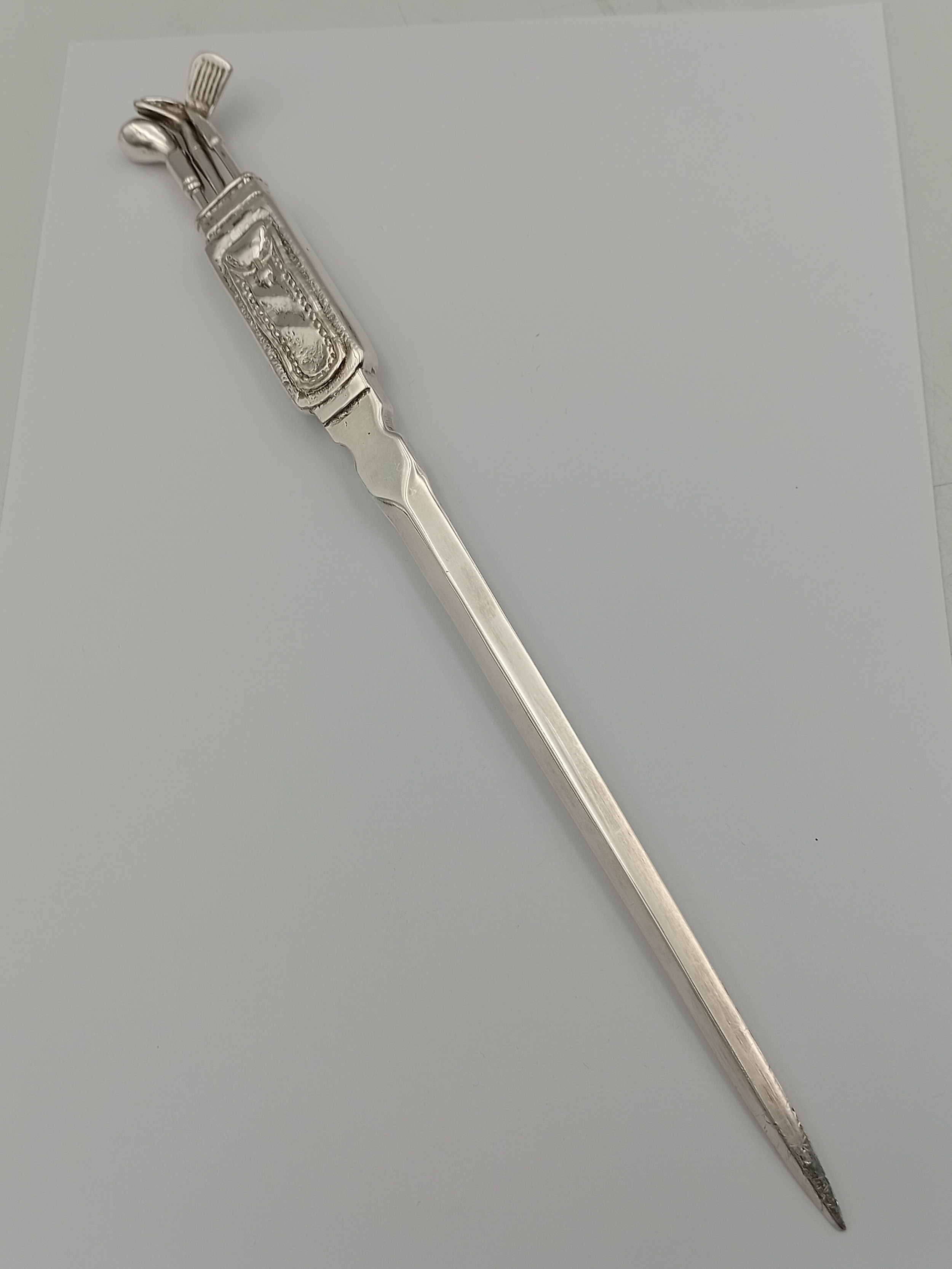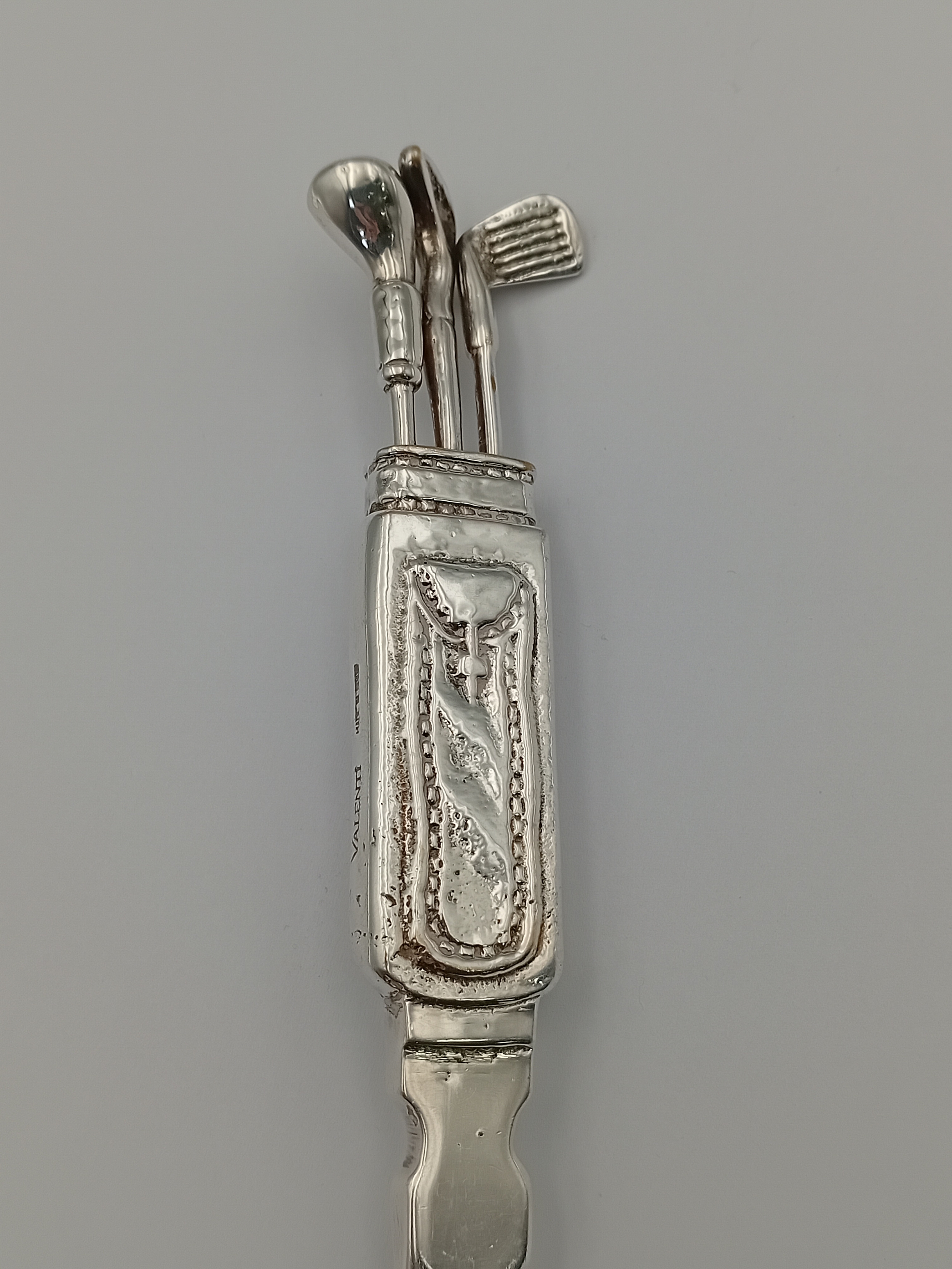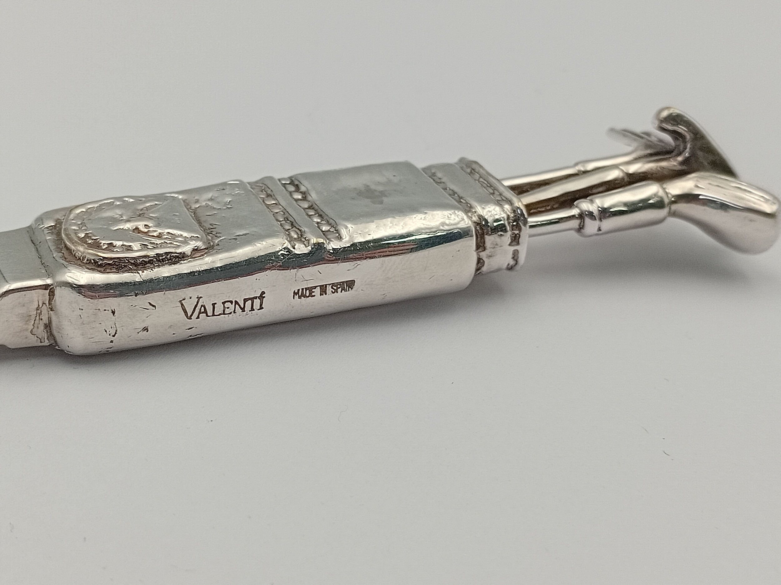 A large white metal letter opener, decorated with golf clubs and marked Valenti made in Spain. Length 11.5"