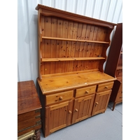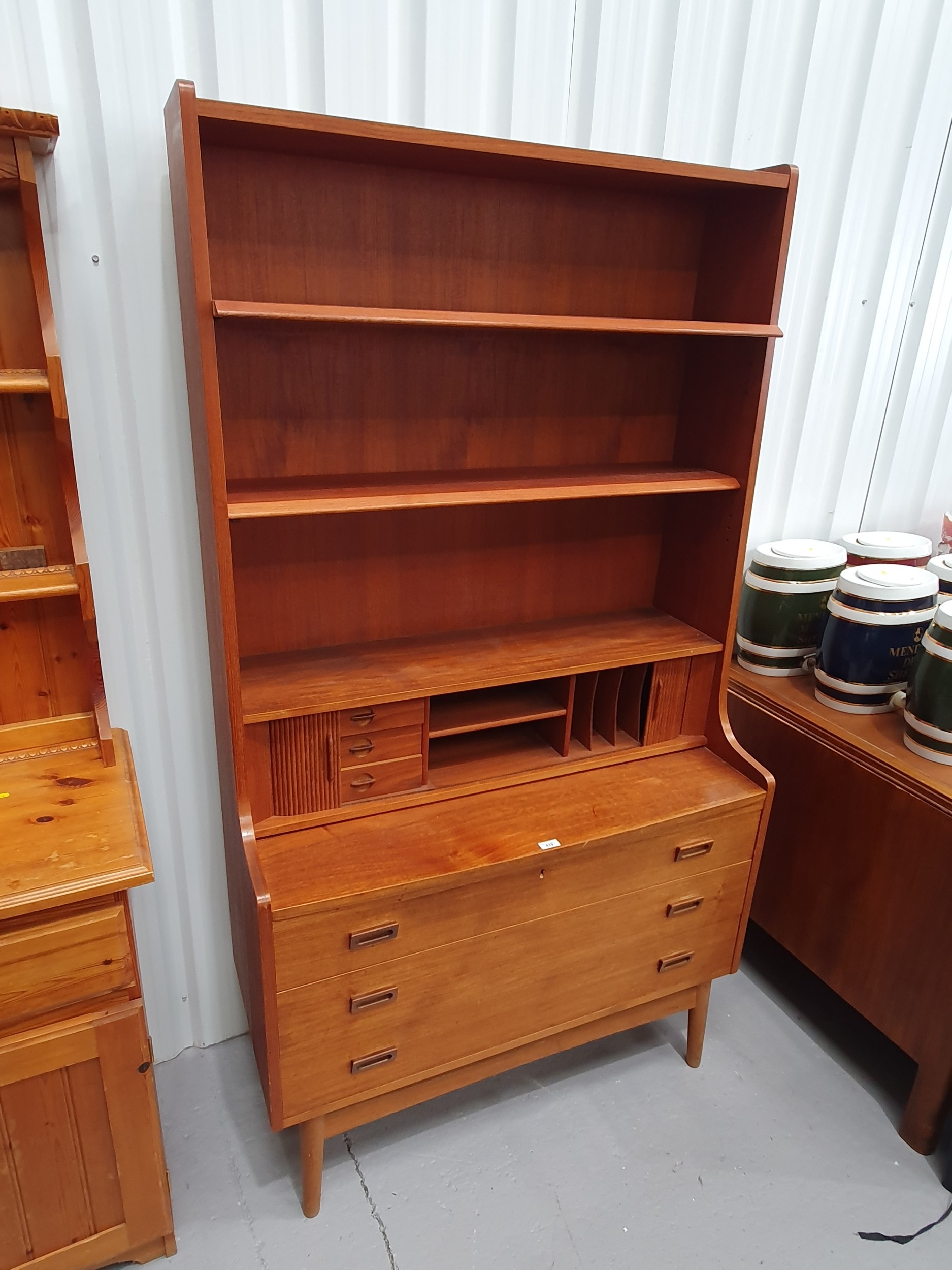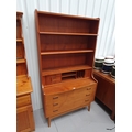 A Danish mid-Century teak Dresser stamped BM made in denmark to the back, fitted adjustable shelves above a tambour sliding cover revealing drawers and pigeon holes above three drawersraised on turned supports (R7)
