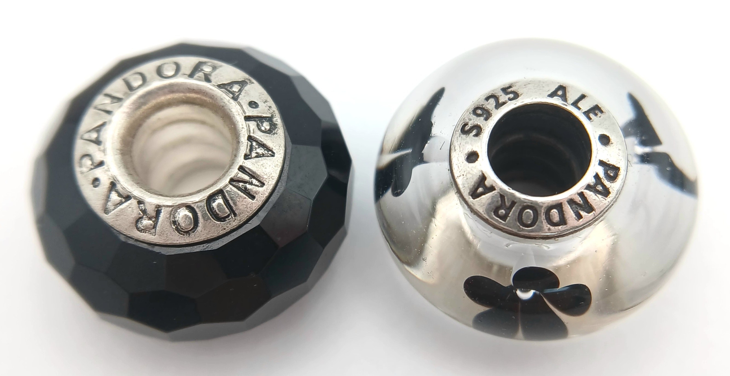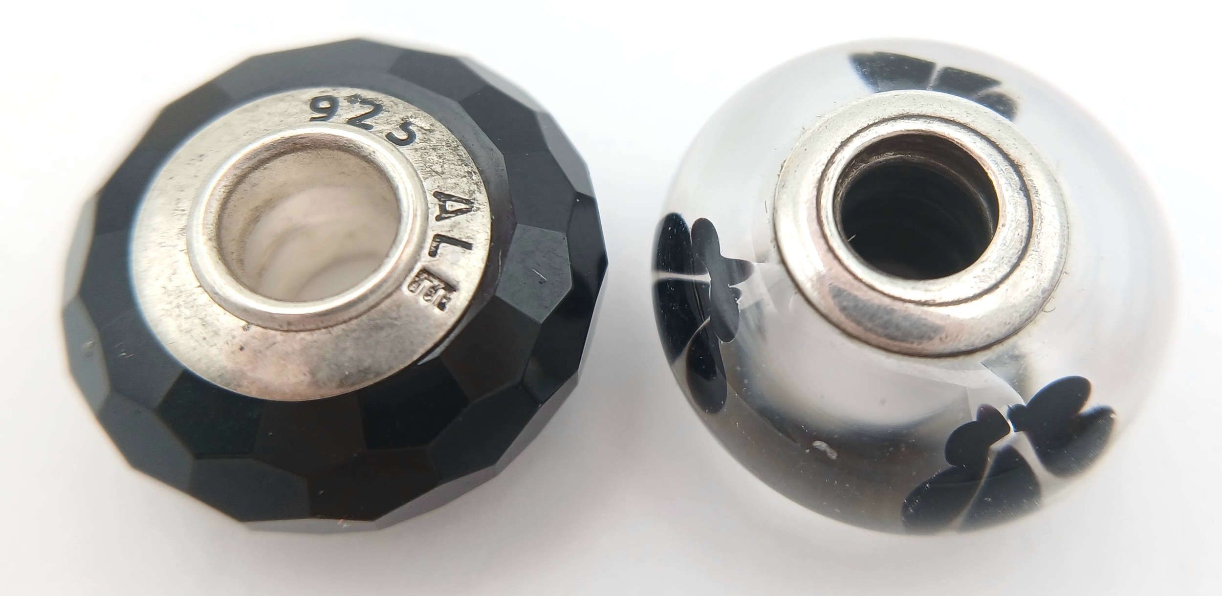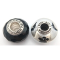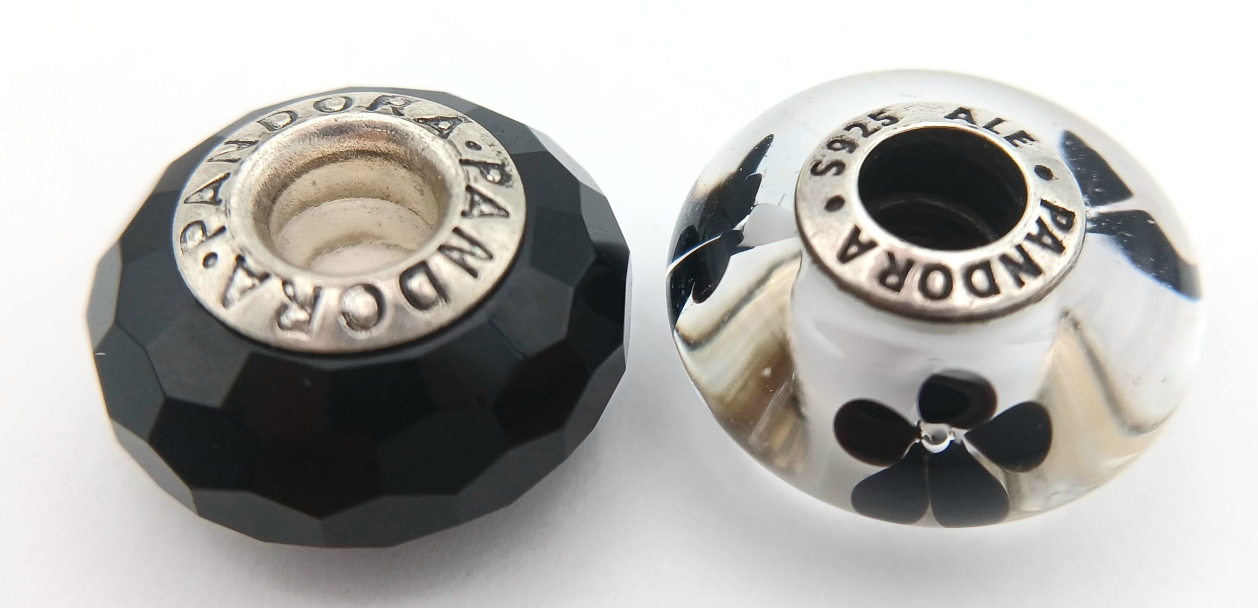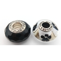 A PAIR OF PANDORA, STERLING SILVER CHARMS. BLACK MURANO GLASS AND BLACK CHERRY BLOSSOM MURANO GLASS. 5.6G. S/A 1157 - 1