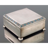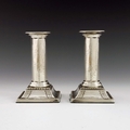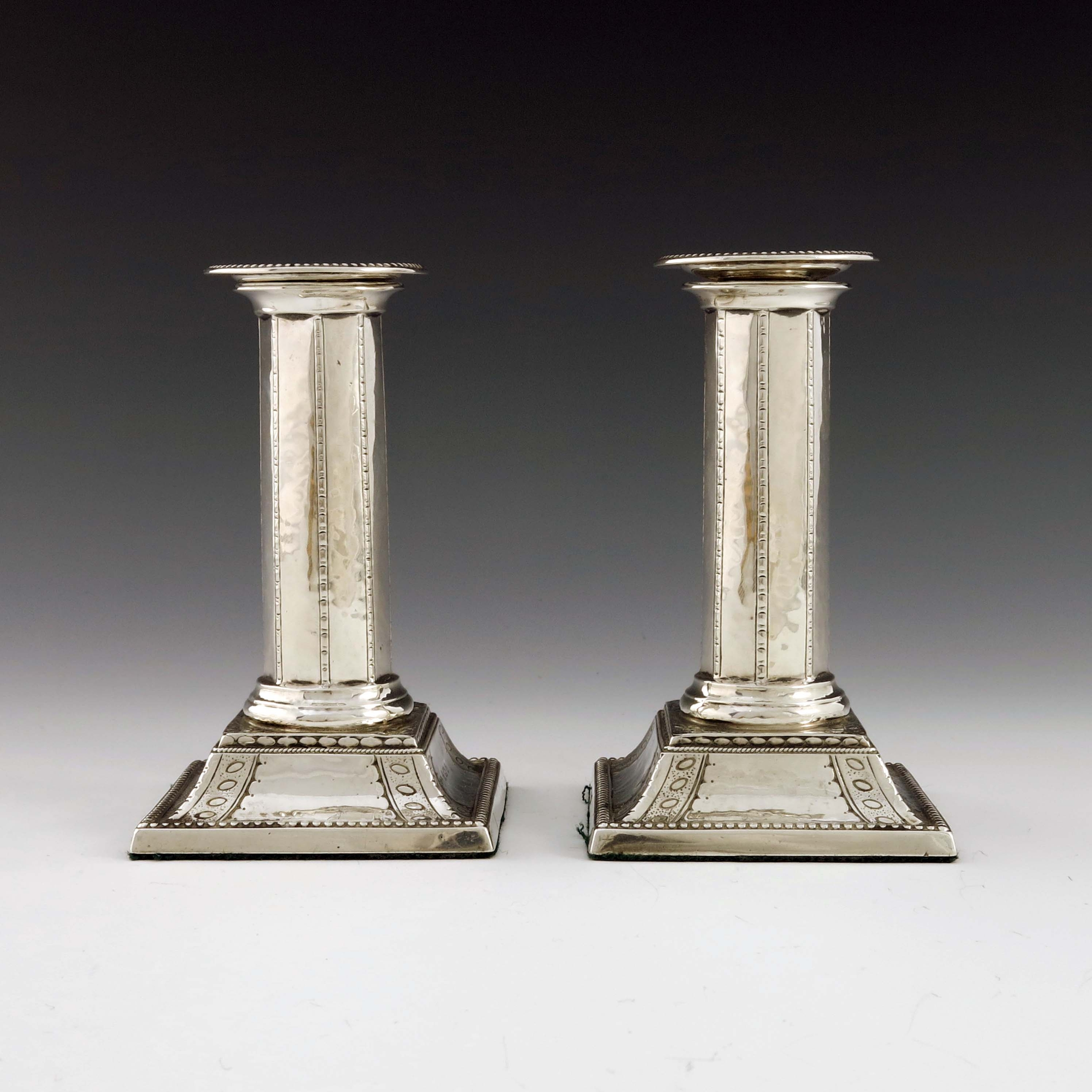 Bernard Cuzner for Liberty and Co., a pair of Arts and Crafts silver candlesticks, Birmingham 1911, octagonal Tuscan column form on sweeping square bases, engraved with bead and bar geometric bands, with raised beaded borders, weighted, 13.5cm high
