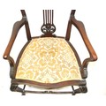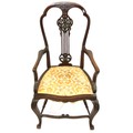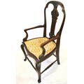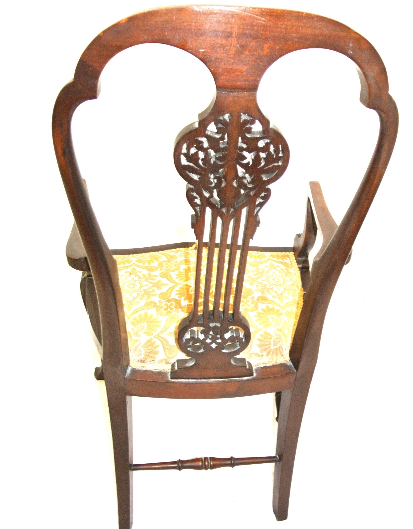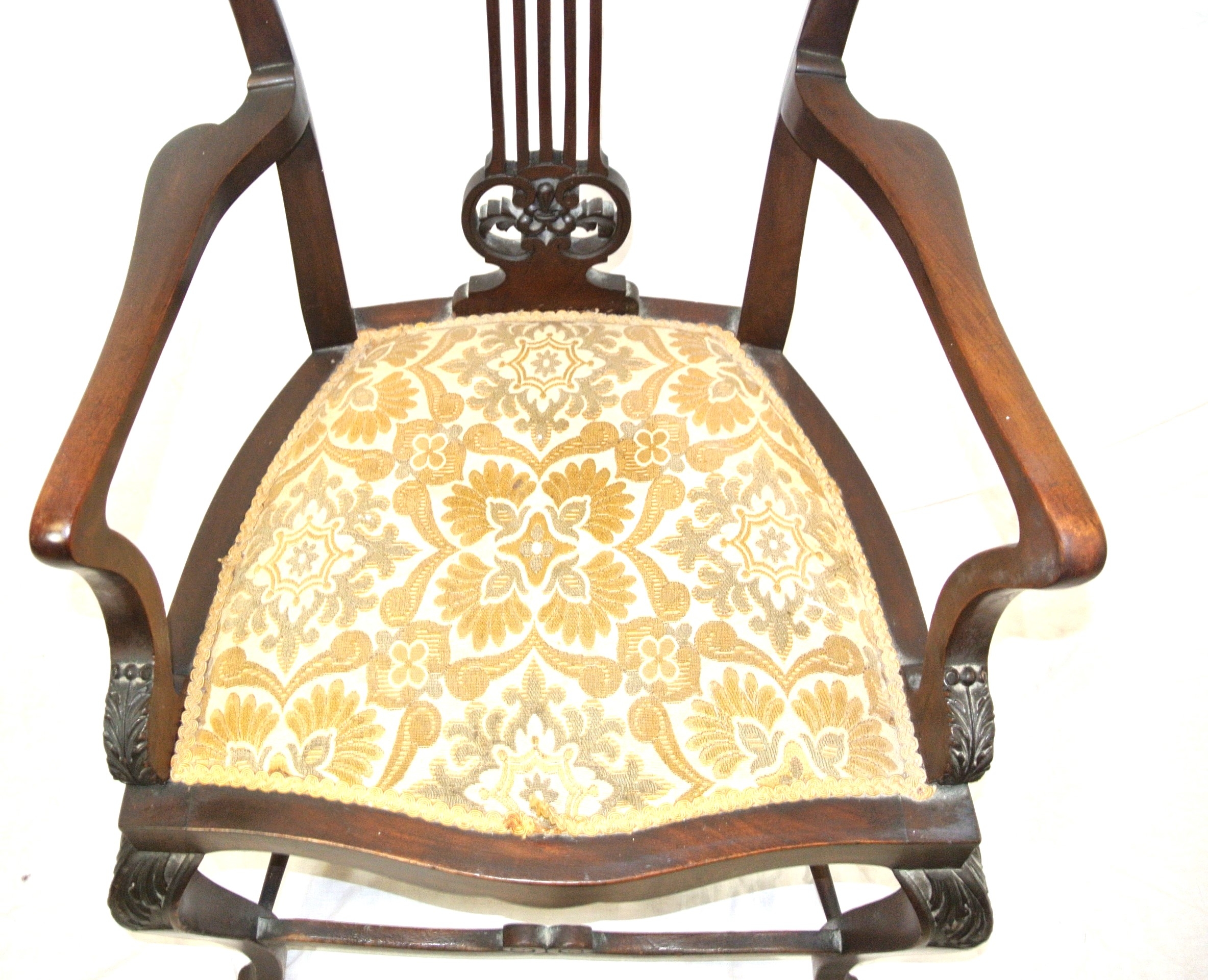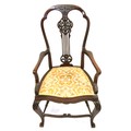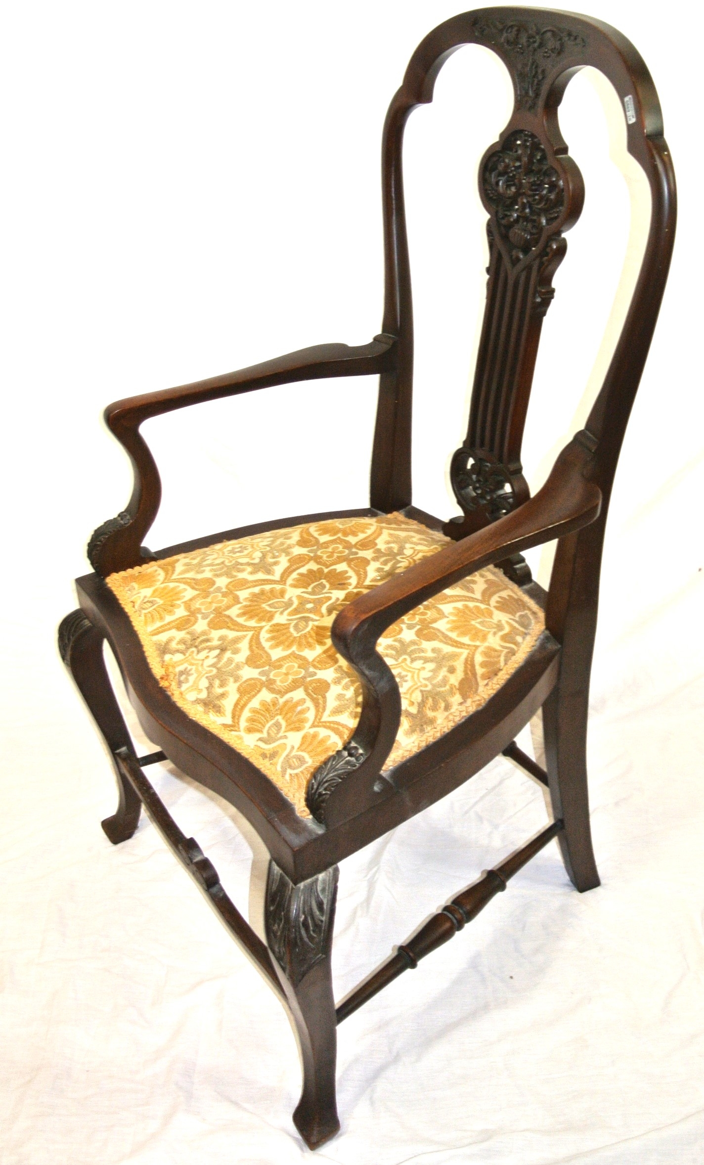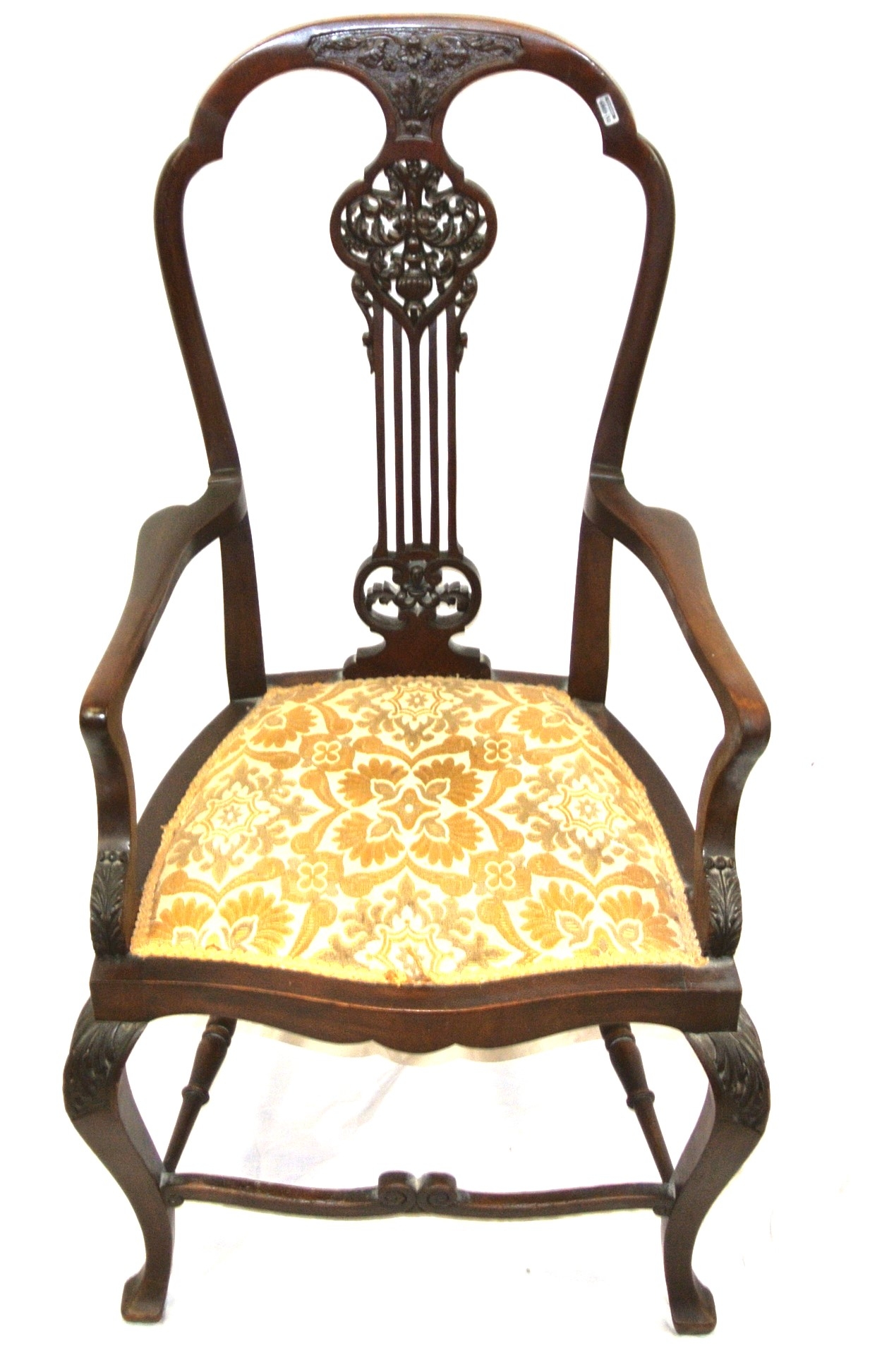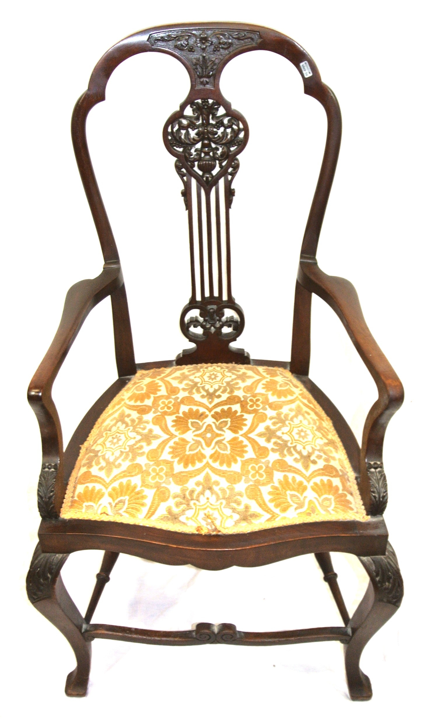 Victorian mahogany open armchair with foliate carved pierces splat, shaped arms and seat, on cabriole legs with stretchers