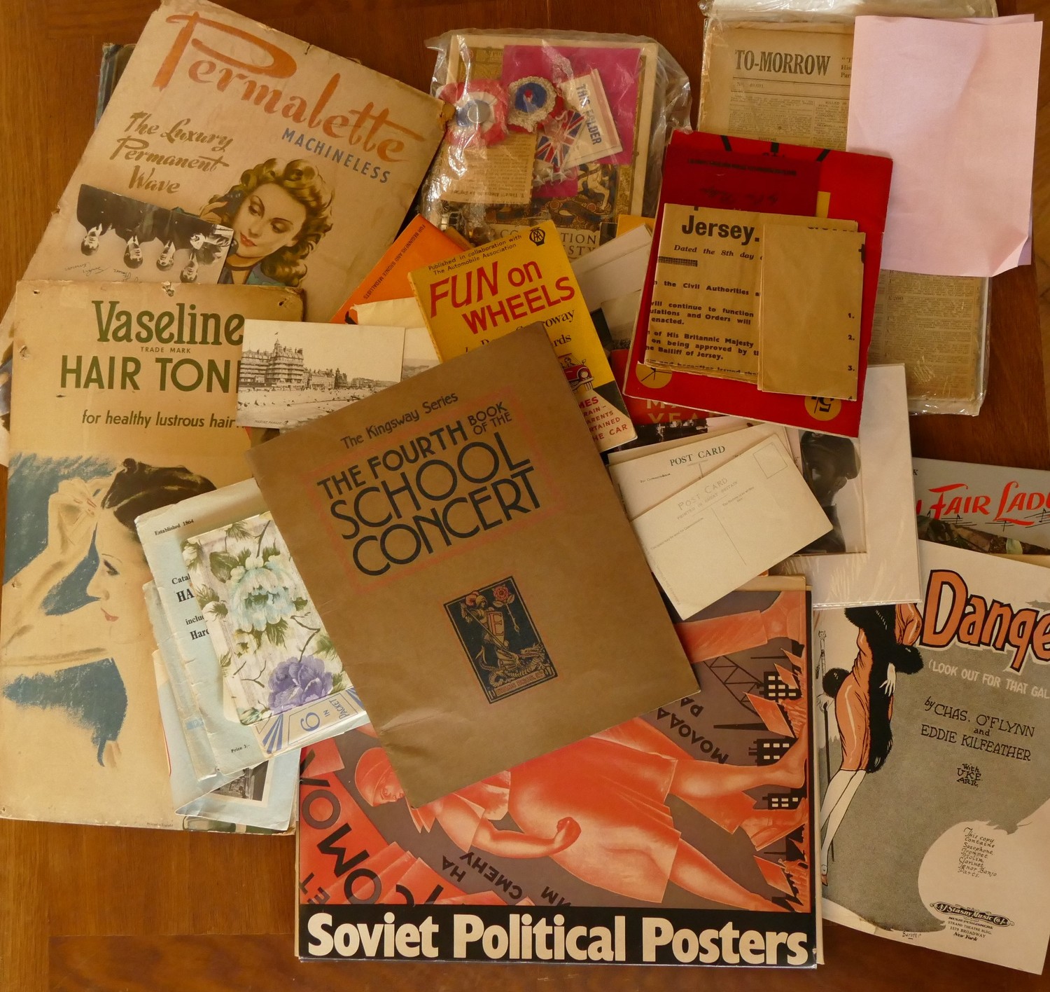 An early 20th century postcard album depicting humorous and wartime subjects together with, two hair product advertising signs, Queen Elizabeth Coronation programme, Times Illustrated 'History of the War" papers, etc