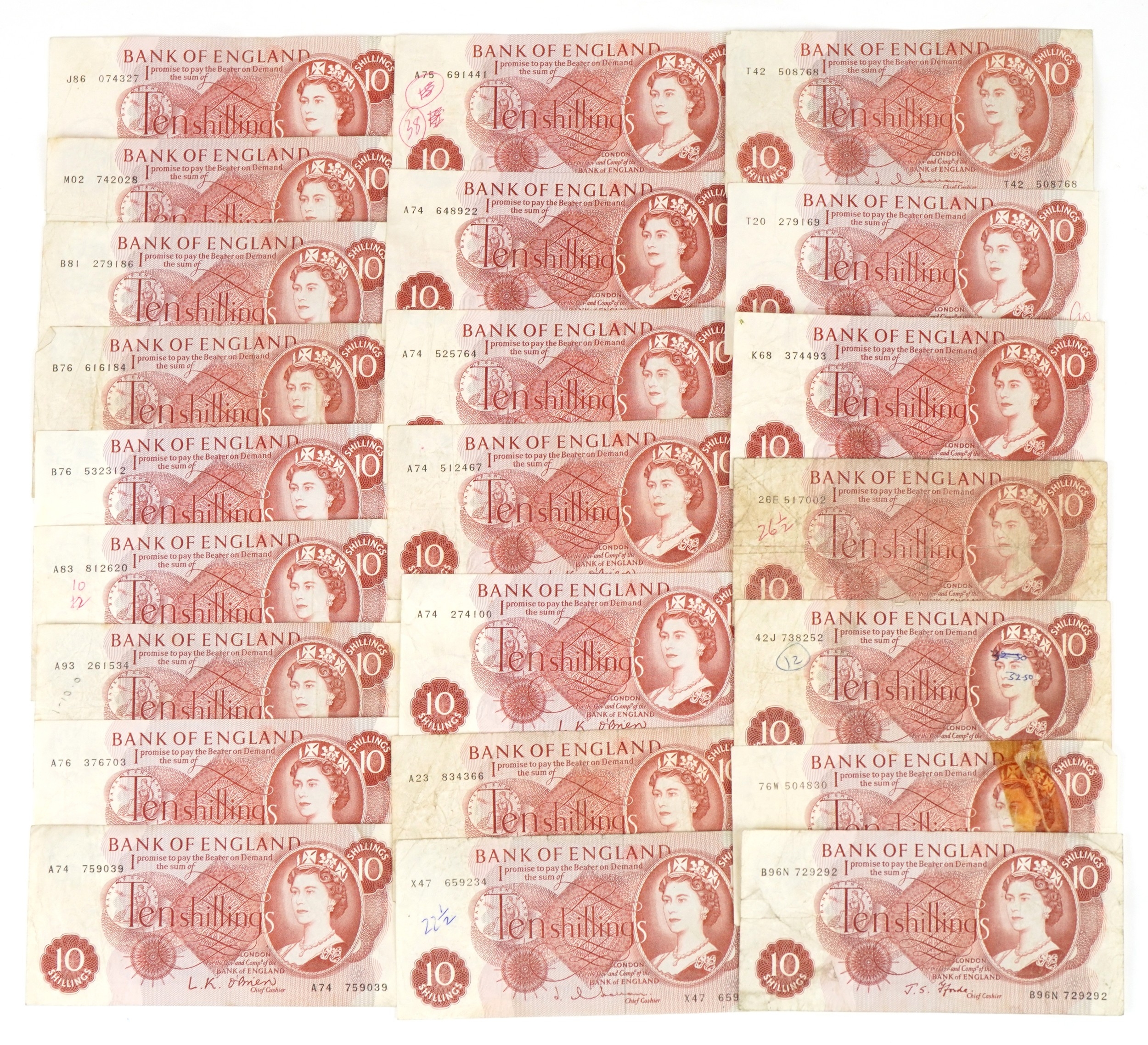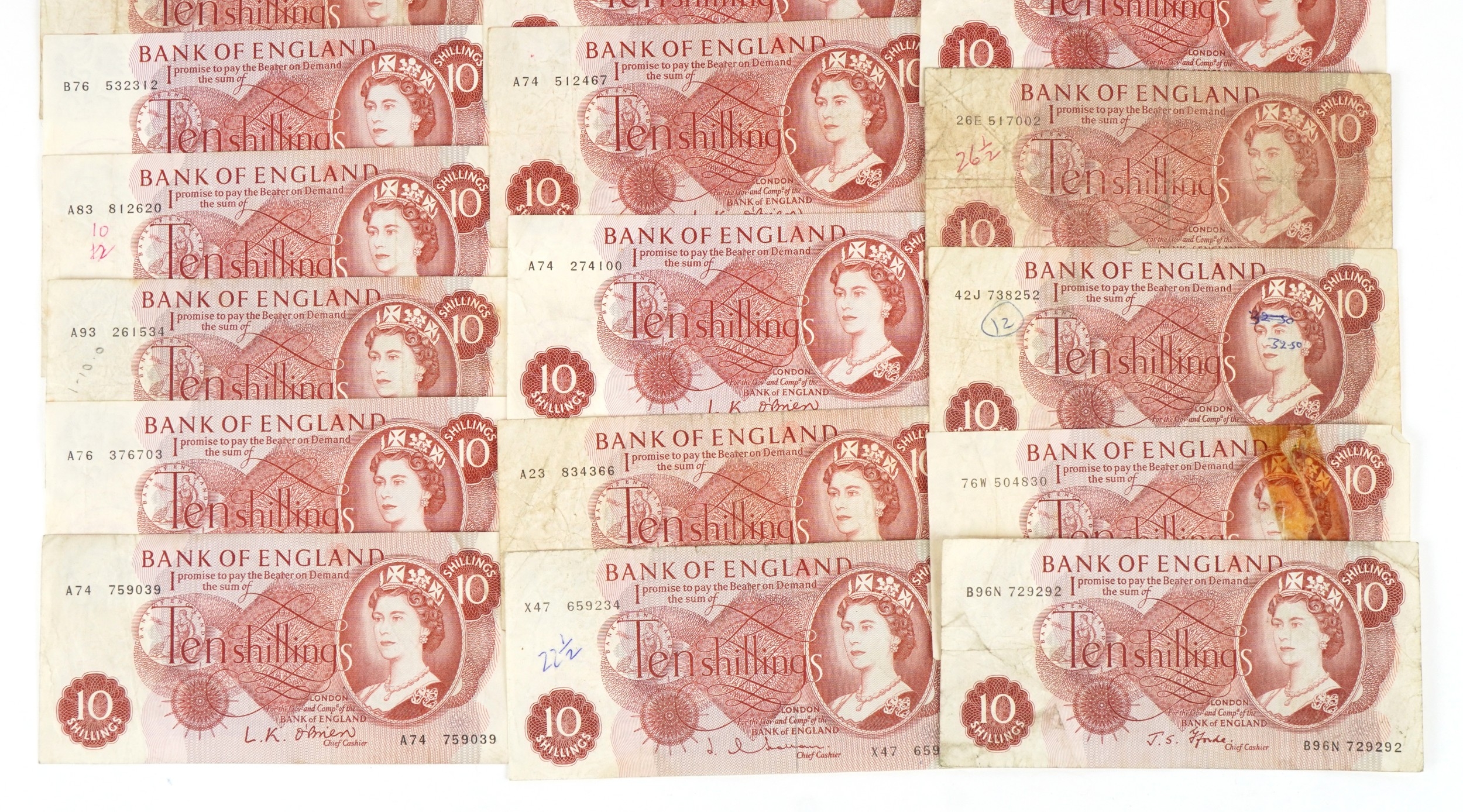 Twenty three Bank of England 1960s Portrait Issue ten shilling notes, various Chief Cashiers including L. K. O'Brien, J. Q. Hollom and J. S. Fforde.