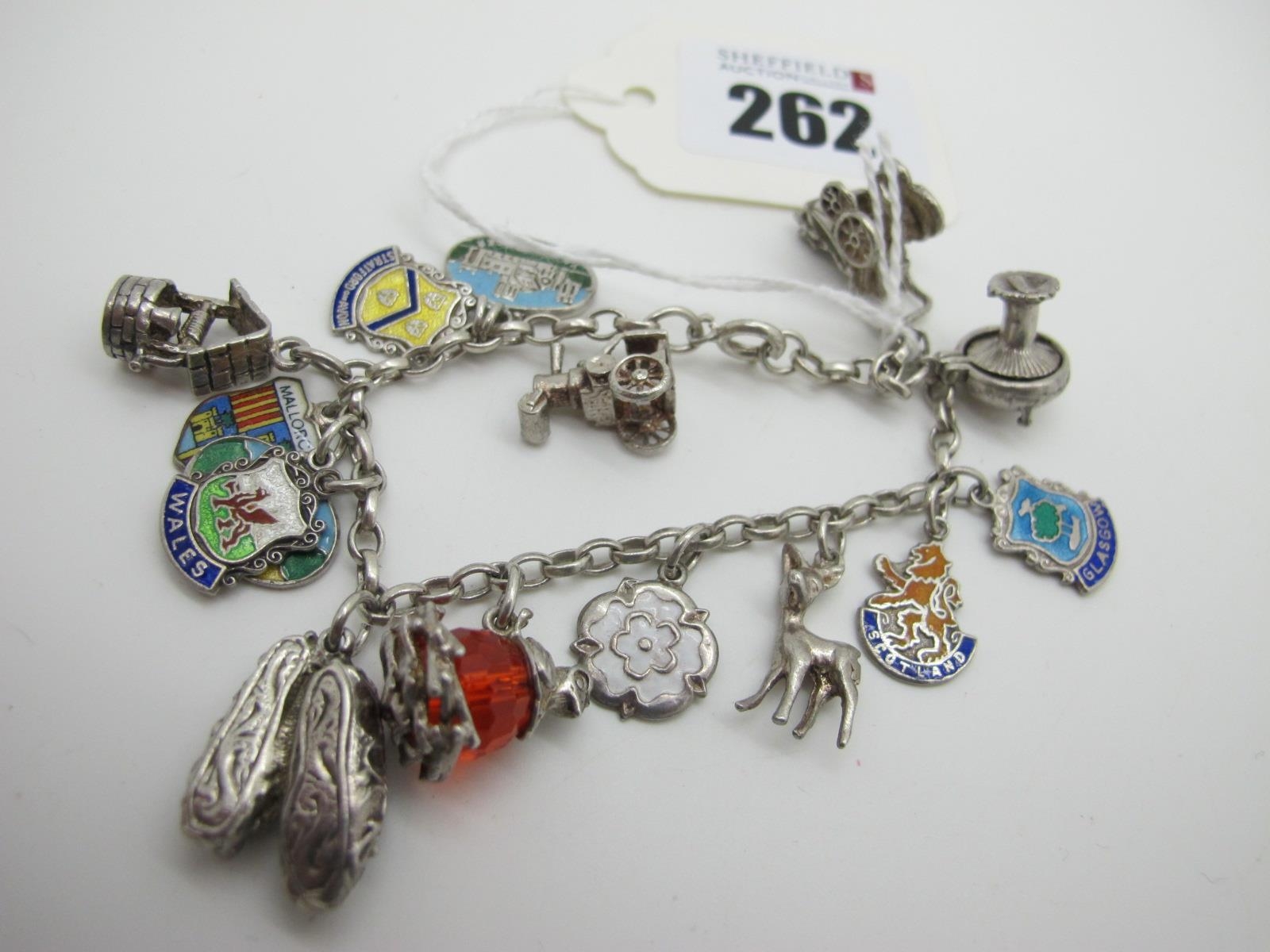 A Dainty Bracelet, suspending assorted novelty charm and souvenir pendants.
