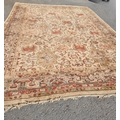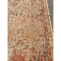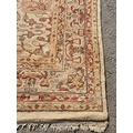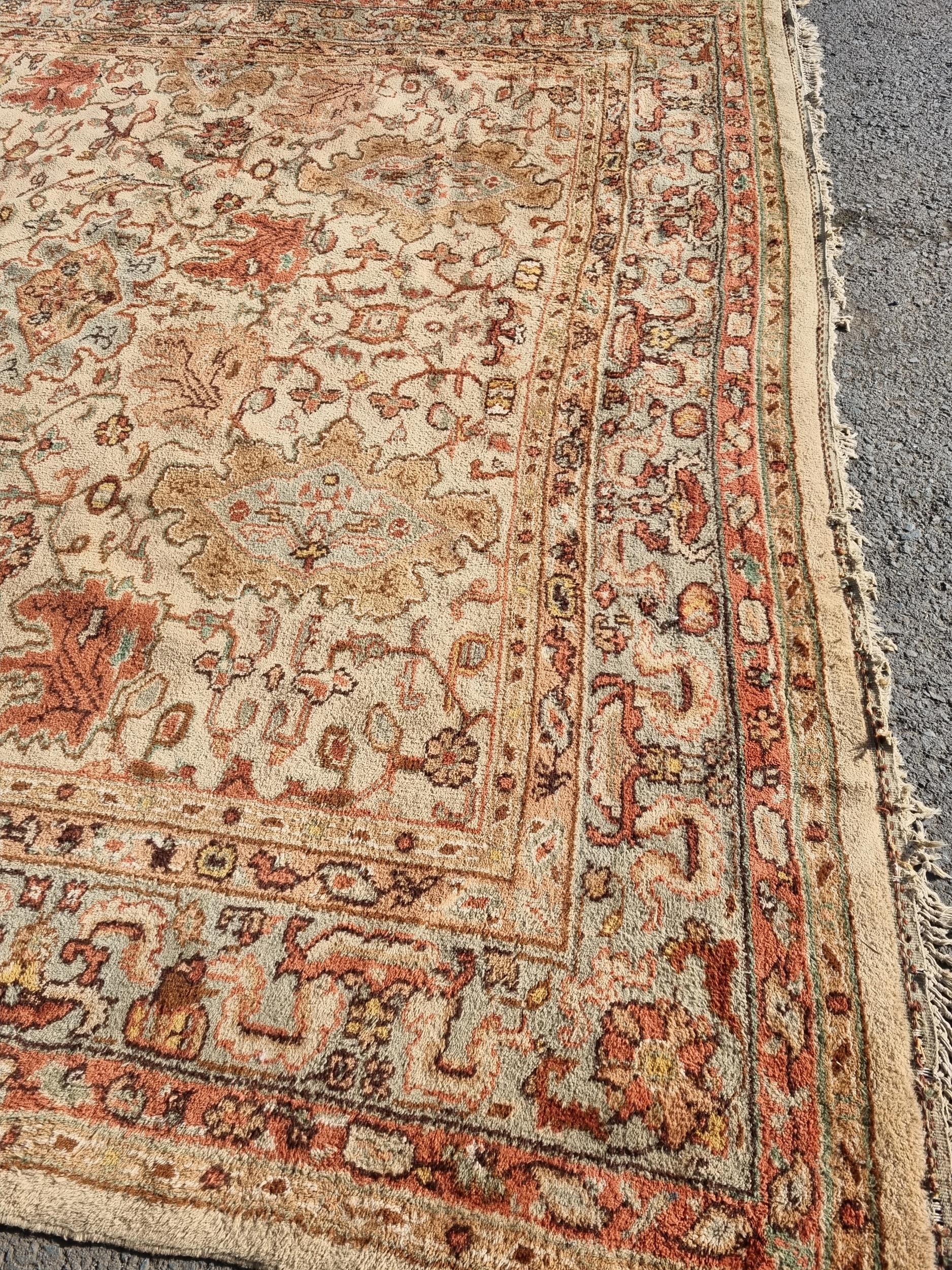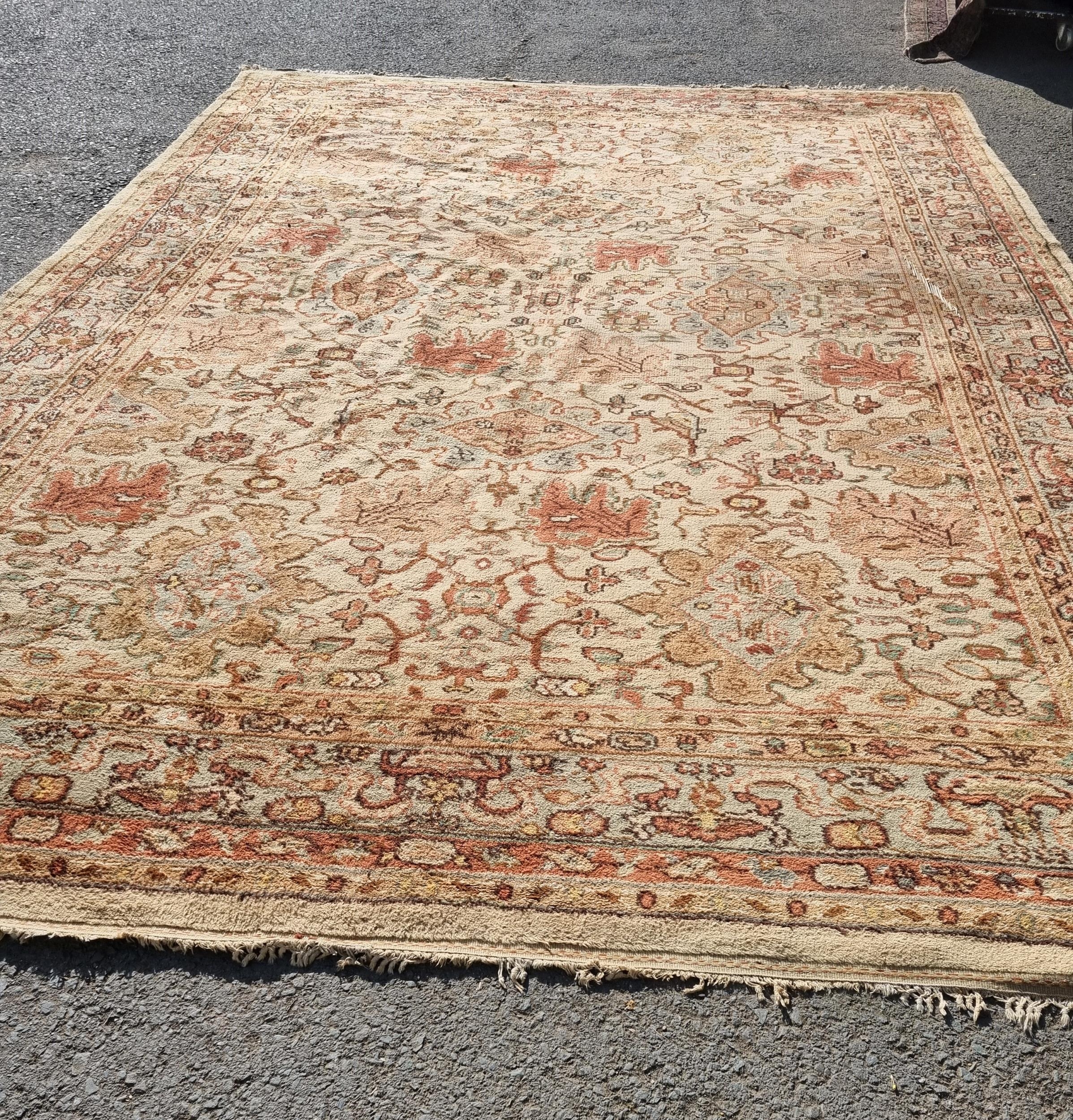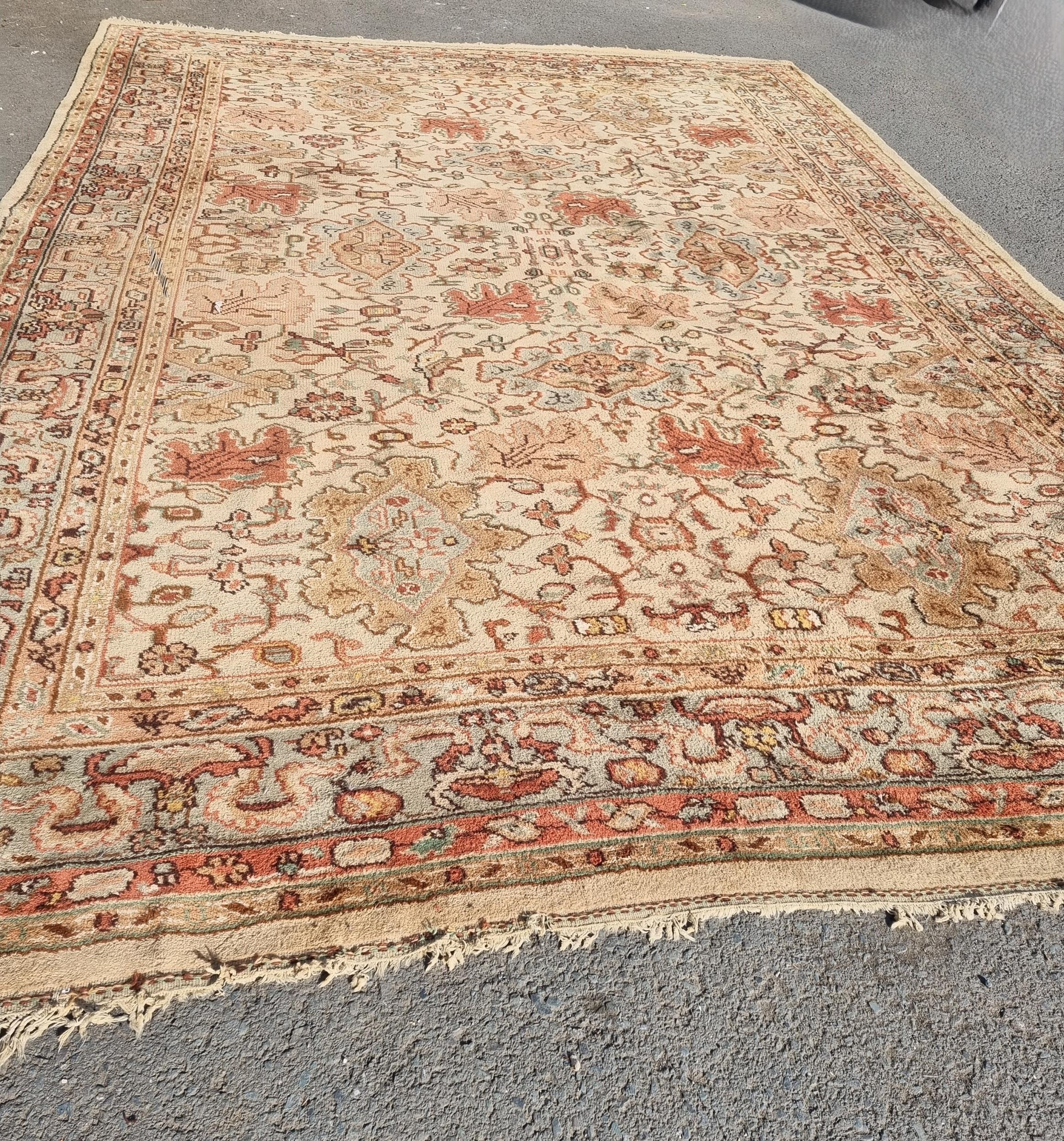 A bordered Persian style Carpet, the central field with rust palmettes on a cream ground, pale green ground to the main border, 15ft x 10ft, well worn