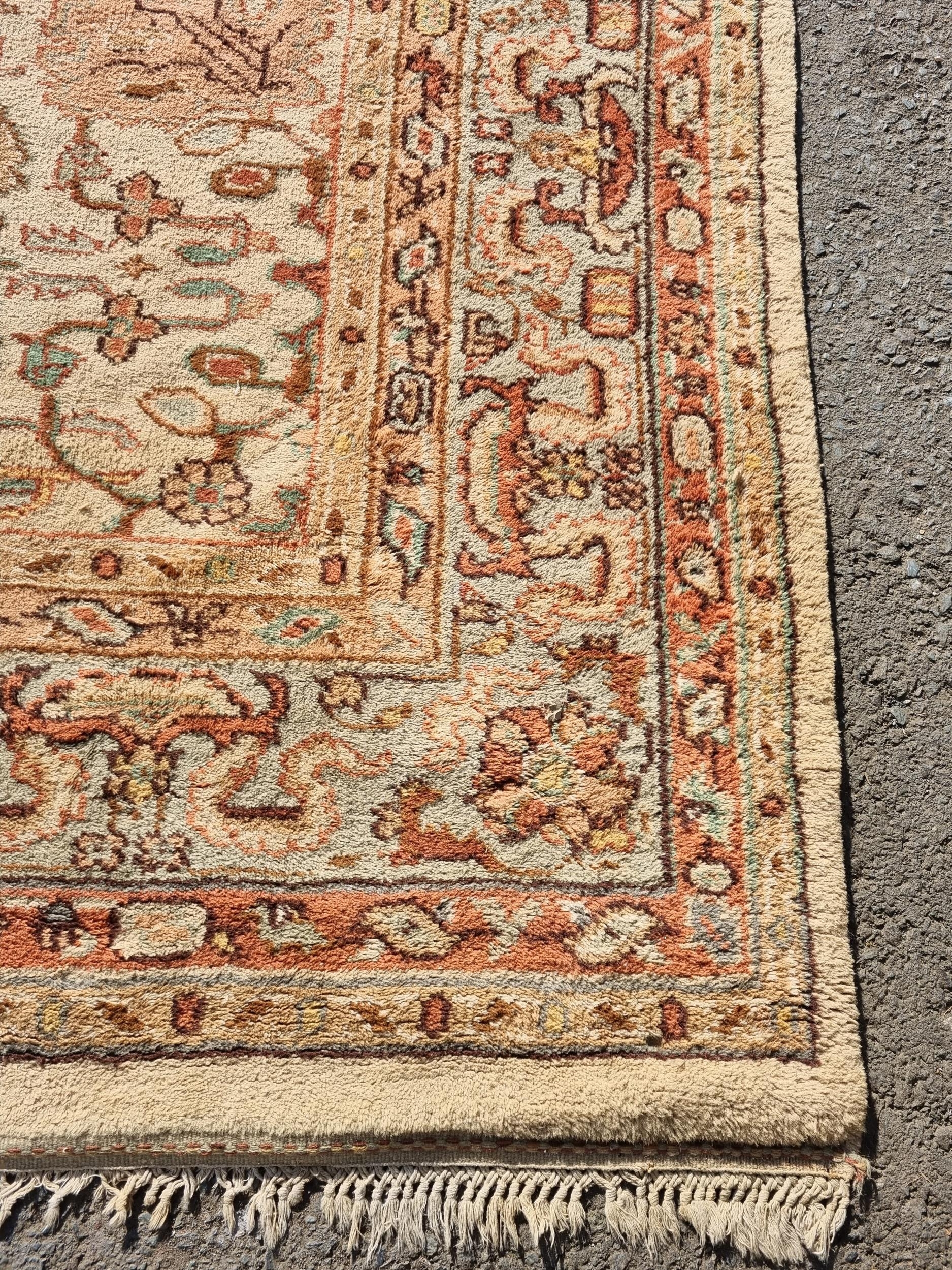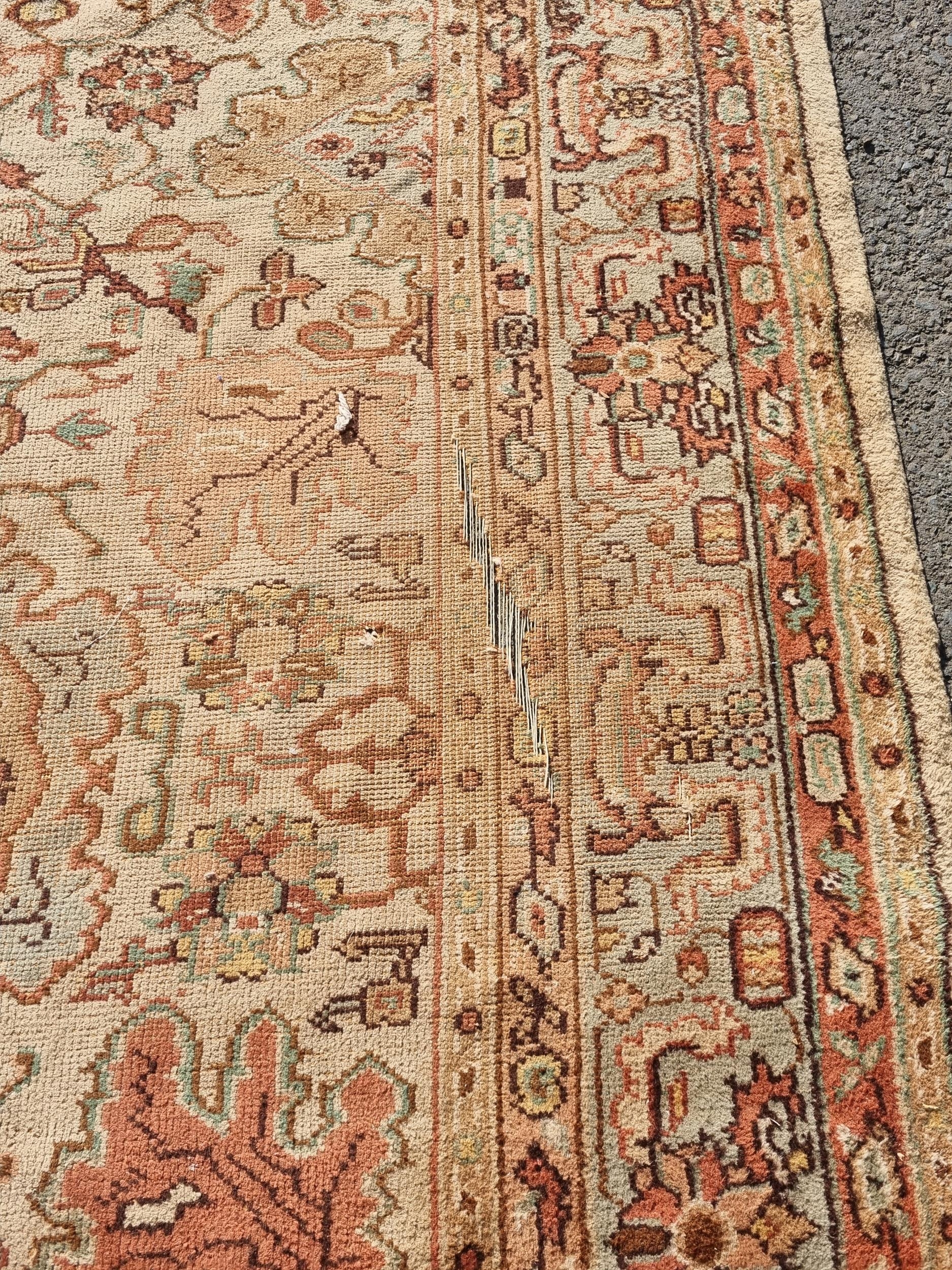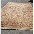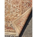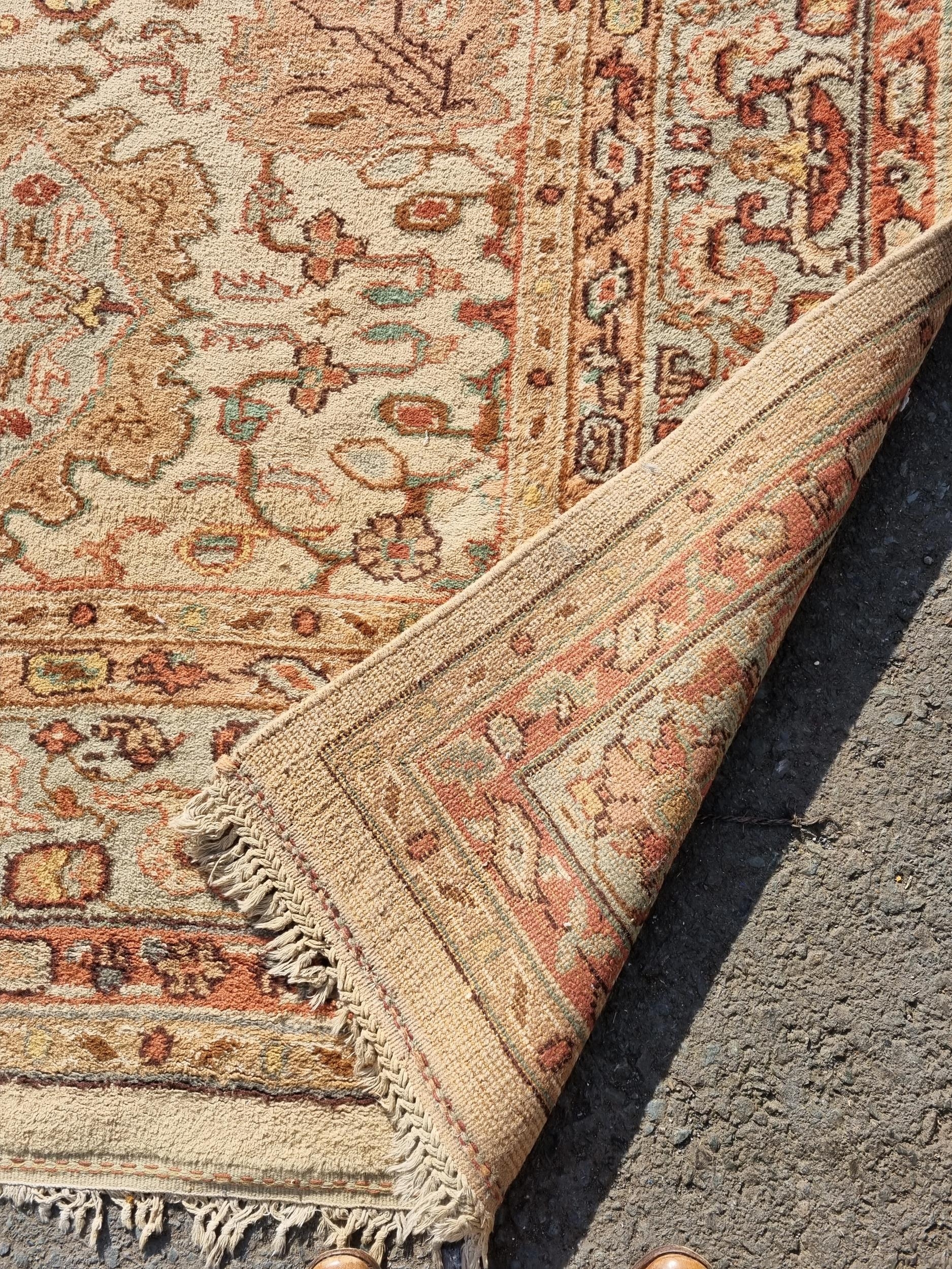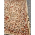 A bordered Persian style Carpet, the central field with rust palmettes on a cream ground, pale green ground to the main border, 15ft x 10ft, well worn