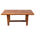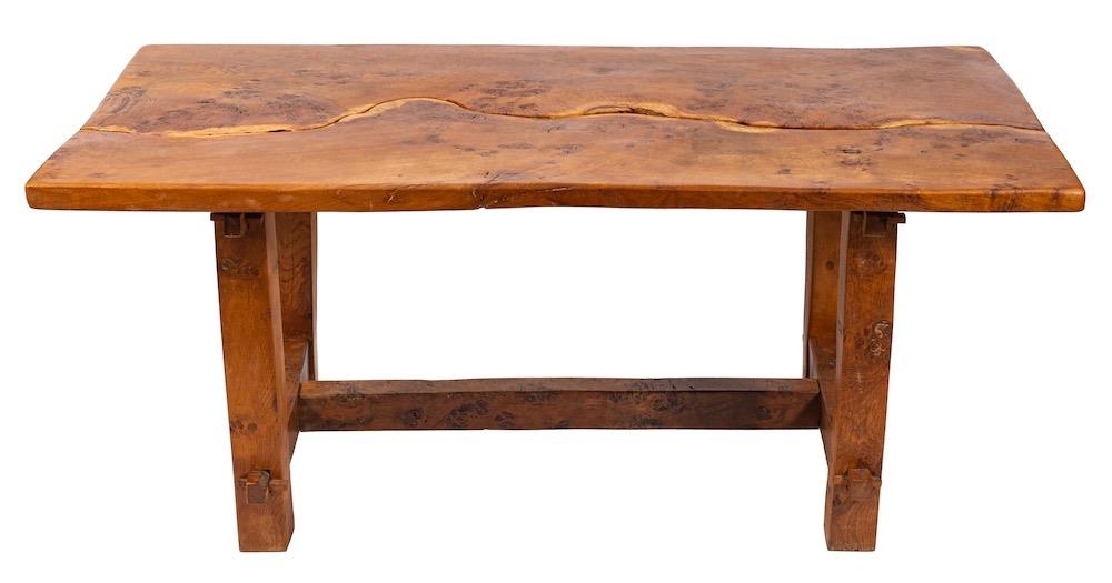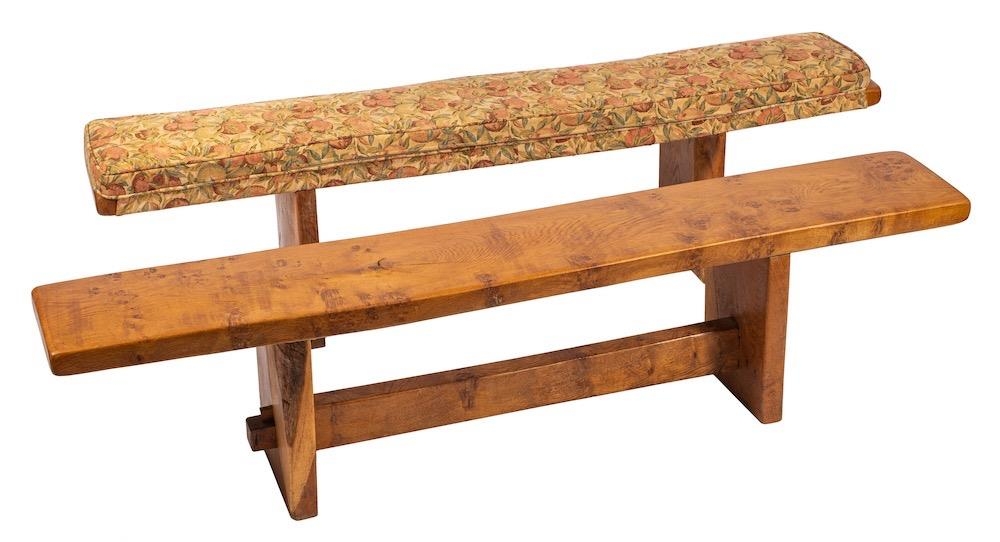 An oak refectory table and two matching benches, by Robert Parker; constructed from Devon oaks felled during the storm of 1987; the rectangular table 81cm high, 187cm long, 99cm wide; the benches 45cm high, 181cm long