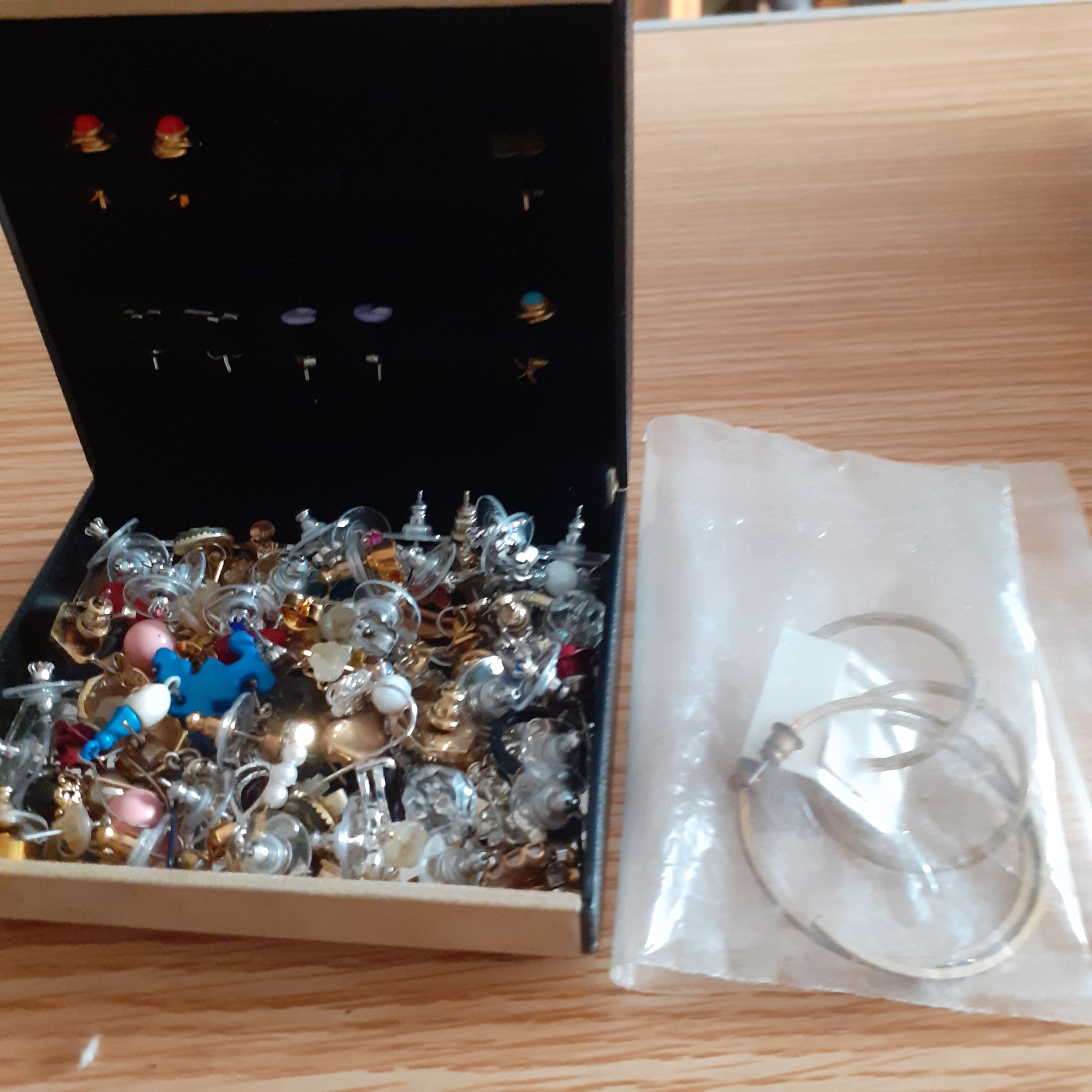 Large quantity of earrings. Lots are paired, some odd. Mostly very nice condition. Mix of mostly studs and hanging, modern and vintage