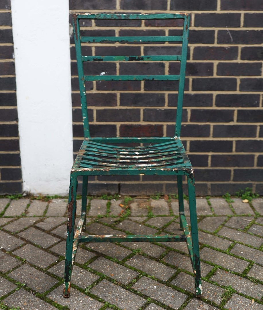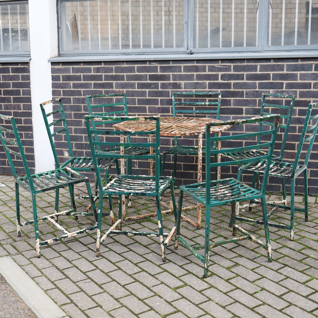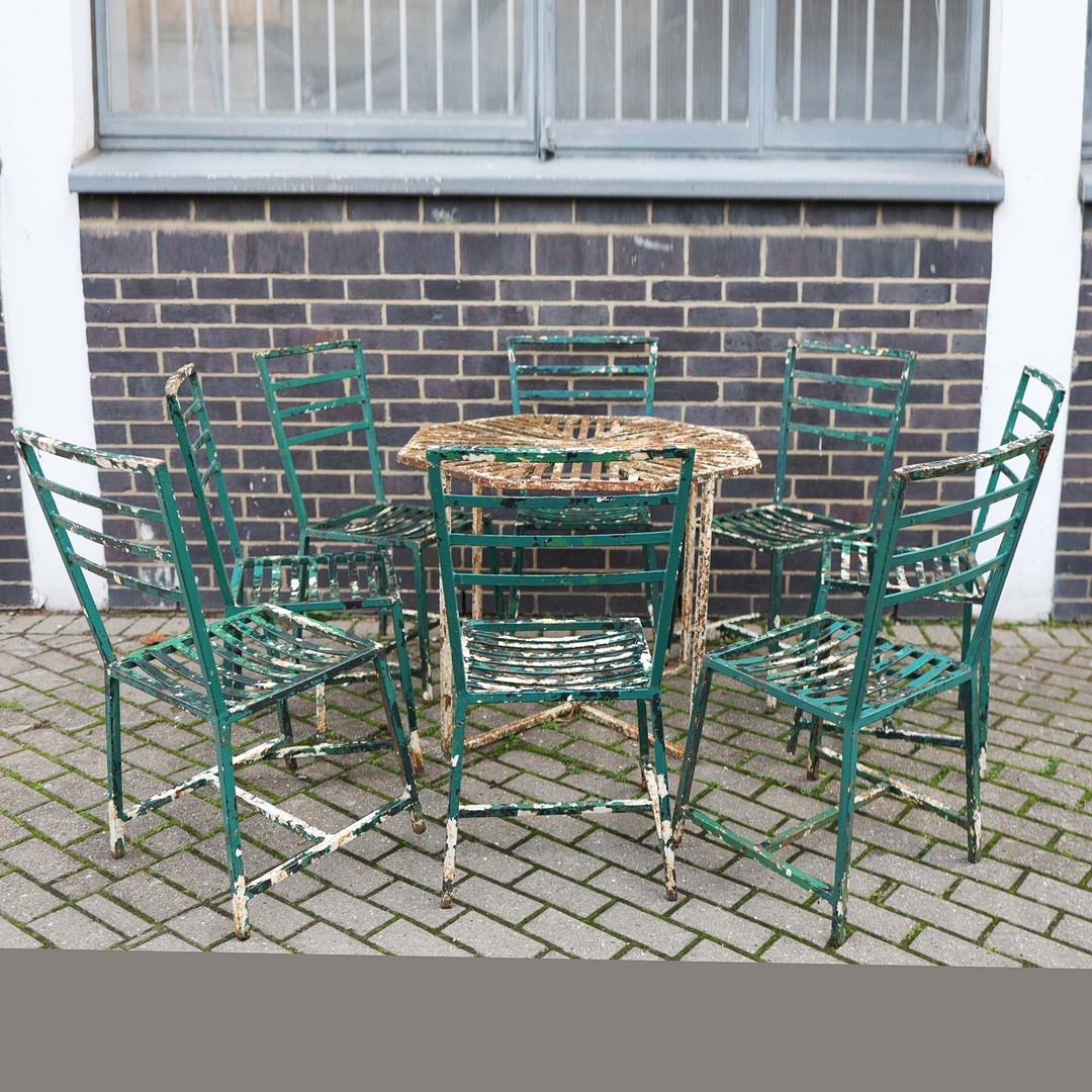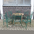 GARDEN DINING SET. (9). including 8 chairs, 91.5cm H approx., and a table, 85.5cm diam. x 71cm H approx. (9).