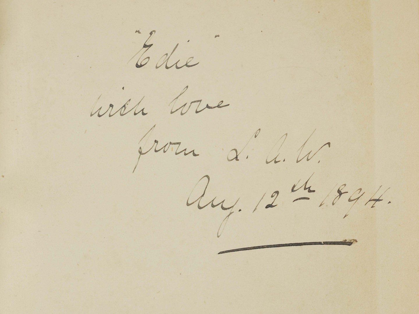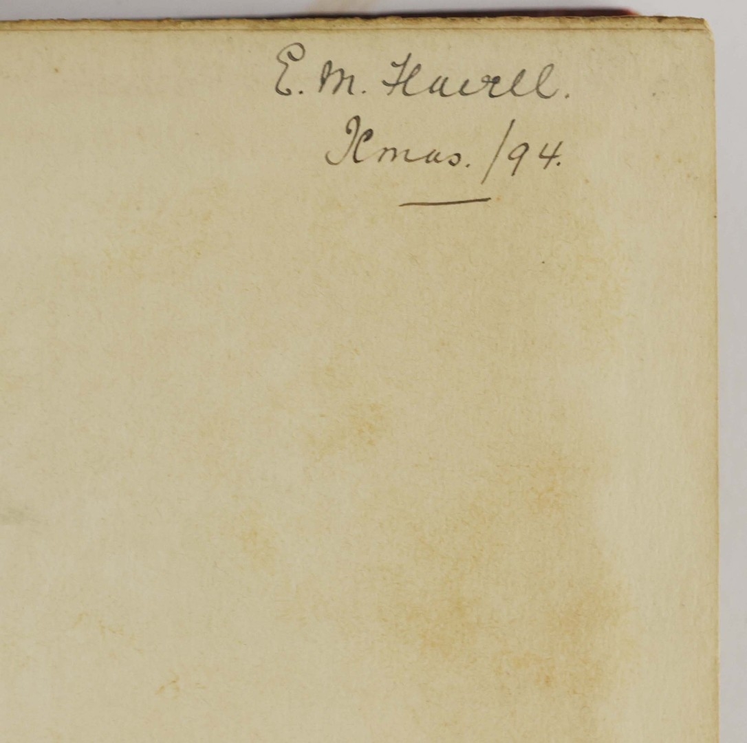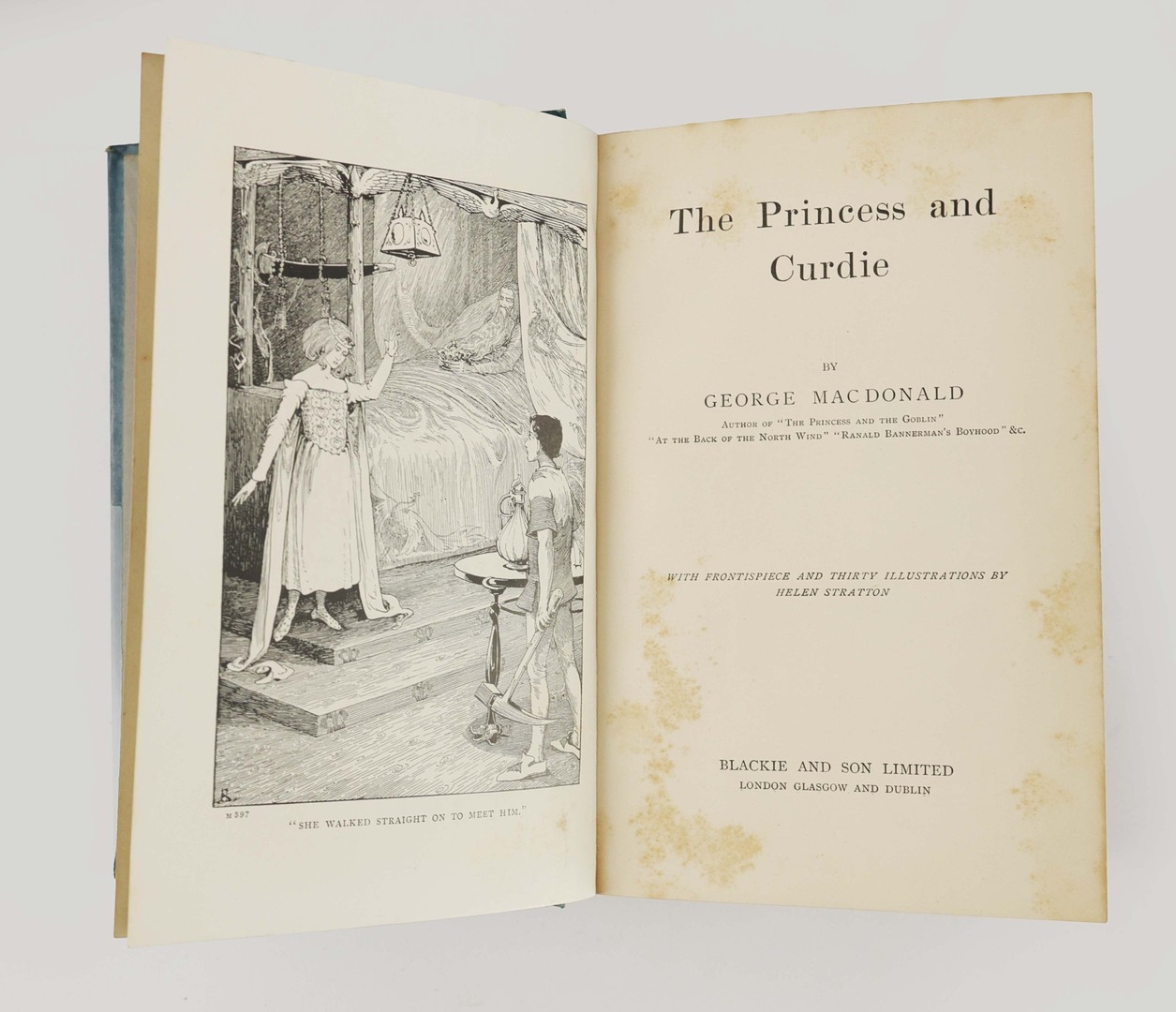 MacDonald, George. The Princess and Curdie, London: Blackie & Son, ca 1890s (undated). Hardcover. Teal cloth; gilt lettering and decoration to spine; brown pictorial decoration to cover. Thirty illustrations and a frontispiece by Helen Stratton. Head and tail bumped. Spine shows some wear. Some light foxing to flyleaves and title page, otherwise bright, clean and clear. Small ownership inscription to front flyleaf, dated 1905.