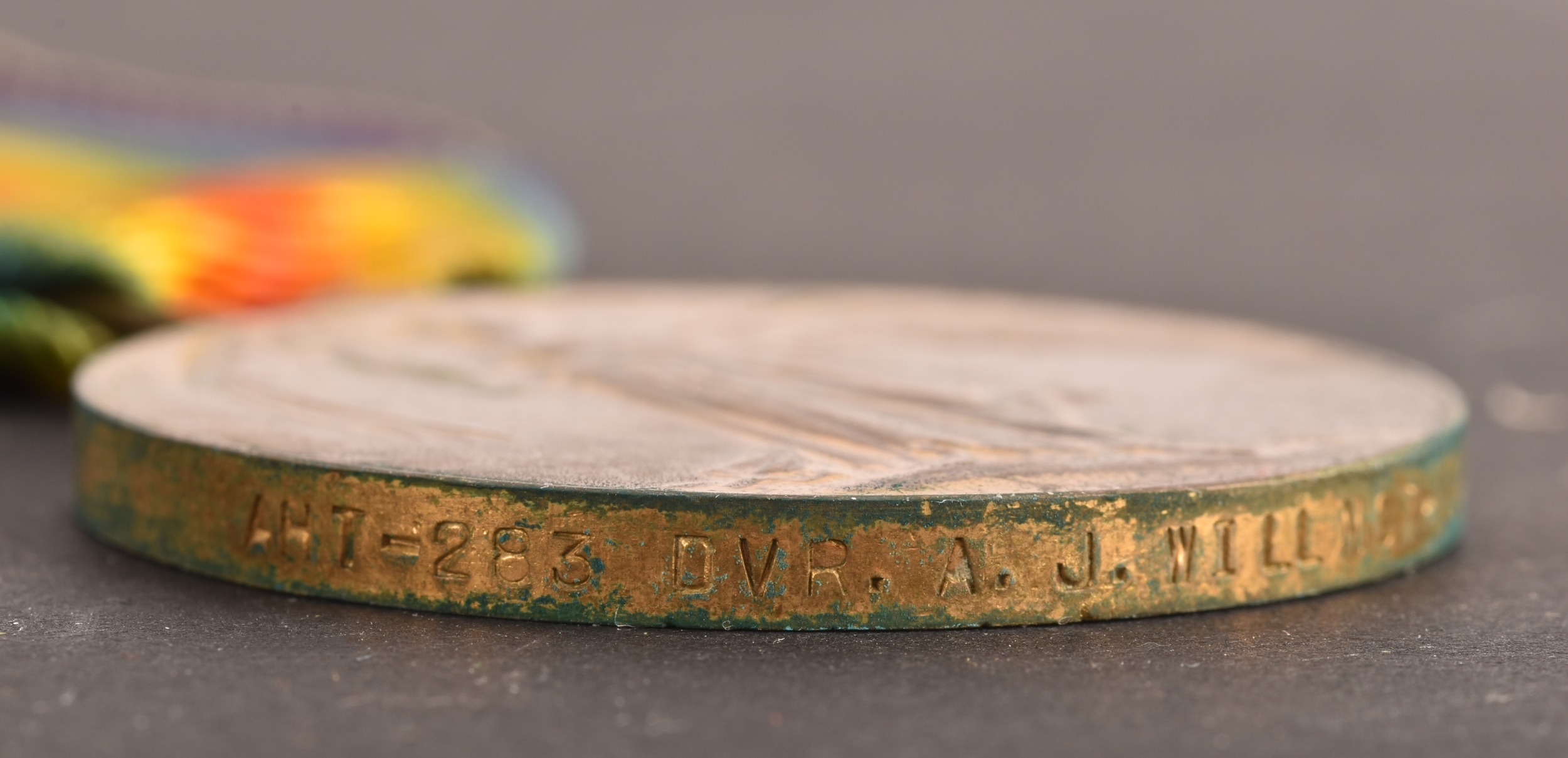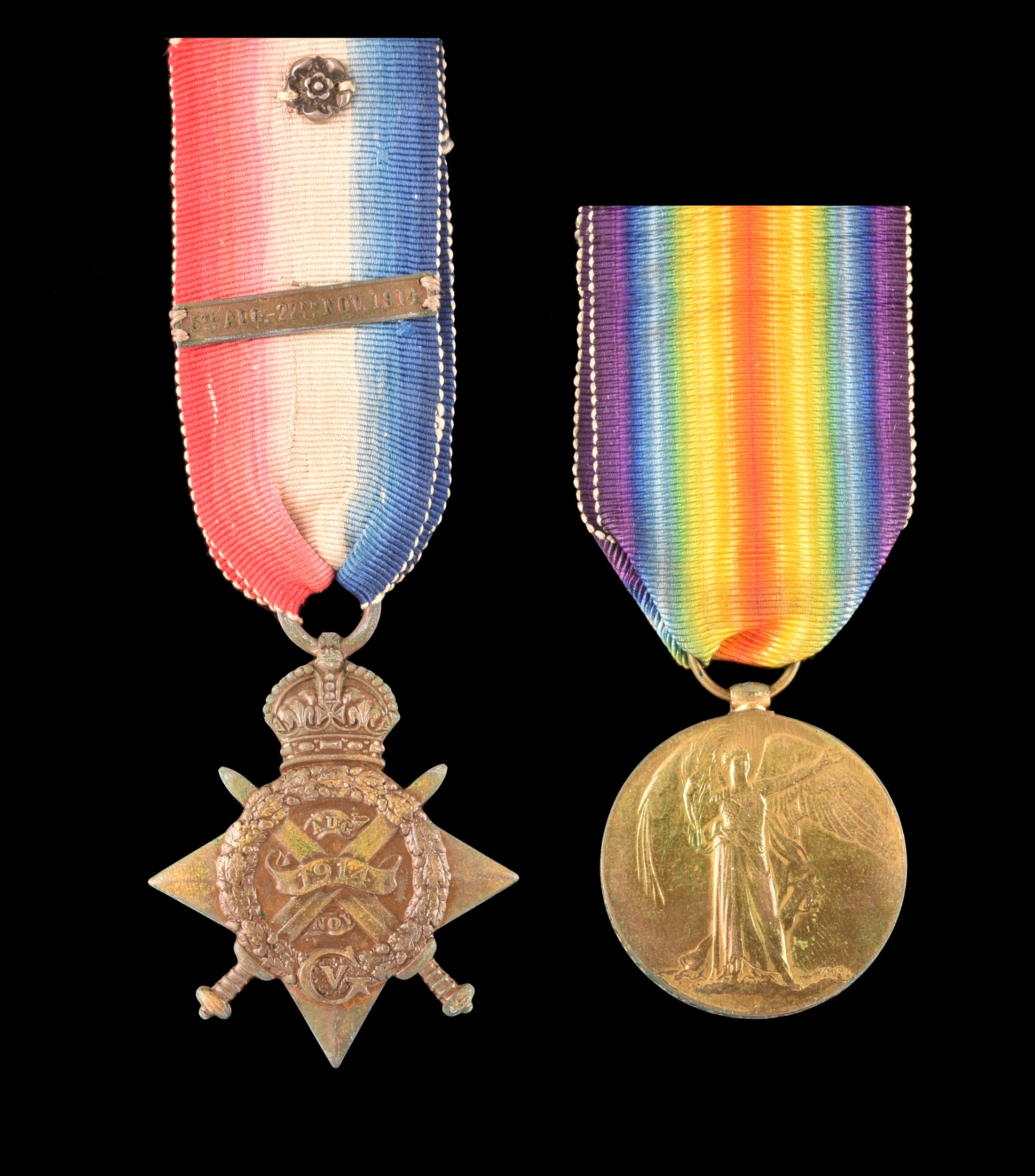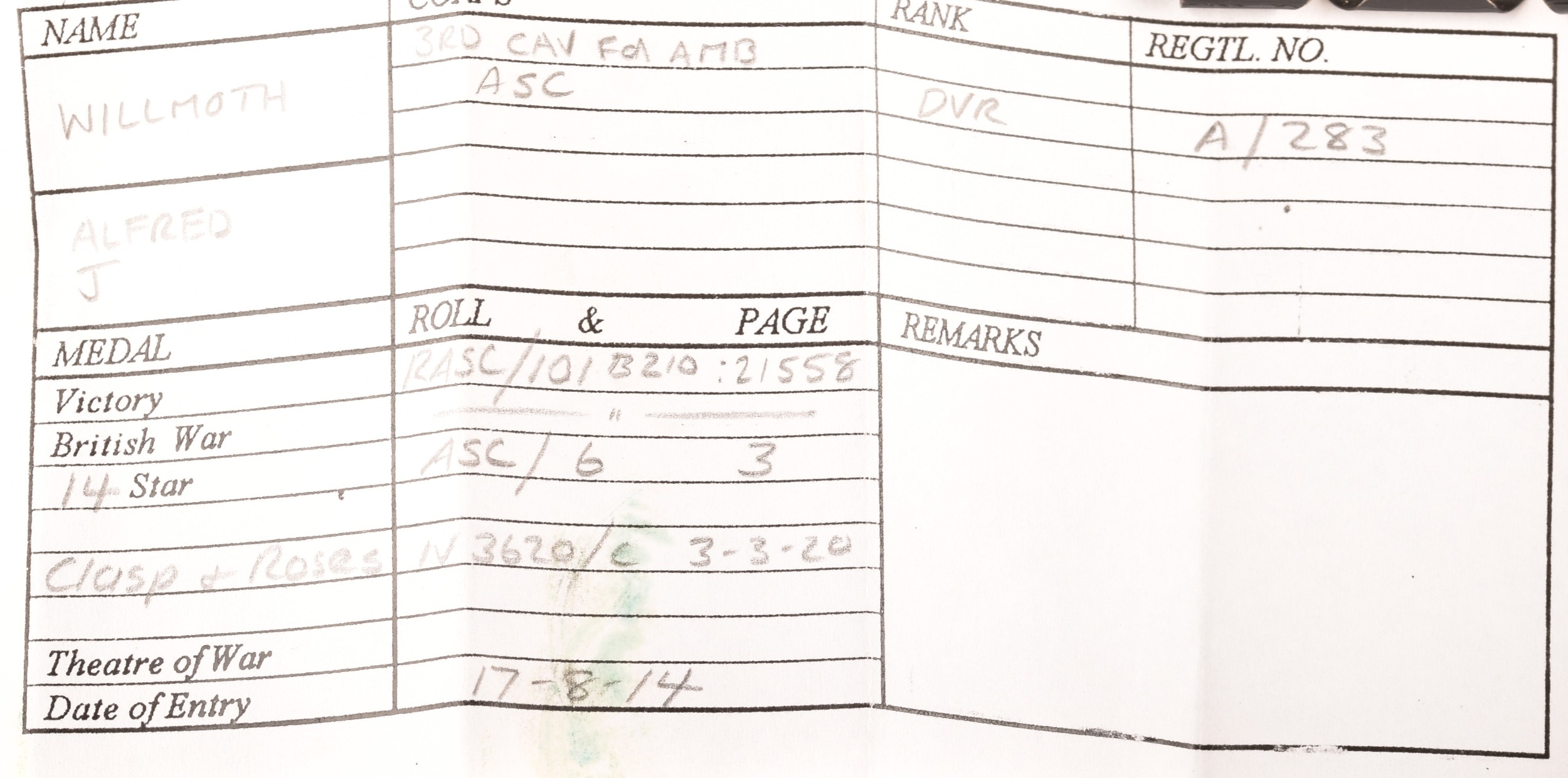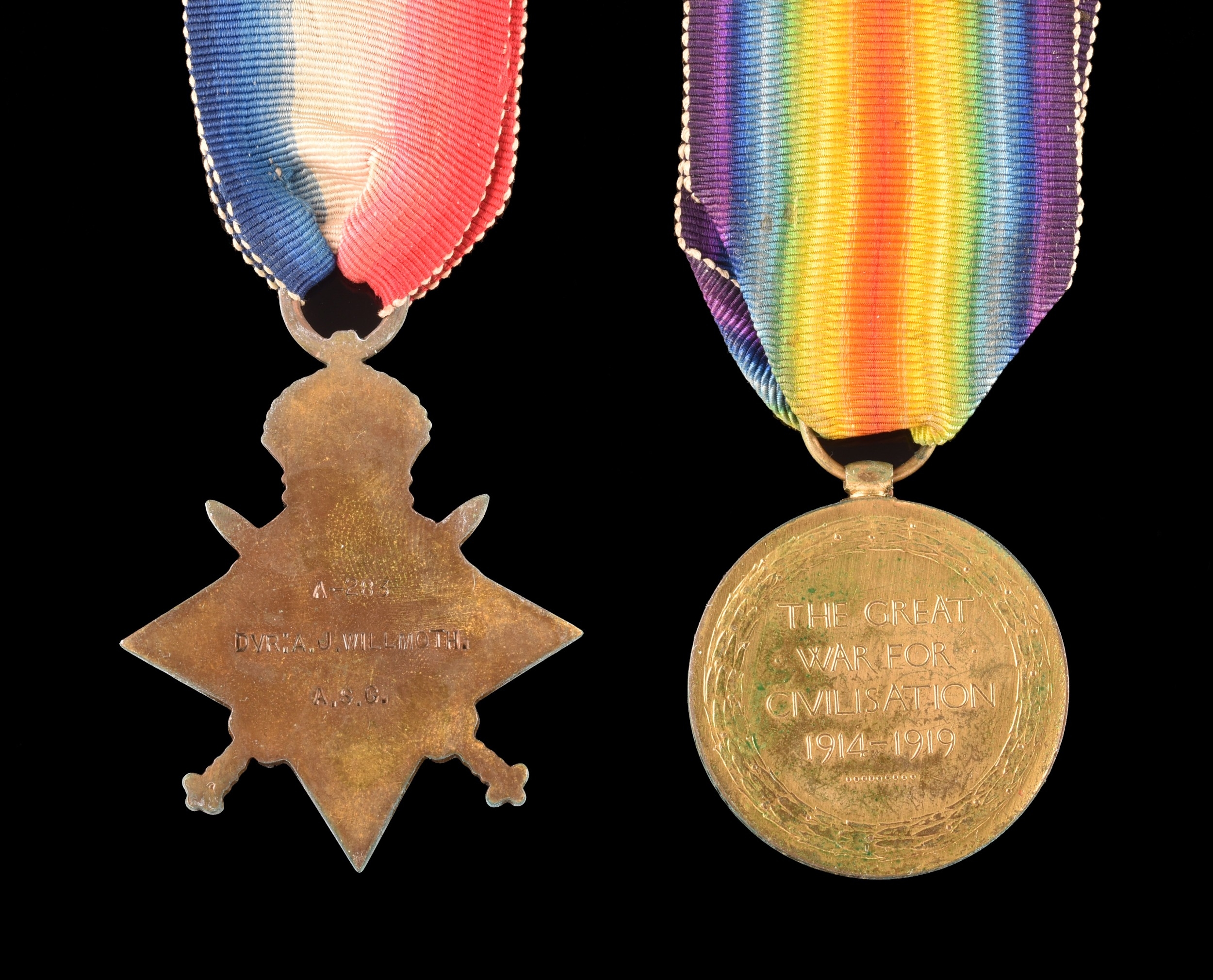 A Great War Medal pair awarded to Driver Alfred J. Willmoth, Army Service Corps, comprising: A 1914 Mons star with 5th Aug - 22nd Nov 1914 clasp and silver rosette (A-283 Dvr: A. J. Willmoth A.S.C.); and The Victory Medal (AHT-283 Dvr: A. J. Willmoth A.S.C.), with medal card.