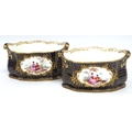 A Pair of Late XIX Century Porcelain Shaped Oval Cache Pots, each with panels of courting couples in shaped cartouches within dark blue and gilt elaborately decorated grounds, 22cm long. (2)