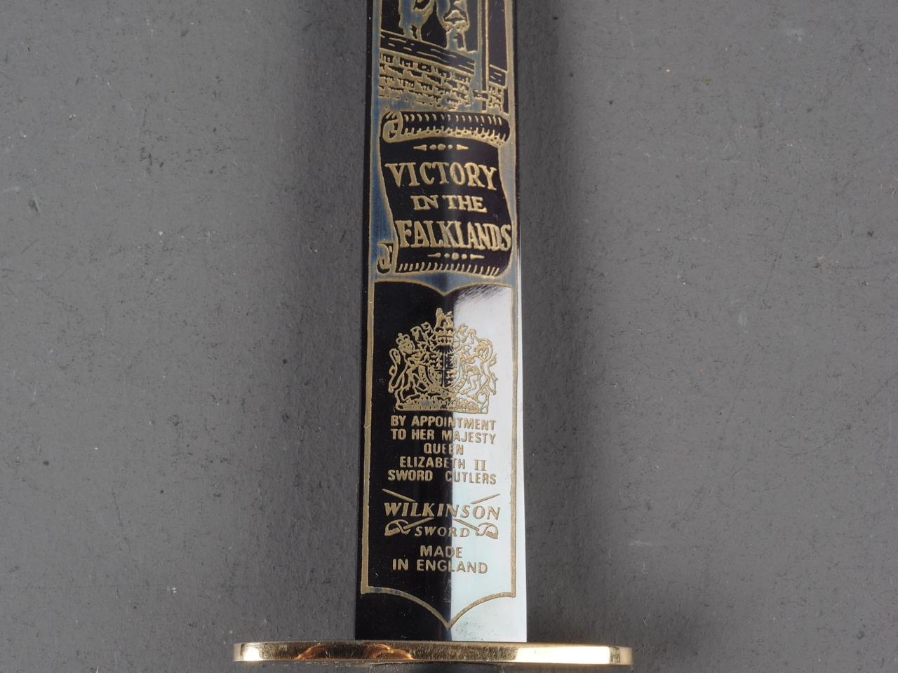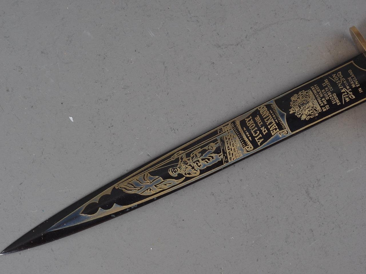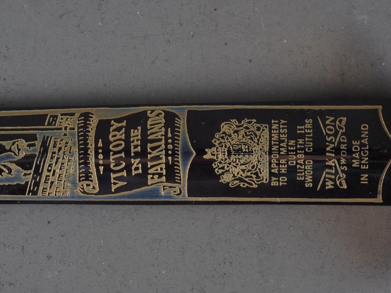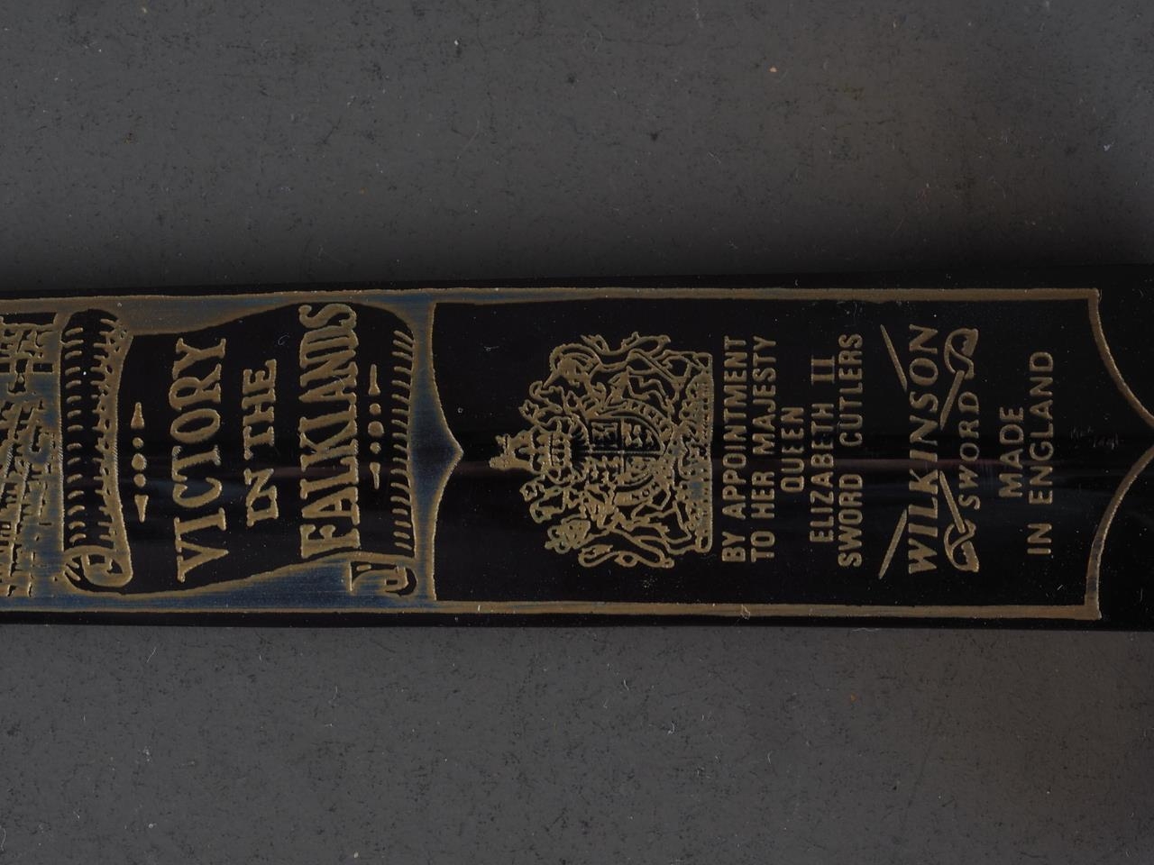 A Wilkinson Sword "Victory in the Falklands" commemorative Fairbairn-Sykes Commando fighting knife with black grip, and blade (as made by Wilkinson Sword in very short time for the night time start of the battle of Goose Green 28-29 May 1982) and numbered No 690, 11" long overall
