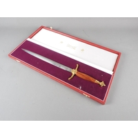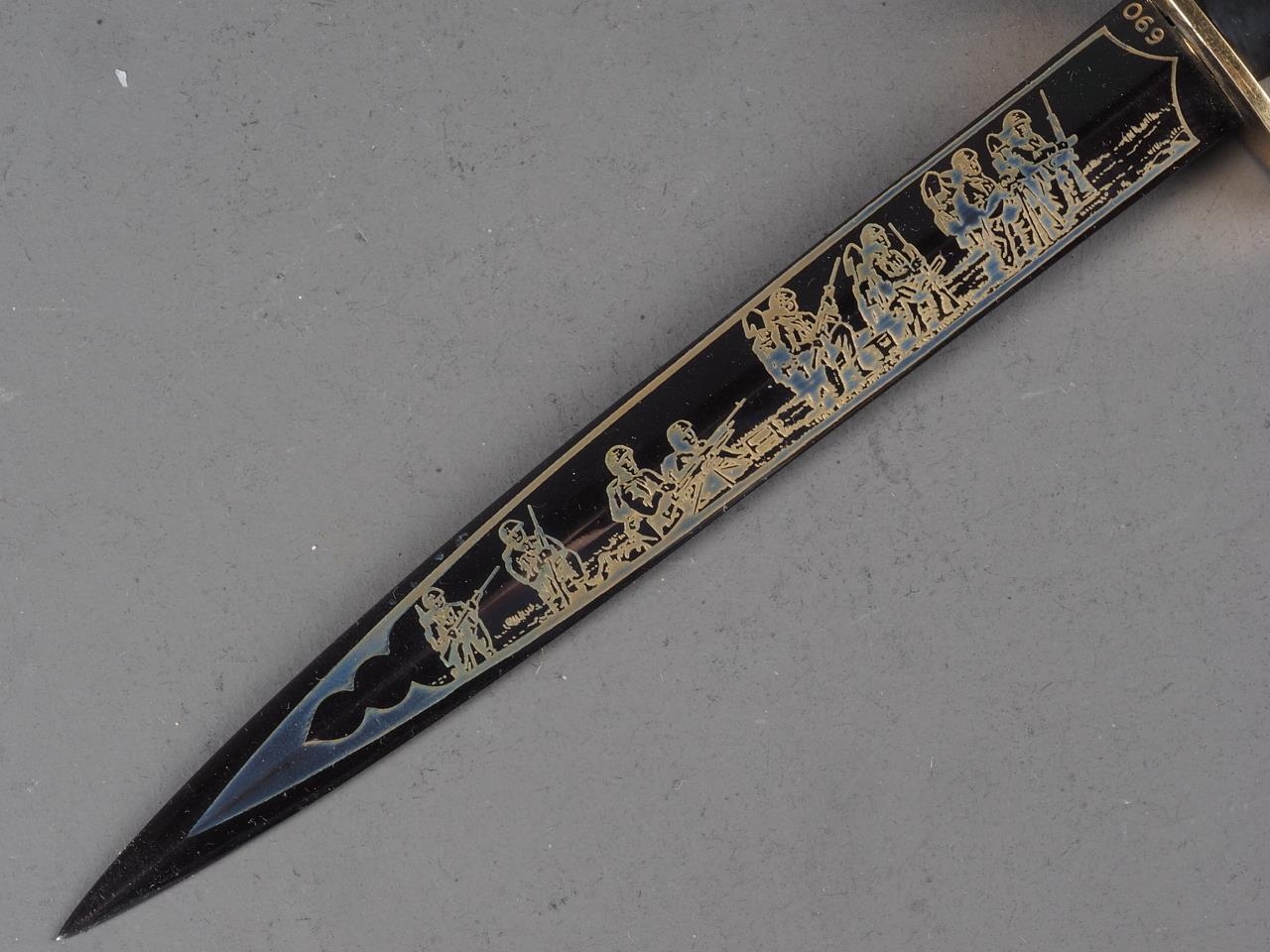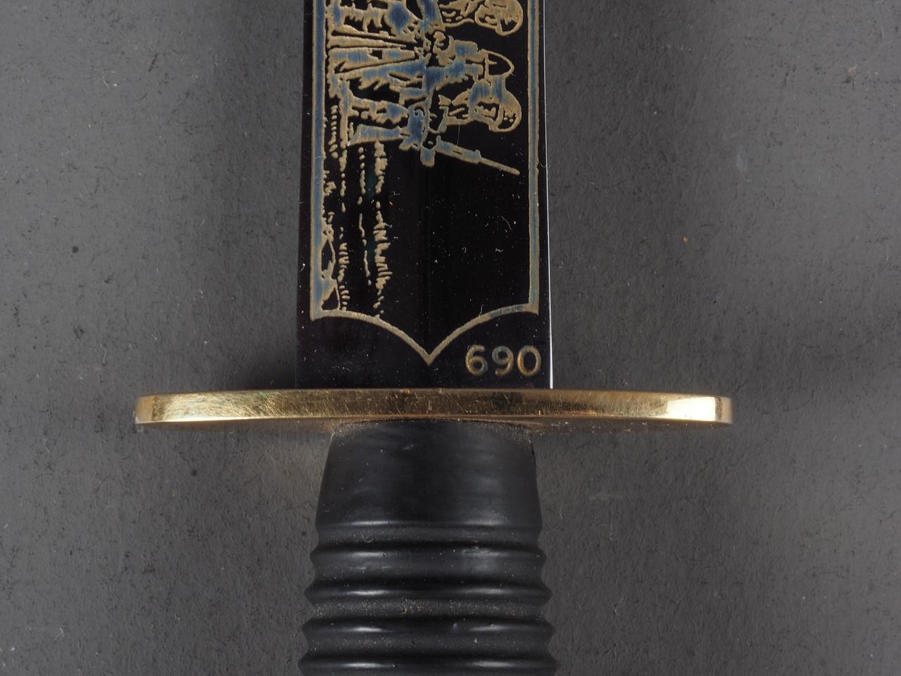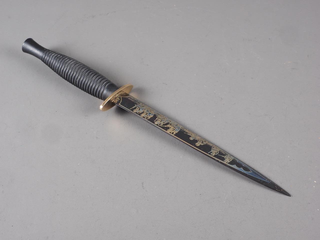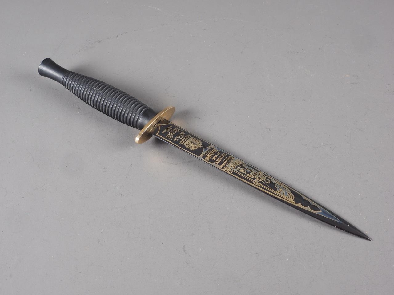 A Wilkinson Sword "Victory in the Falklands" commemorative Fairbairn-Sykes Commando fighting knife with black grip, and blade (as made by Wilkinson Sword in very short time for the night time start of the battle of Goose Green 28-29 May 1982) and numbered No 690, 11" long overall