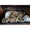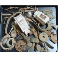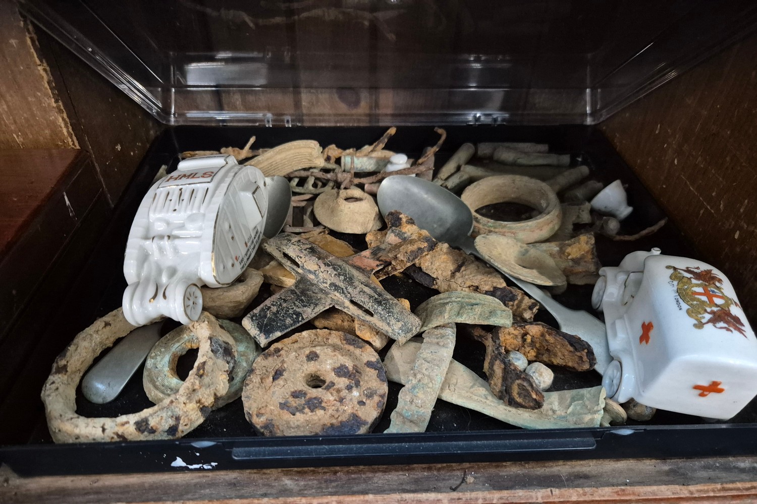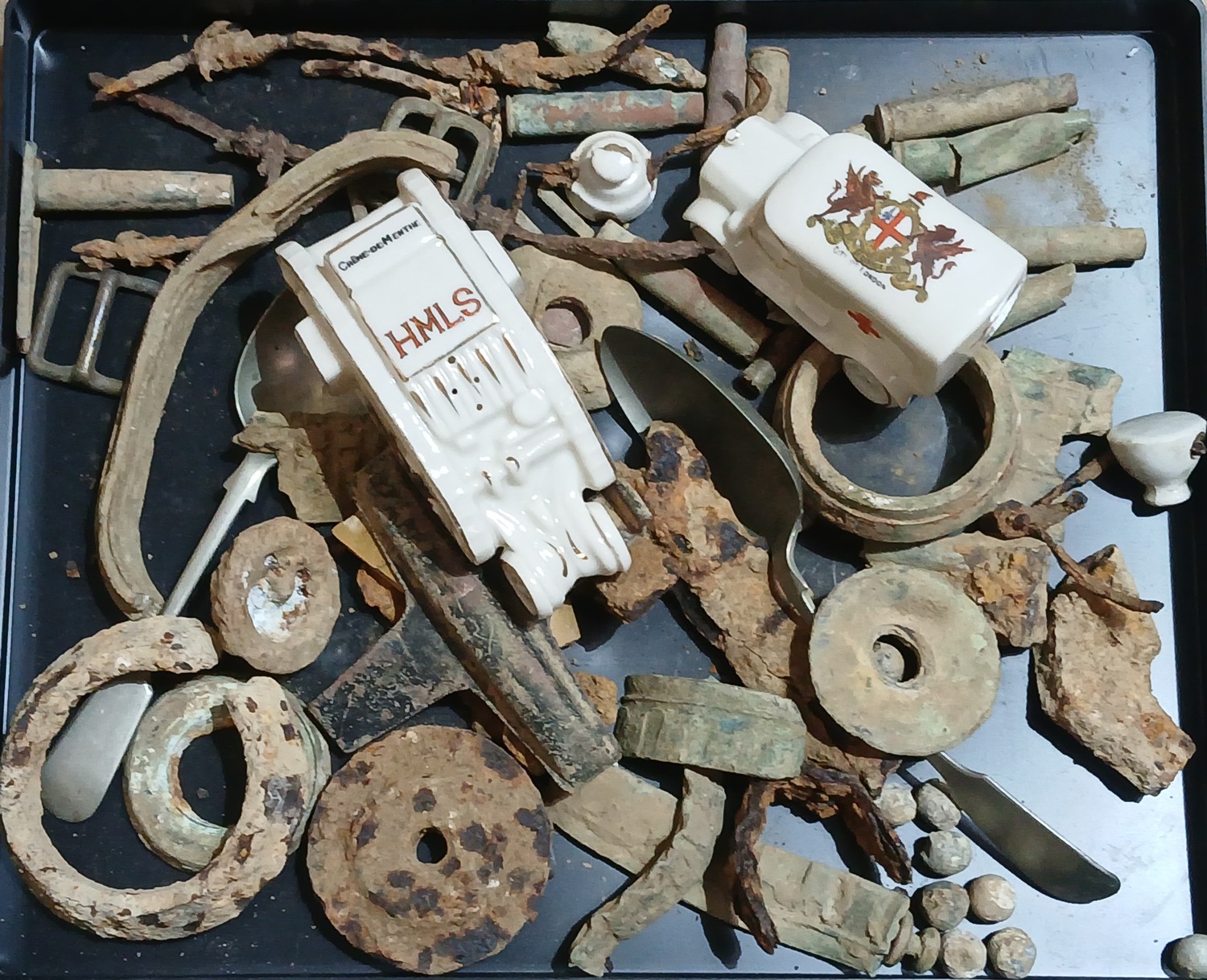 A tray of assorted Somme metal detector finds together with two crested ware vehicles.