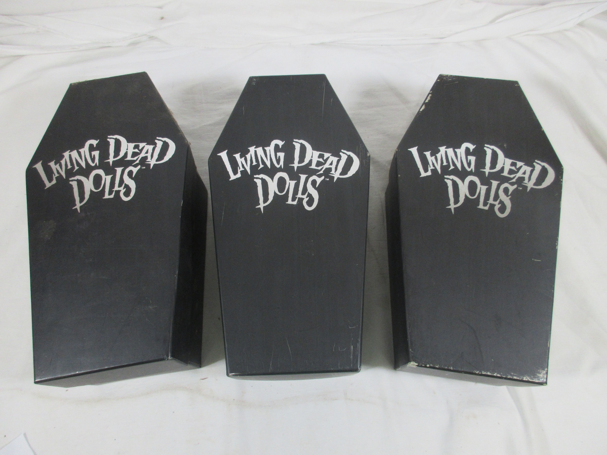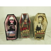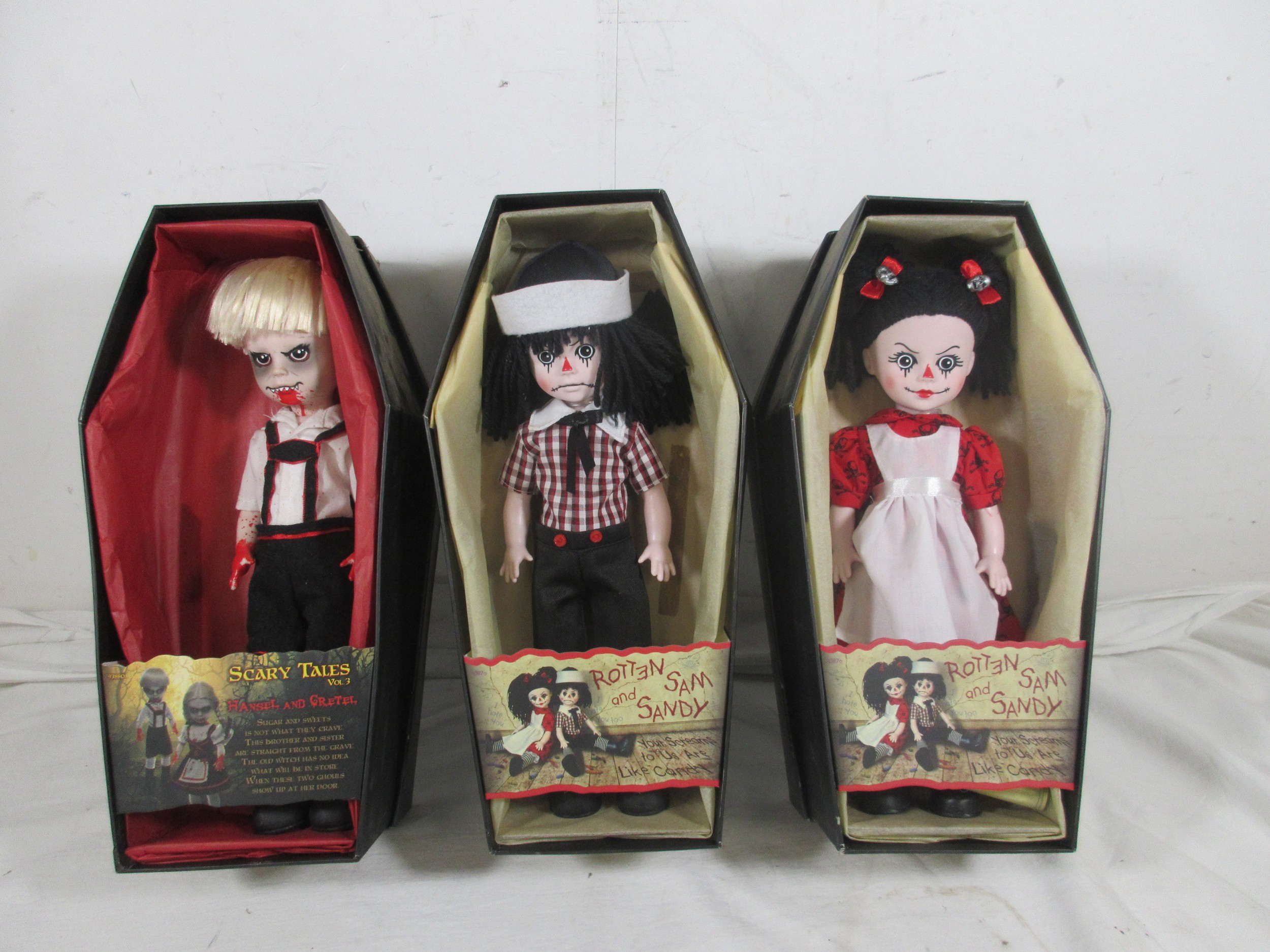 3 Mezco Living Dead Dolls comprising Scary Tales Vol 3 93880 Hansel, 93871 & 93872 Rotten Sam & Candy. All in original boxes, boxes have some dust and storage wear, all figures in apparent good order