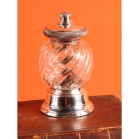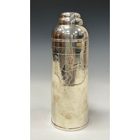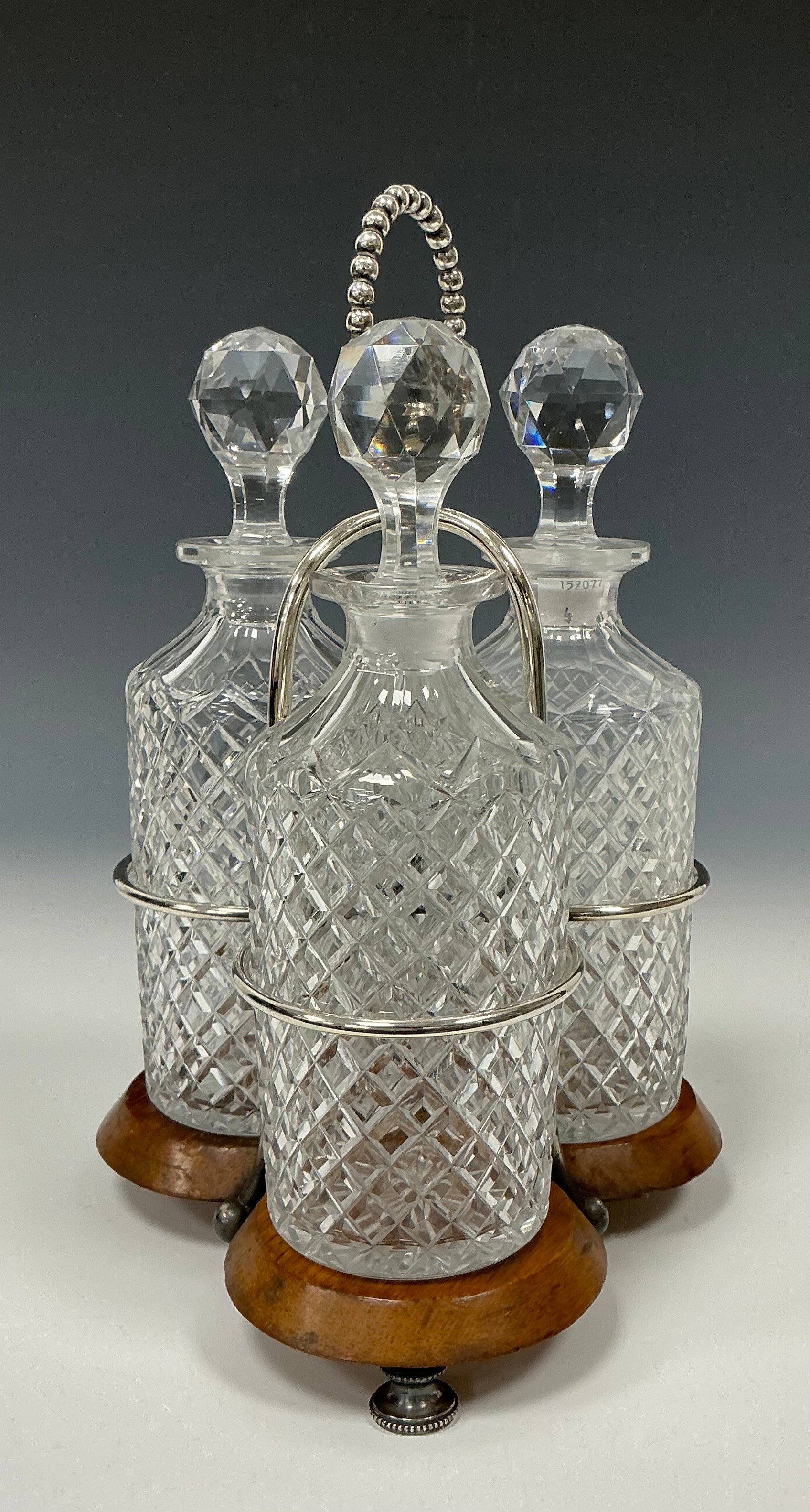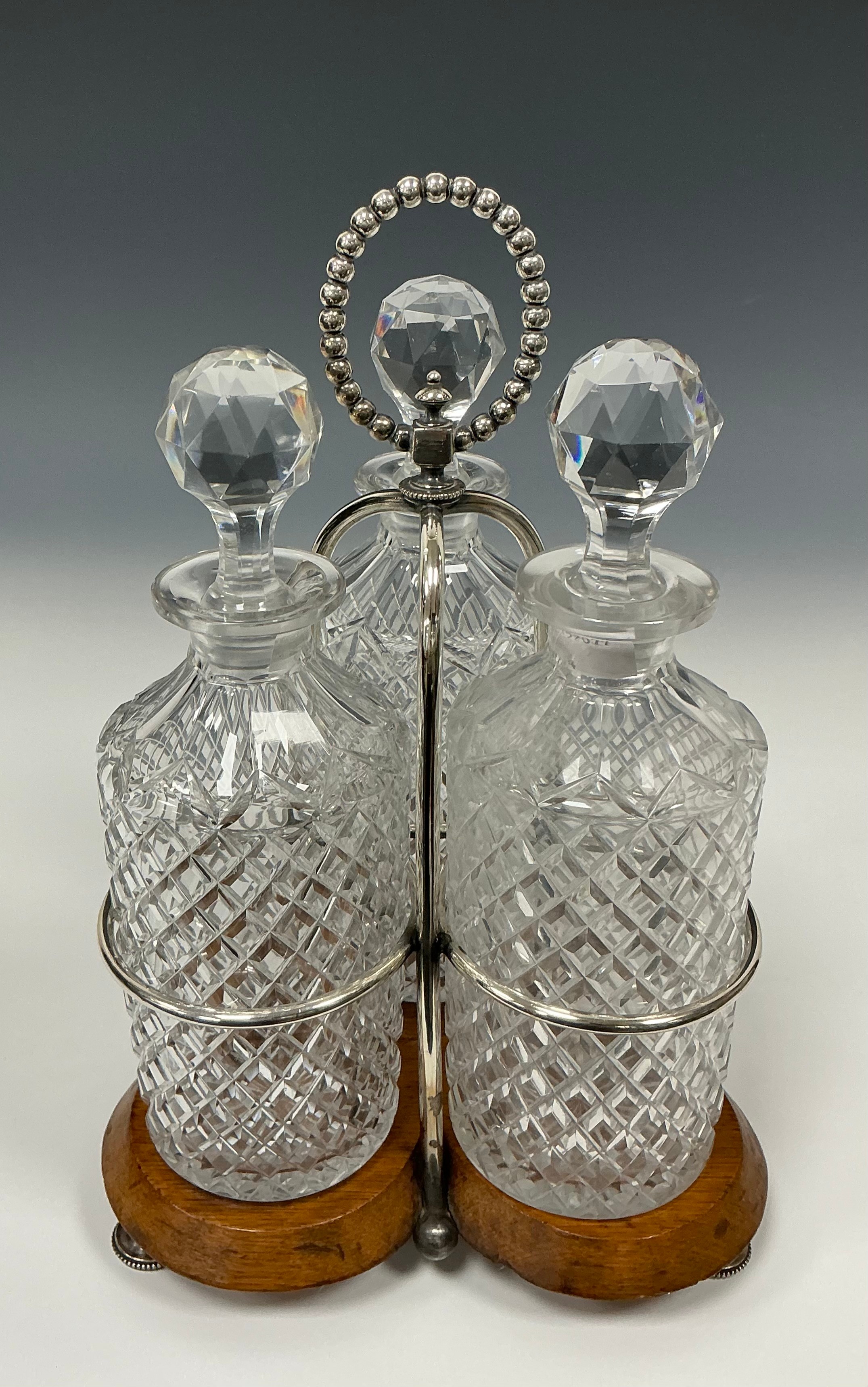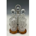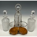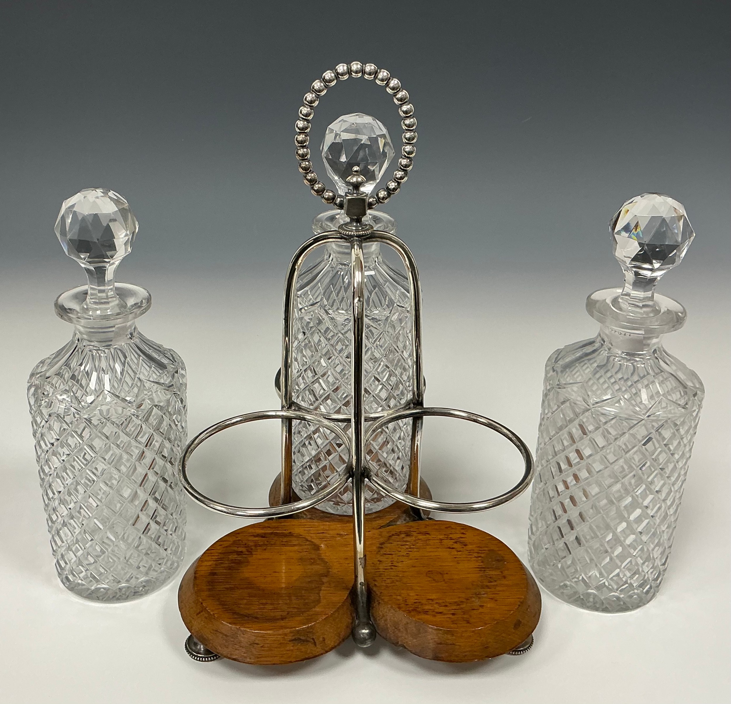 An Edwardian oak and silver plated three bottle stand, with glass decanters, beaded looping handle, trefoil oak base, 30cm high
