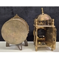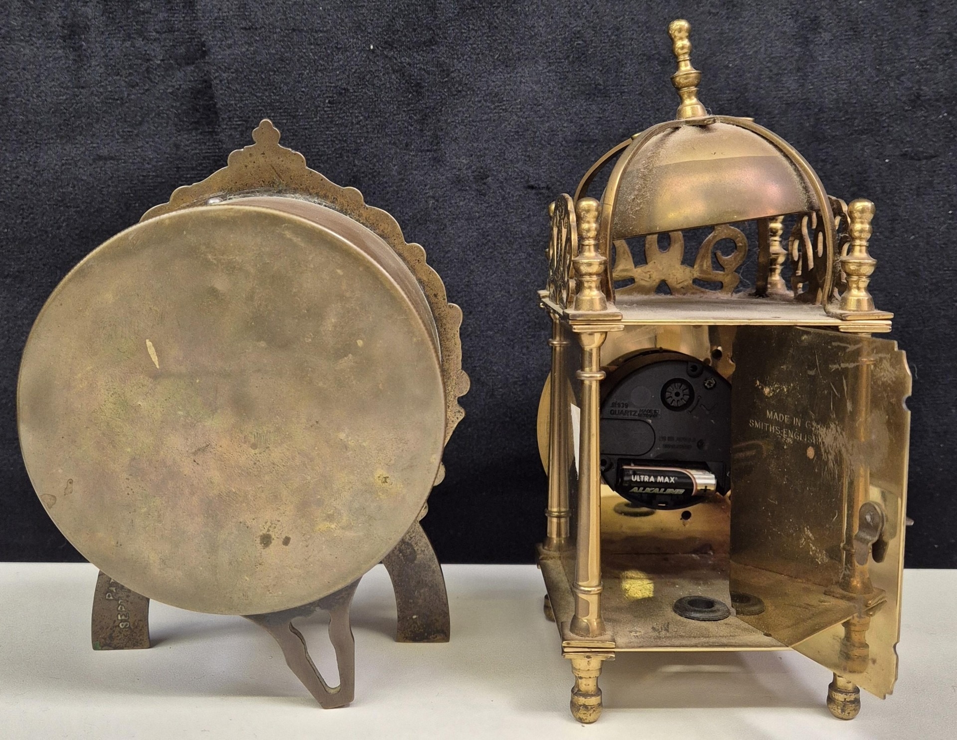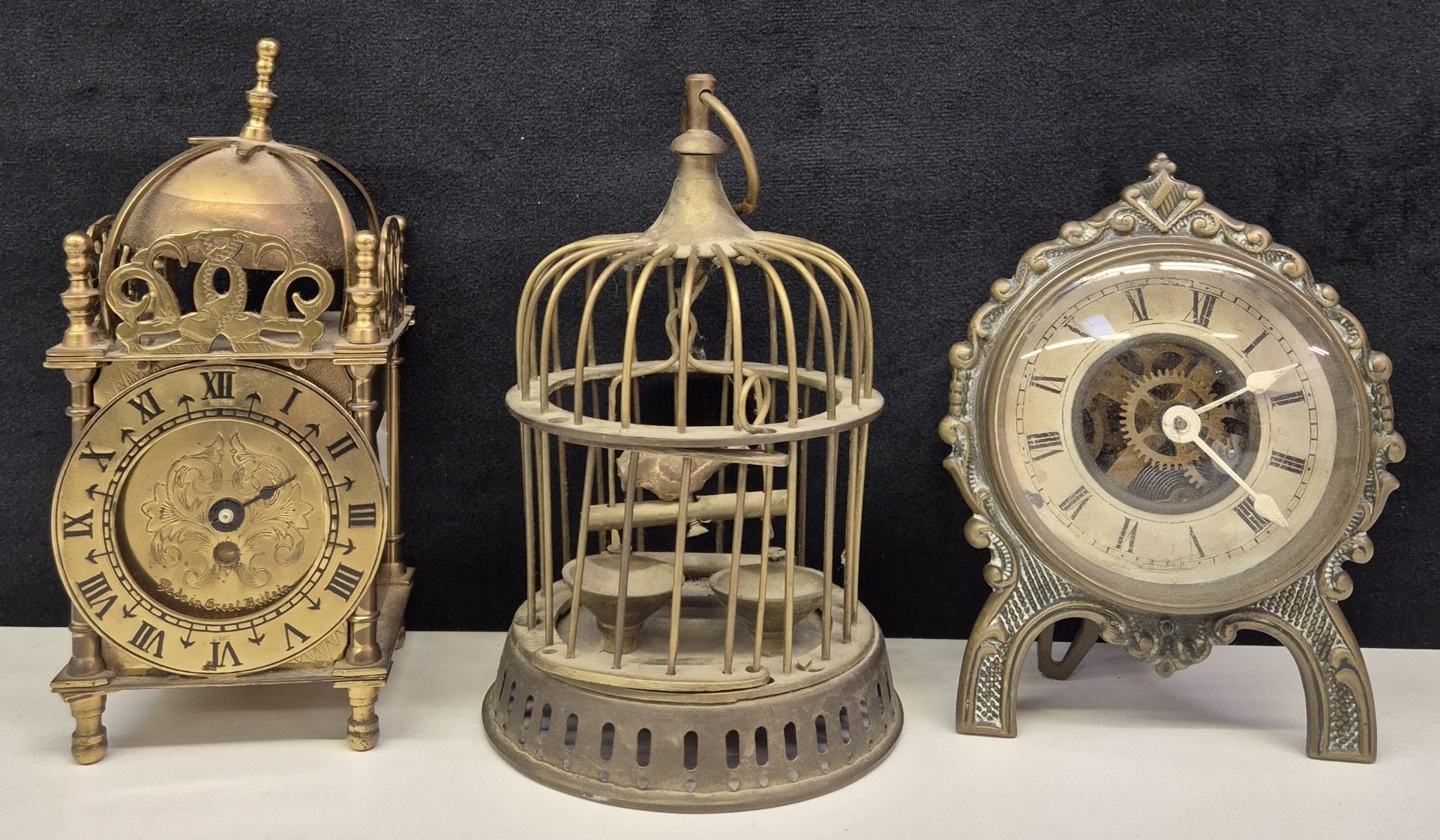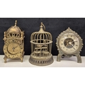 Mantel clock, lantern clock & decorative brass display birdcage. Tallest 17cm.